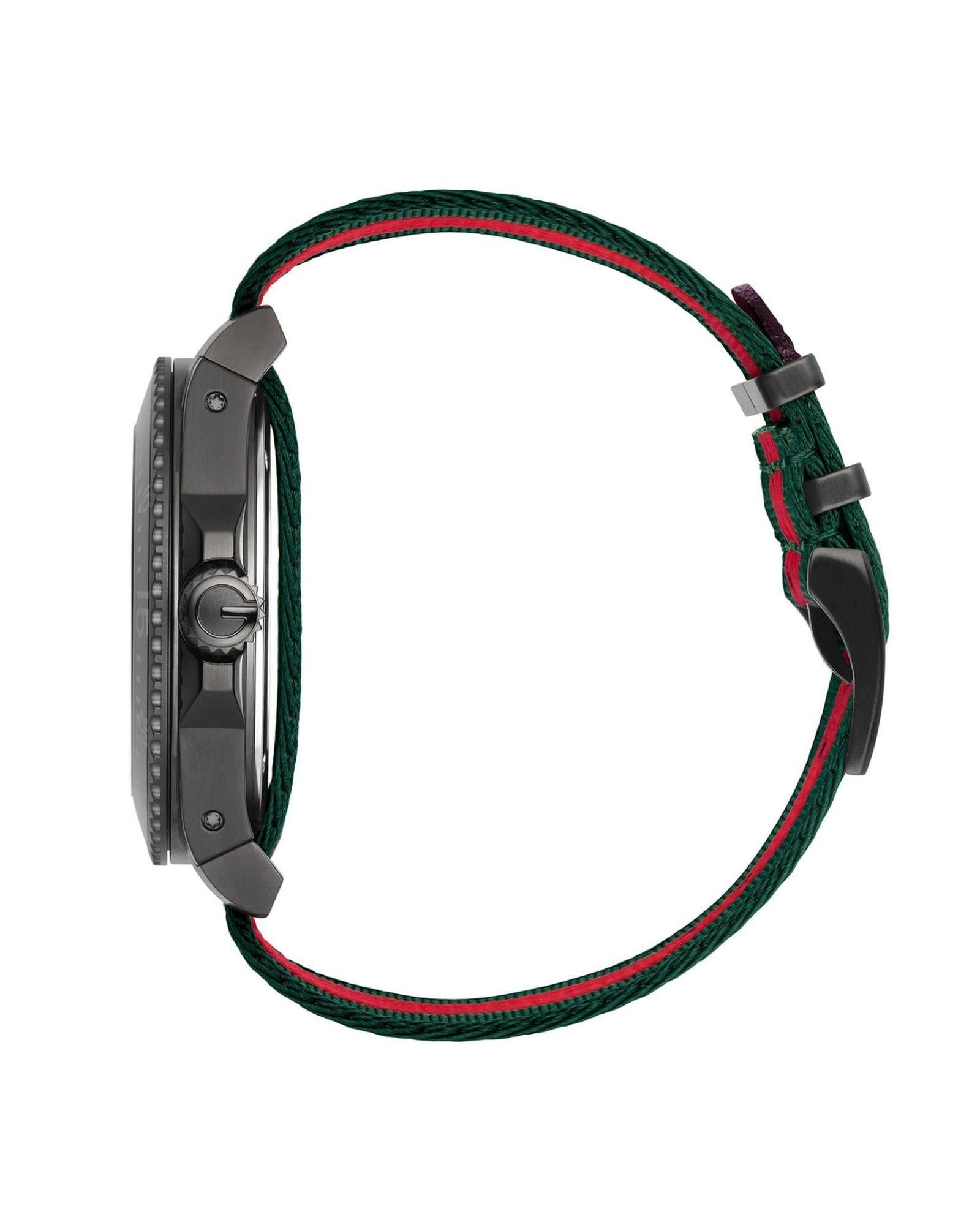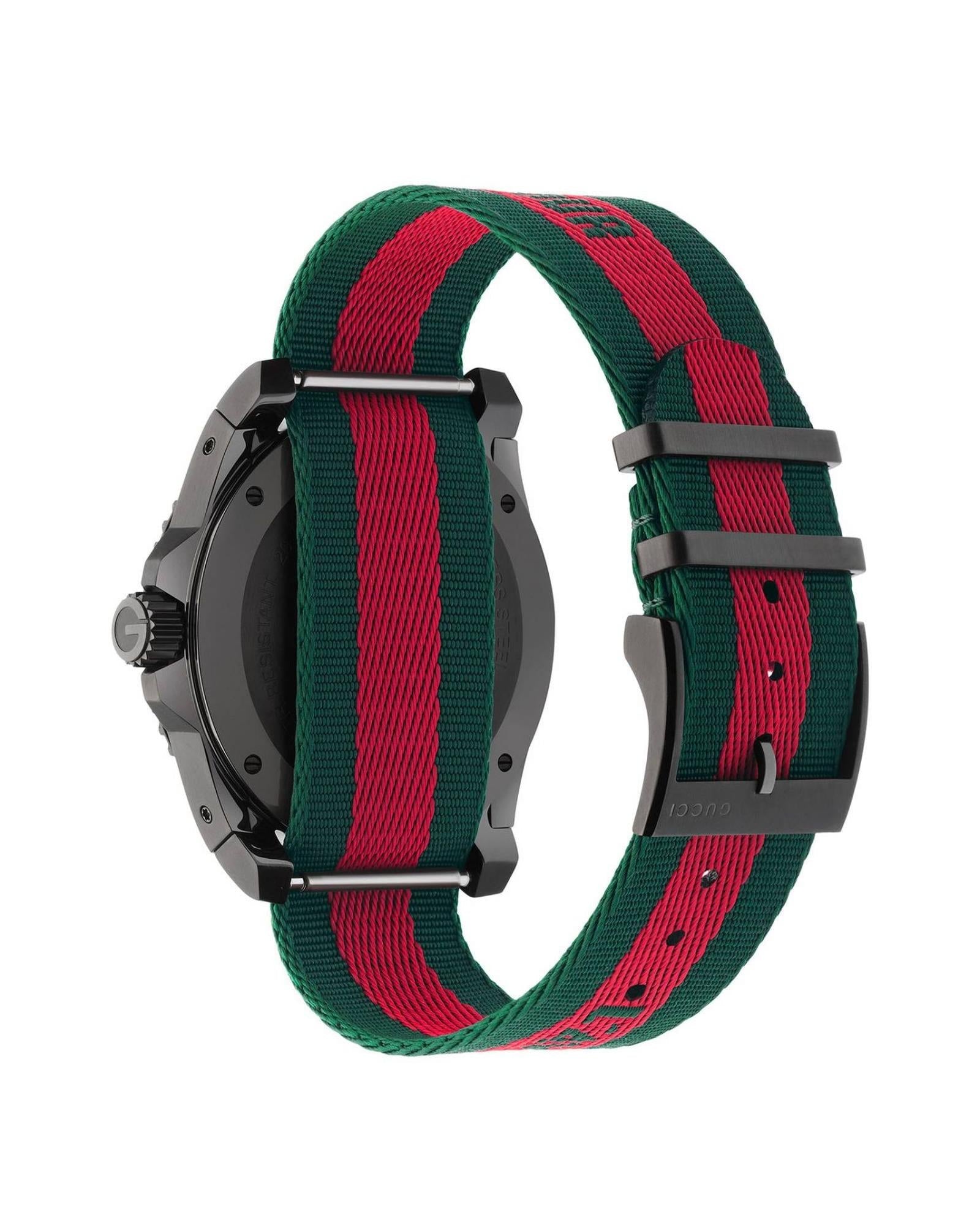The watch features a black ceramic case a green and red web striped fabric strap with Gucci logo and a dial with bee embroidery. The bee is embroidered in gold thread on the watch face.
