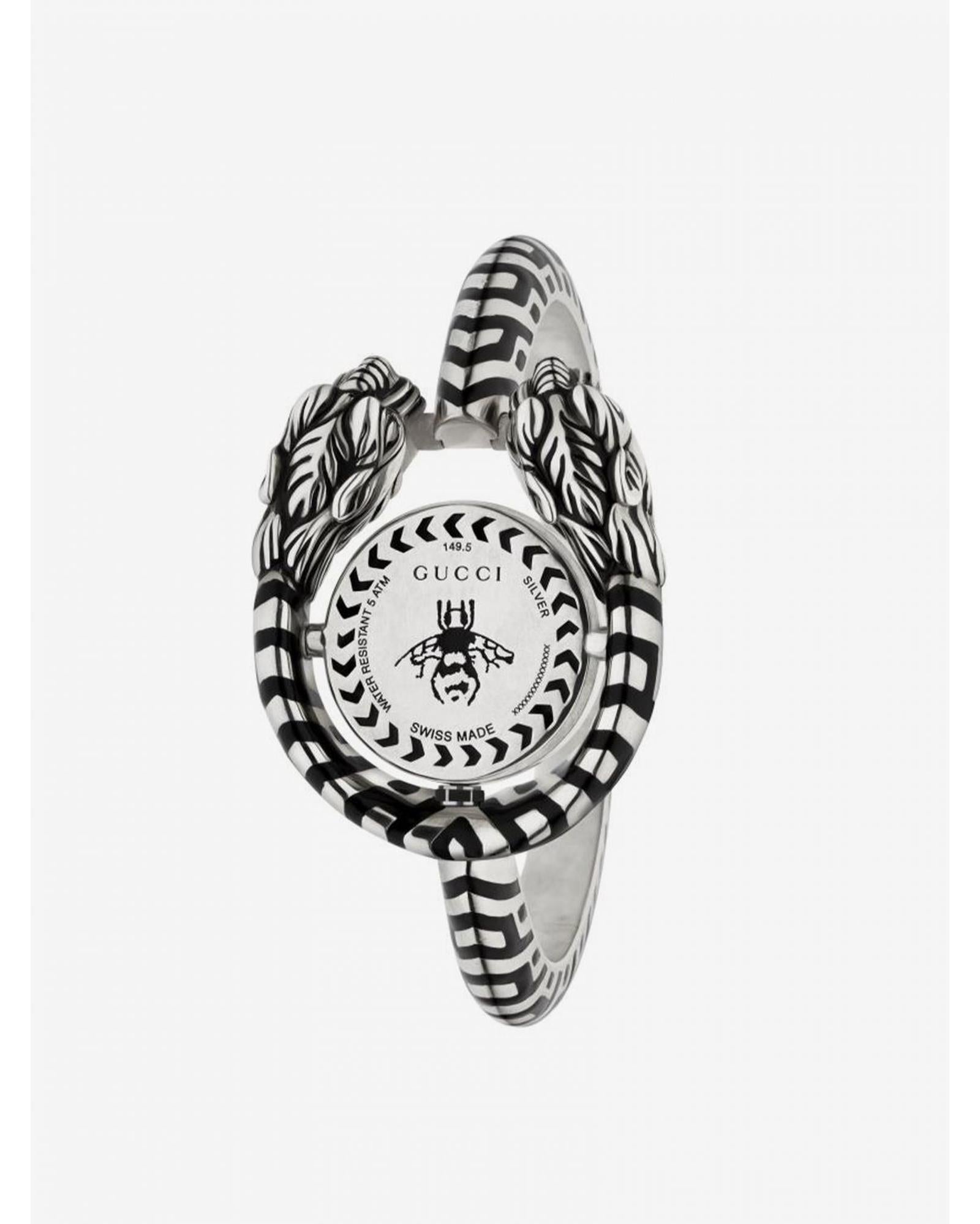 This stylish and elegant Gucci Tiger Head Bracelet Watch is perfect for any occasion The watch features a round motherofpearl dial with black Roman numerals a stainless steel case and a unique enamel bracelet with a tiger head design The watch is Swiss made and water resistant to 30 meters. Mother of pearl dial Stainless steel case Enamel bracelet with tiger head design Swiss made Water resistant to 30 meters .