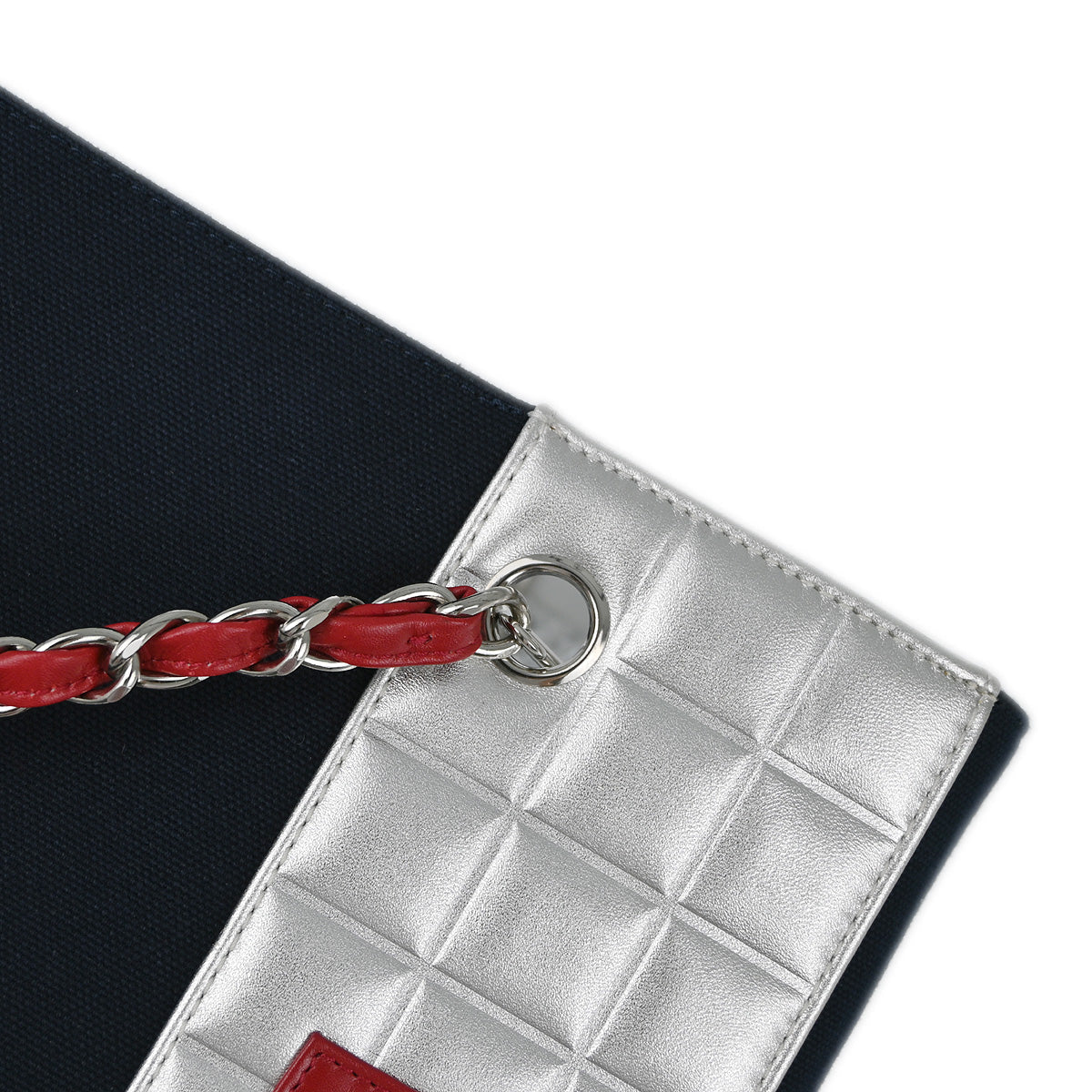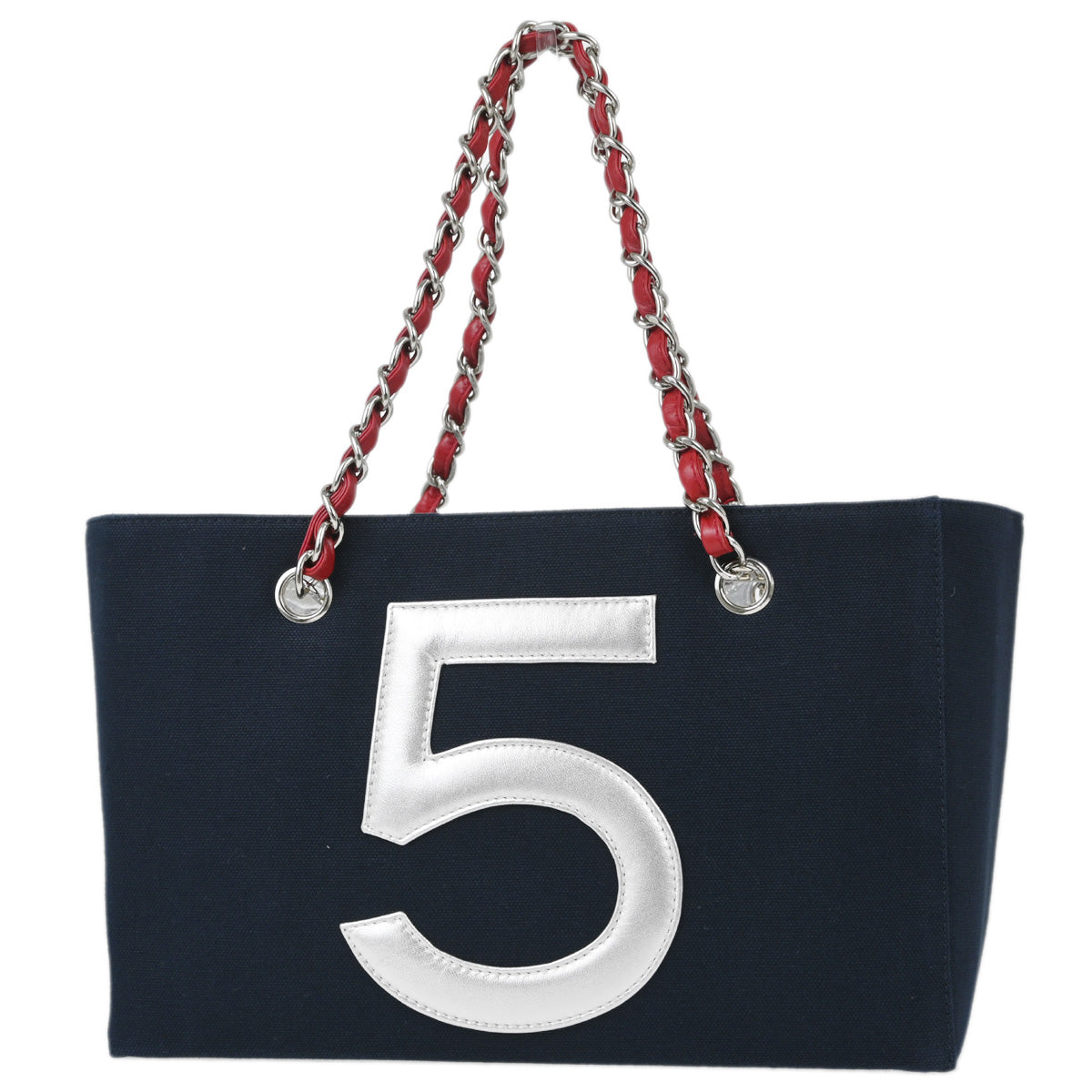 | Chanel Navy Silver Canvas No.5 Choco Bar Tote Handbag | |