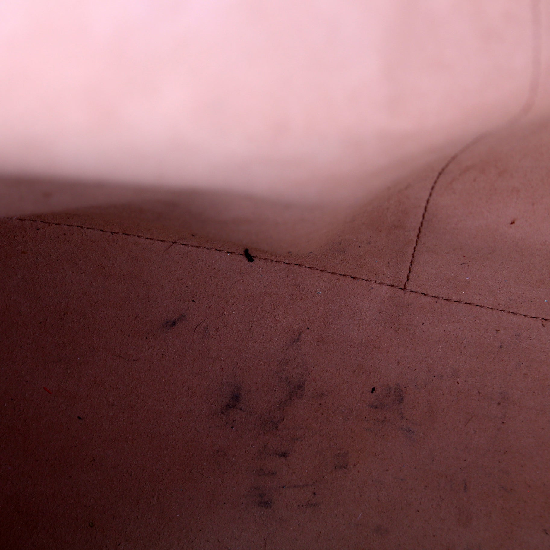 Interior: The interior shows heavy staining throughout. The interior features one removable zip pouch. The pouch shows light wear.