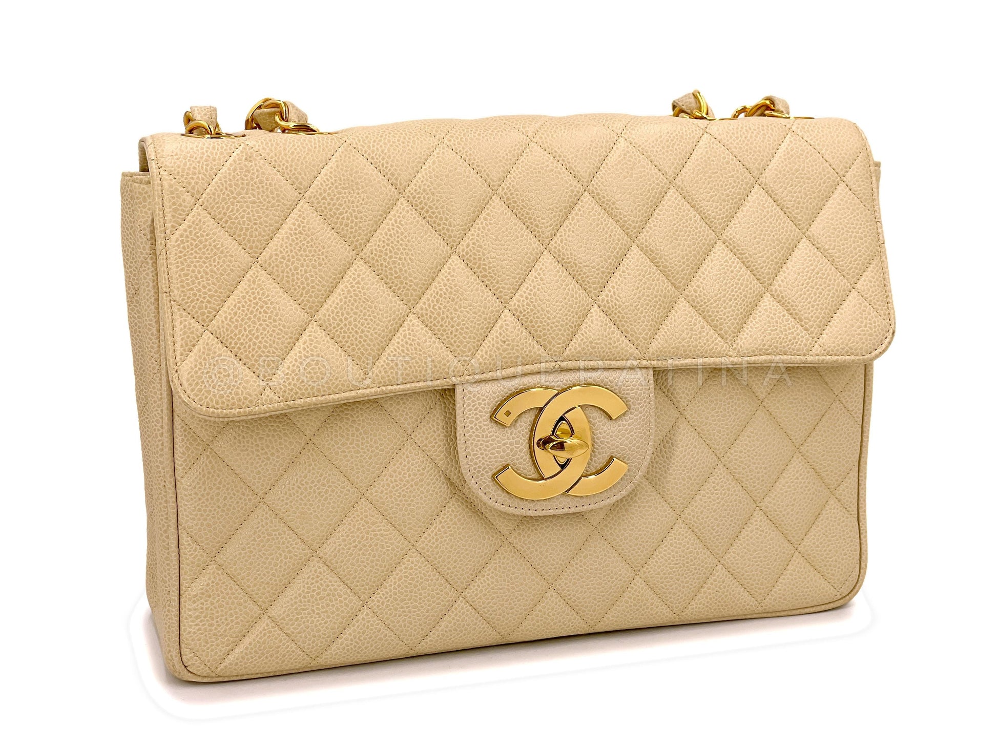 Chanel 1994 Vintage Light Beige Caviar Jumbo Classic Flap Bag 24k GHW