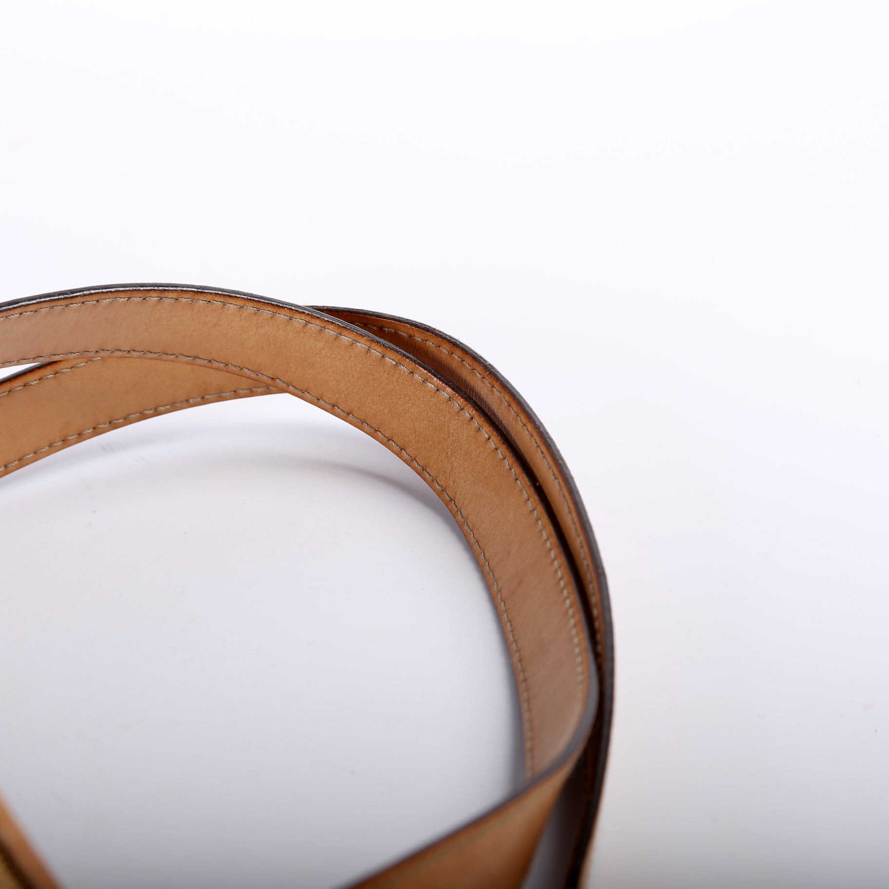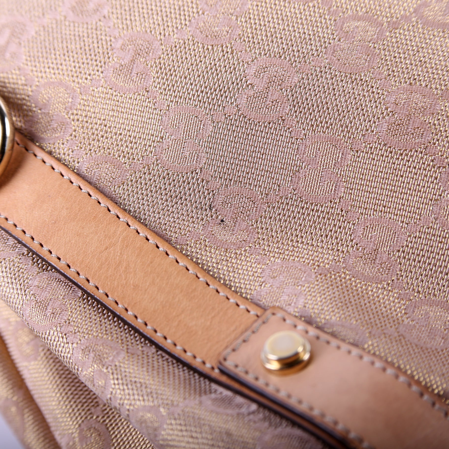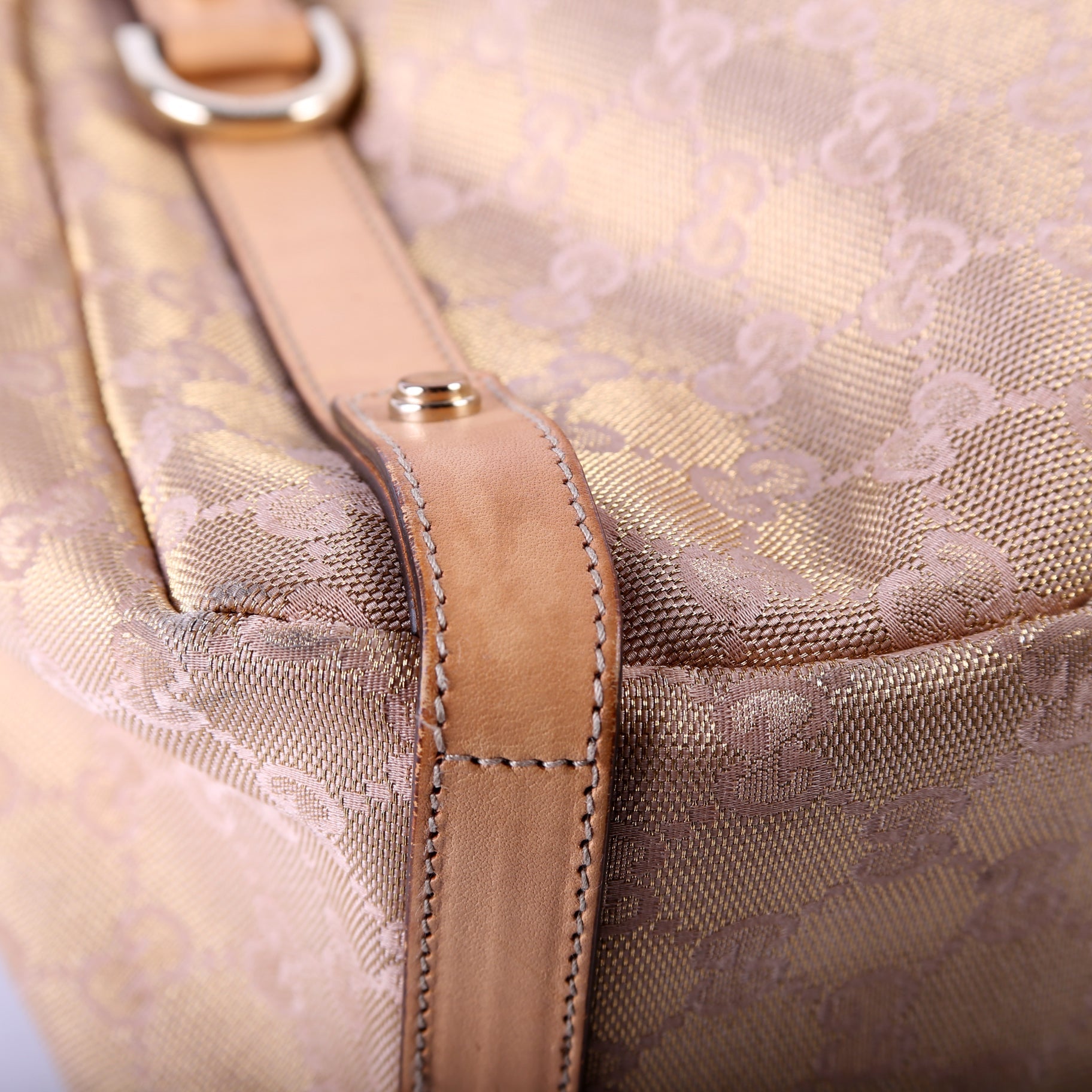 Handle: The leather handles show wear and discoloration.