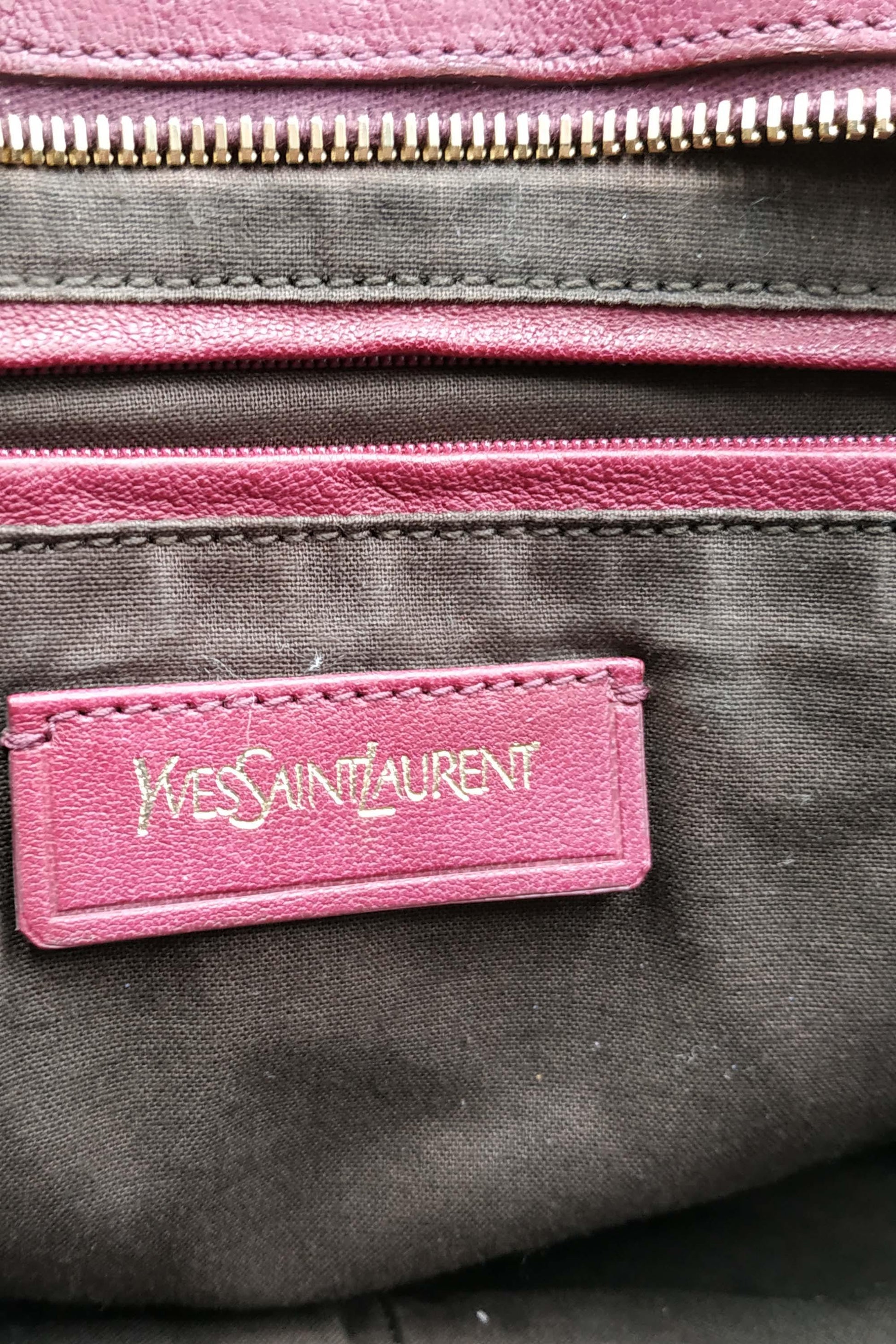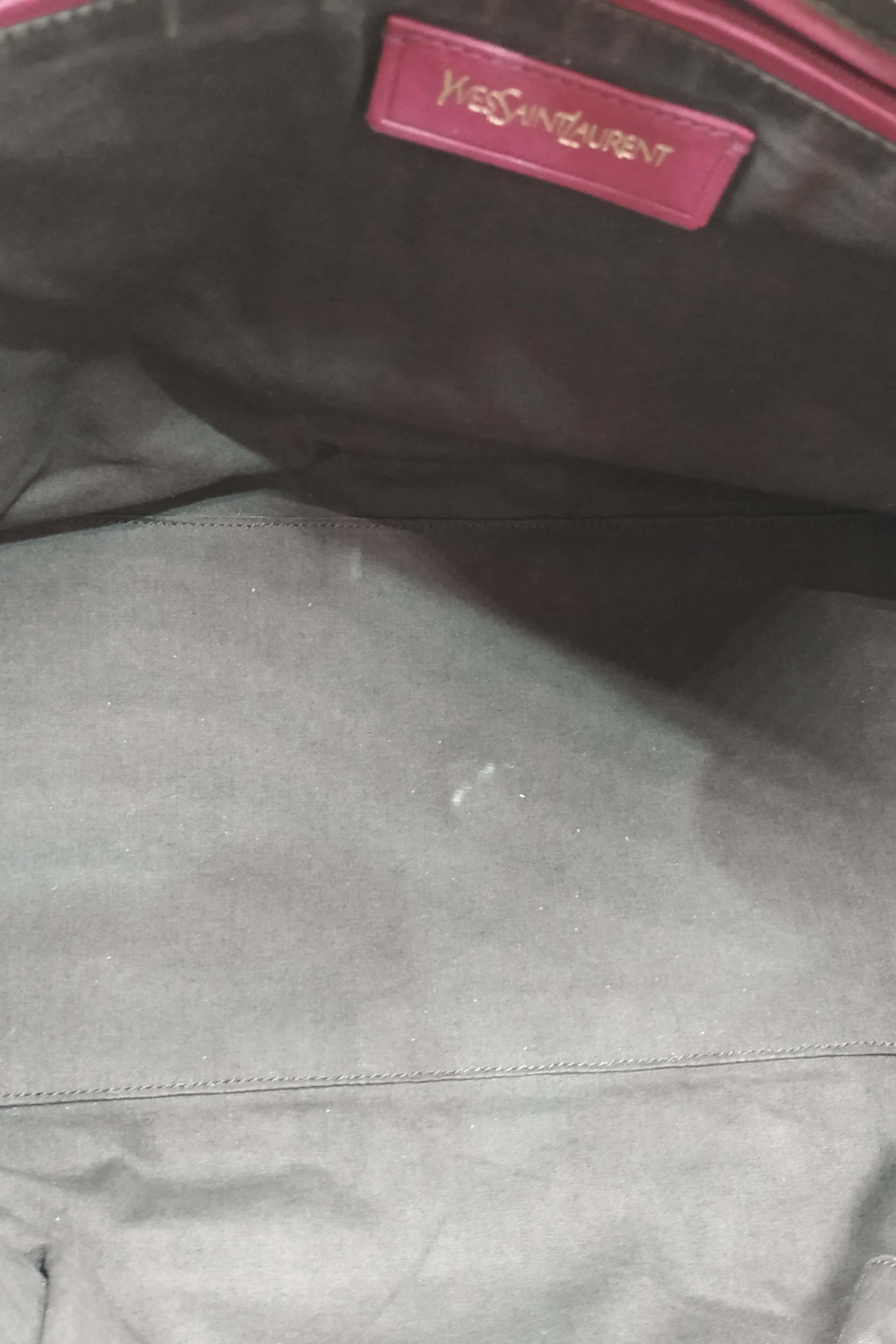 Item is slightly out of shape. Exterior back, logo hardware, and studs are scratched. Bottom corners are peeling. Handle has discoloration. Exterior front, back and bottom have discoloration. Bottom and interior lining are with transfer of colour.