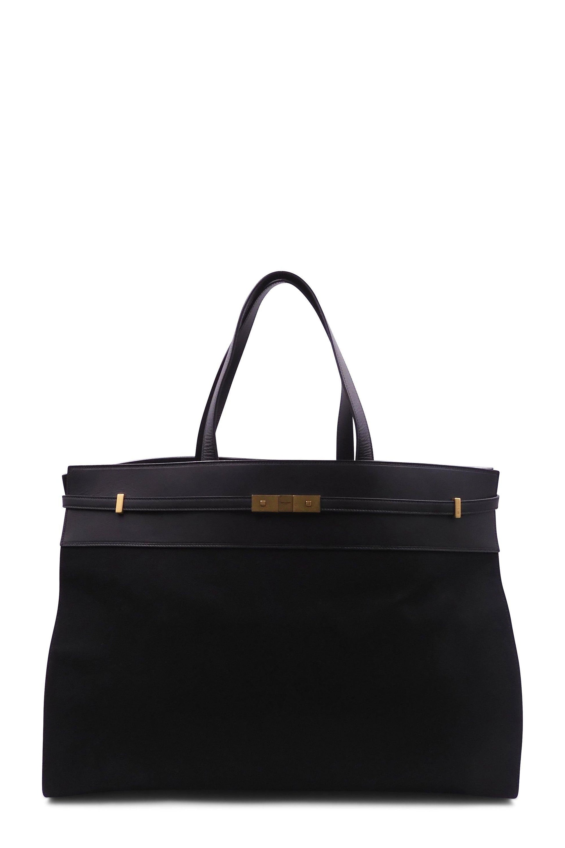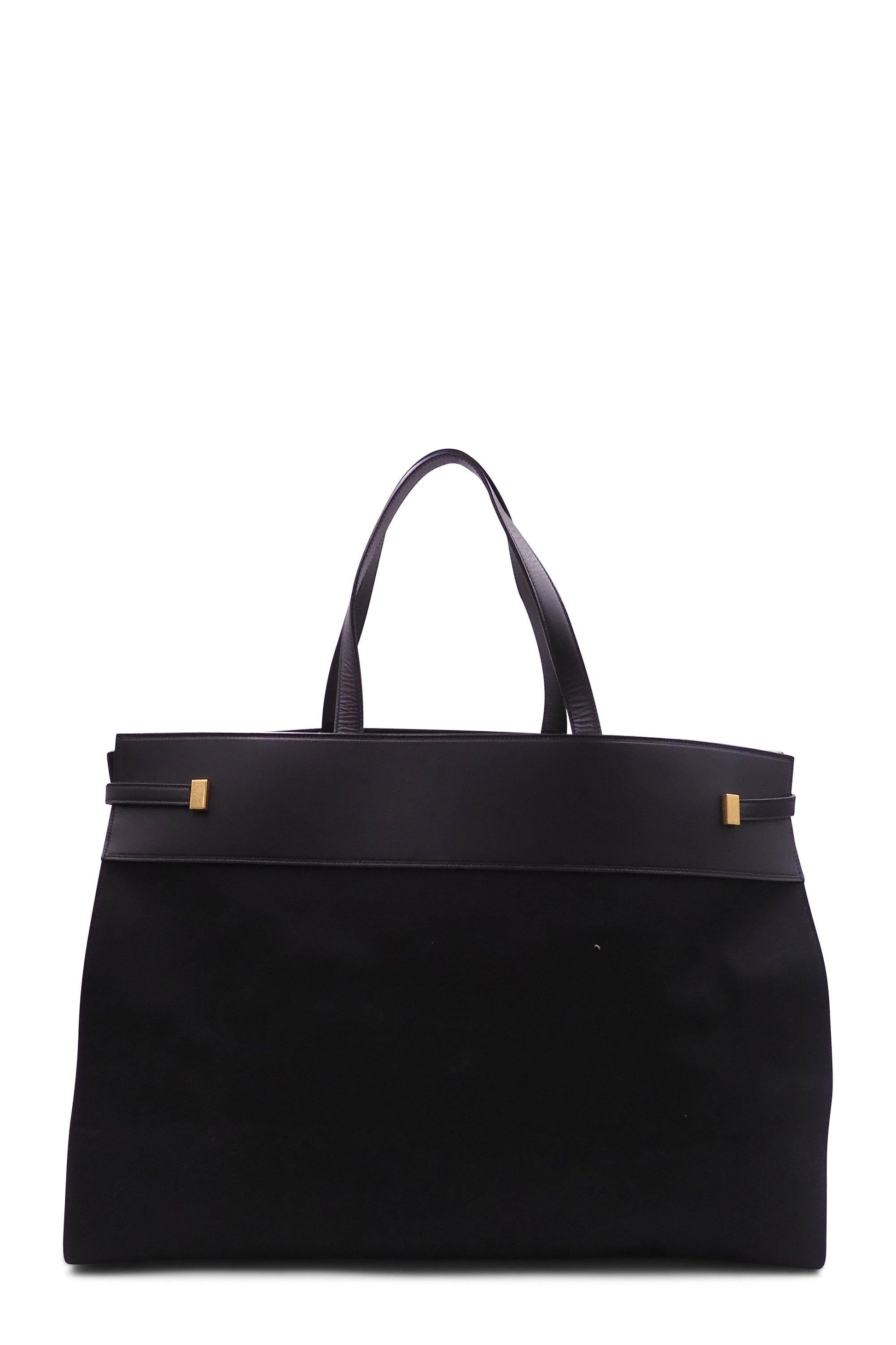 Saint Laurent signature tote bag with compression tabes on sides and leather handles. This tote is crafted of leather and canvas in black. The top opens to a black fabric lining with zip and patch pockets.
