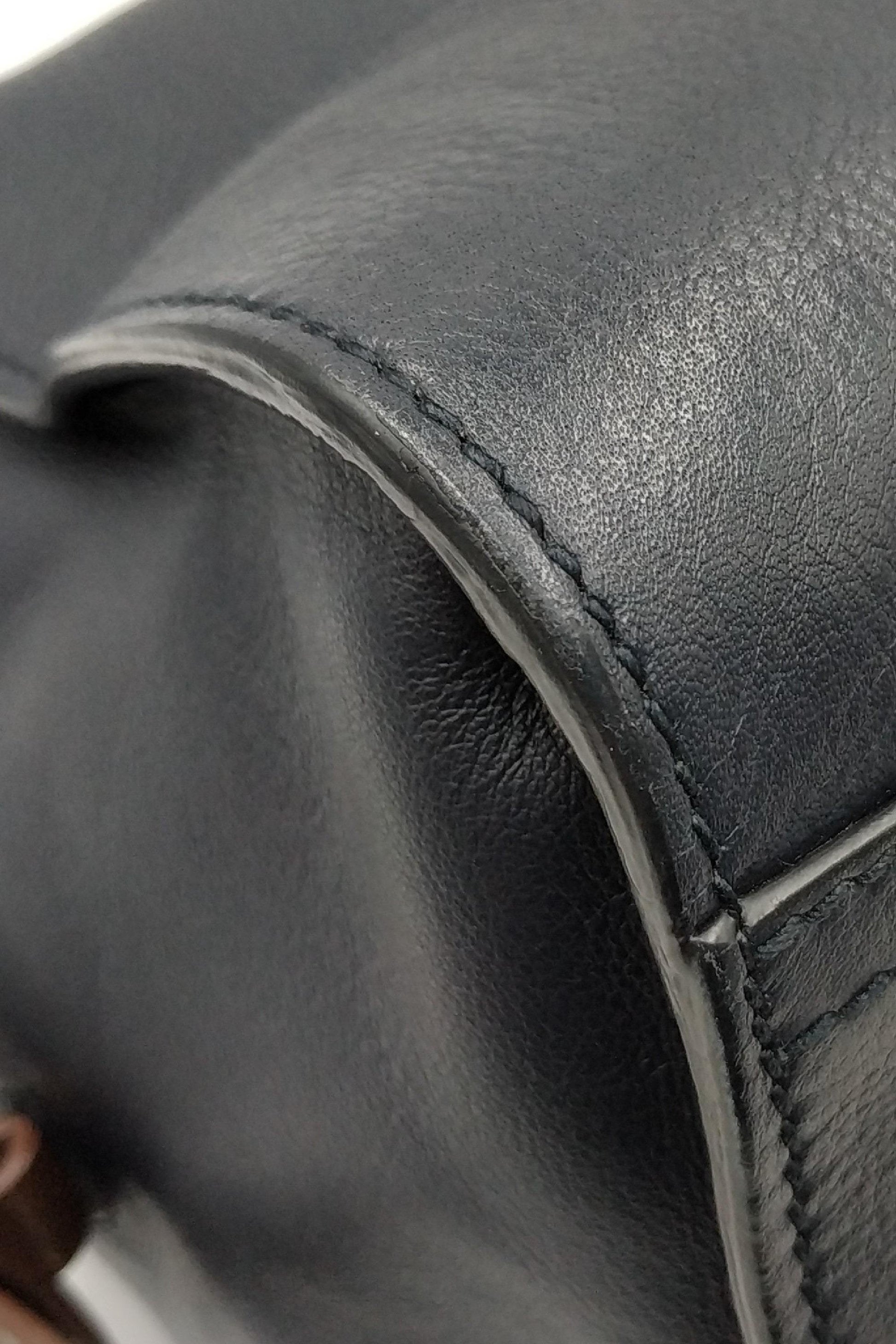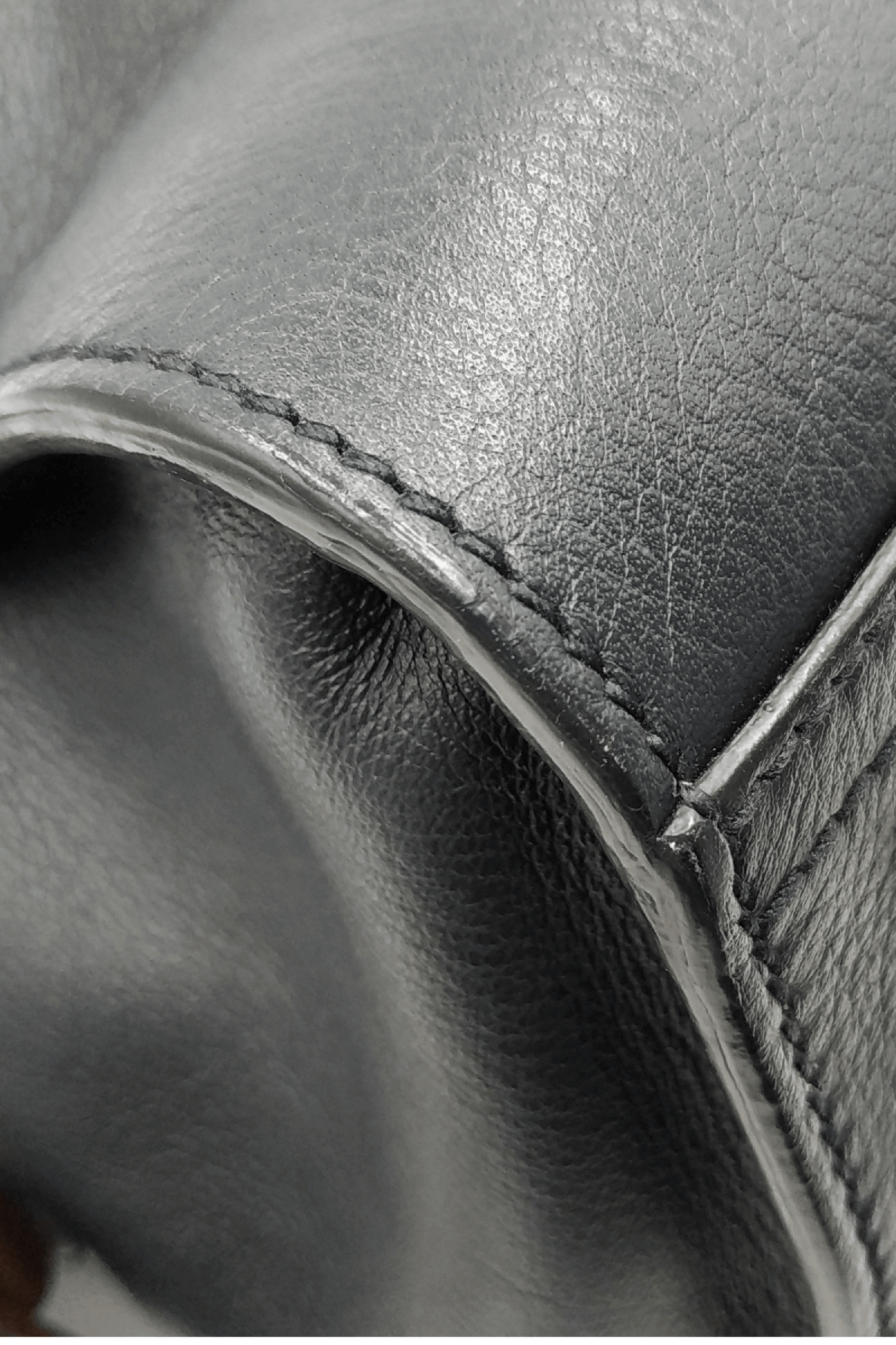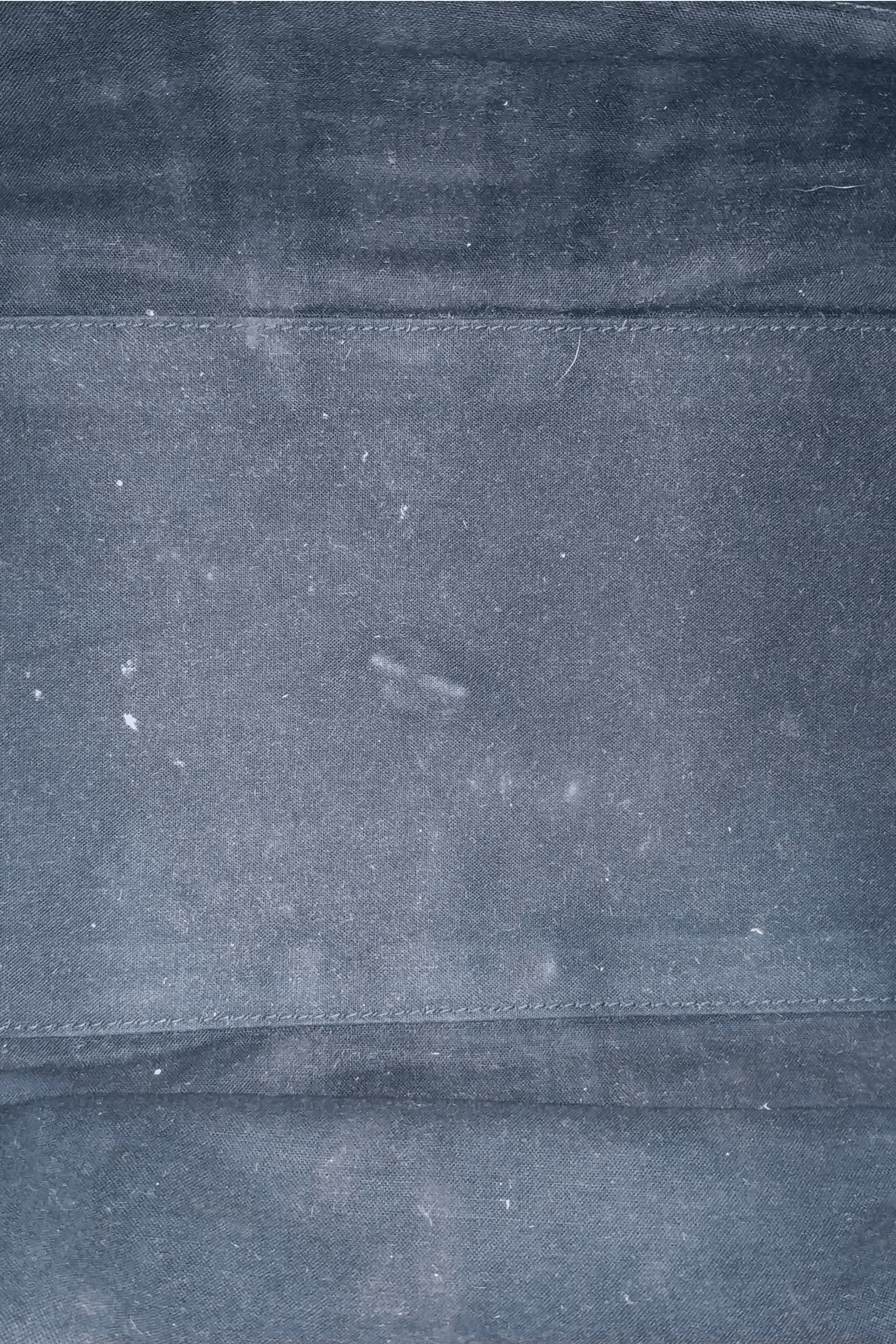 Exterior front and corners (bottom) are peeling. Exterior front, interior lining, zipper pull and studs have discoloration. Exterior front, back, sides, and handles have creases. Exterior back, bottom, interior lining, and handles are with transfer of colour. Handles, logo, zipper pull and studs are scratched