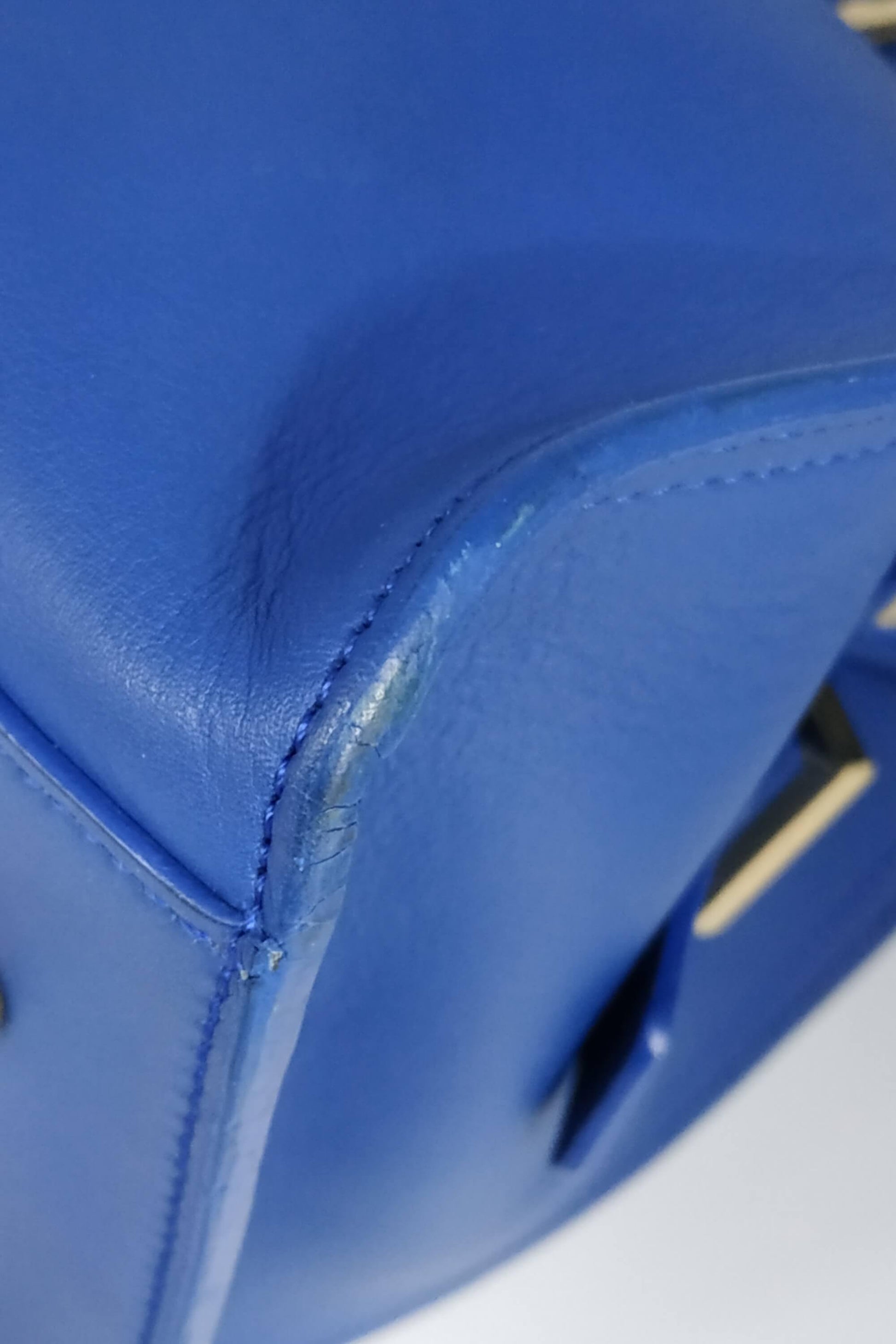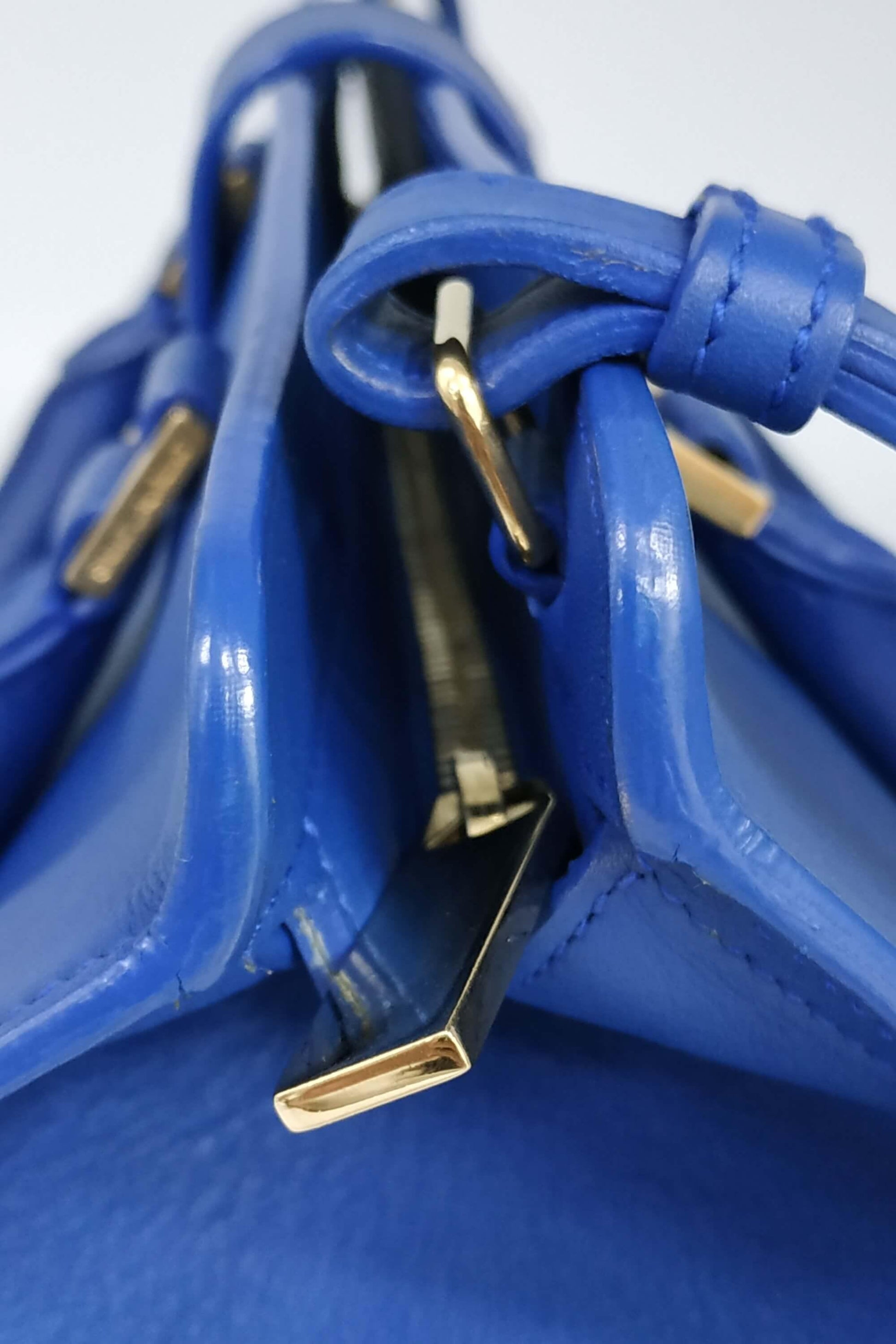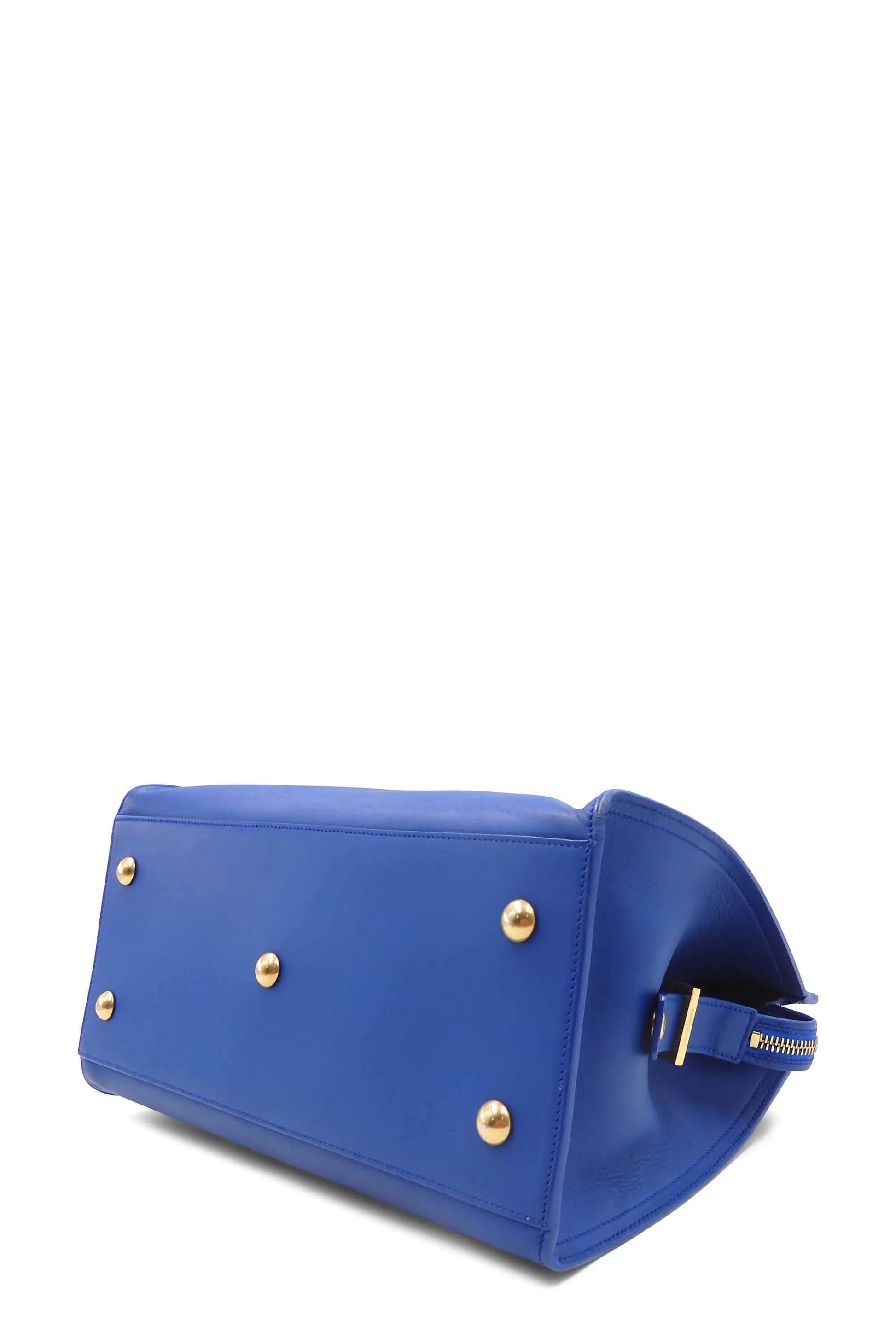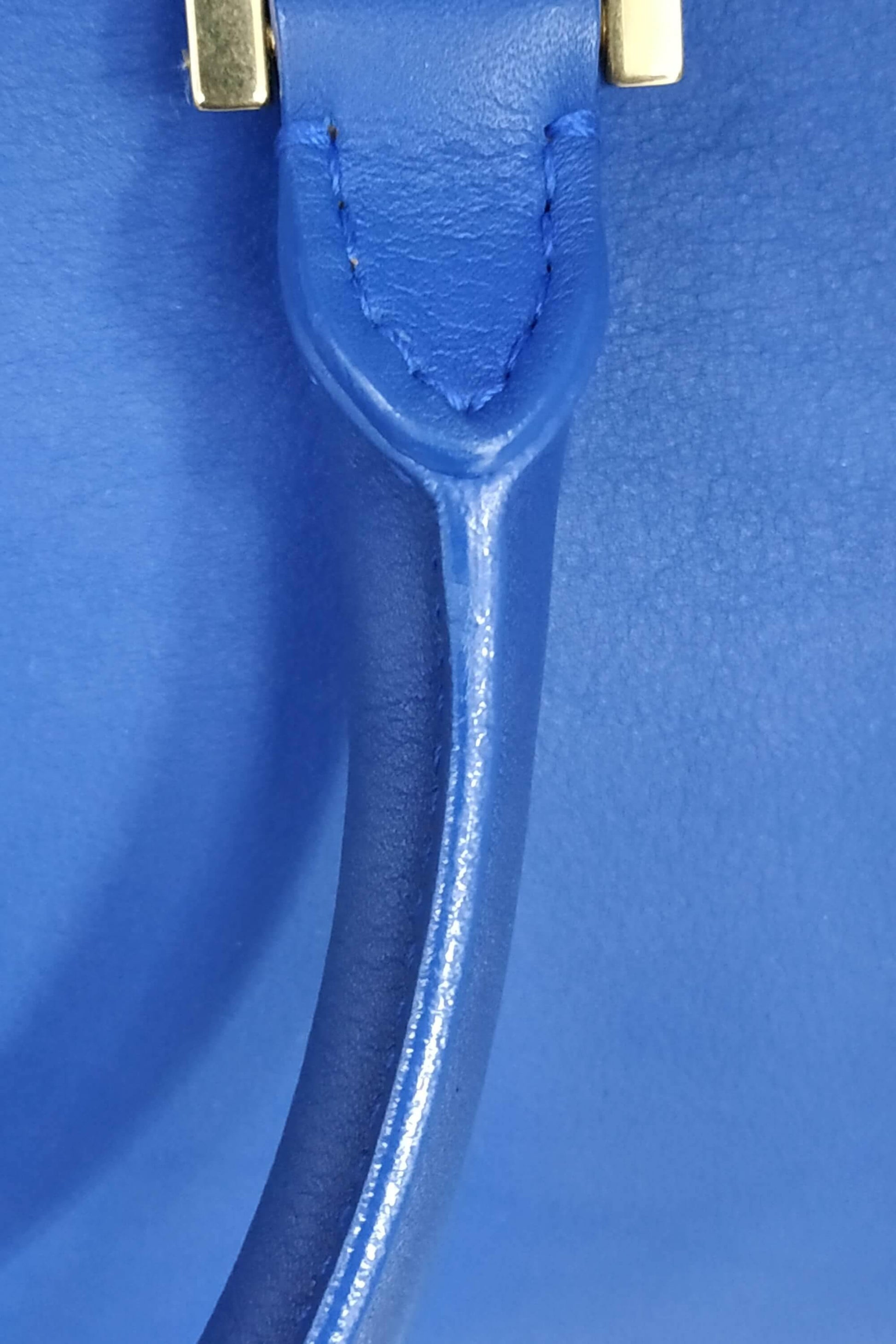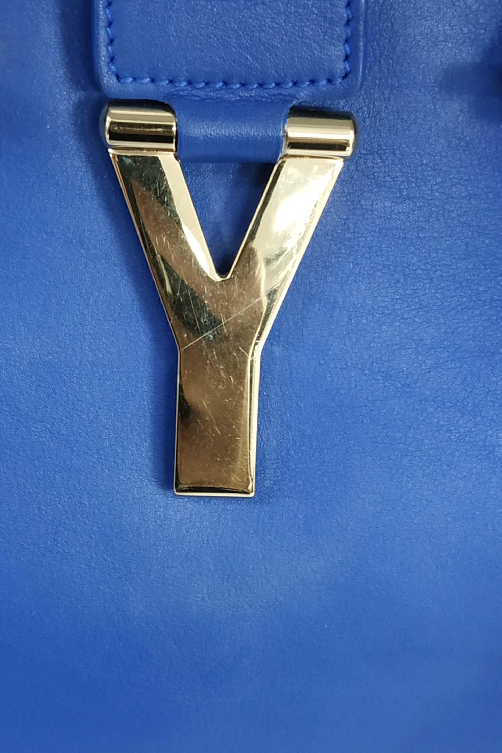 This Saint Laurent Chyc Cabas Tote Leather Small, crafted from blue leather, features Yves Saint Laurent's signature 'Y' top flap hardware piece with magnetic snap closure, dual rolled handles, and gold-tone hardware. Its top zip closure opens to a black fabric interior with side zip and slip pockets.