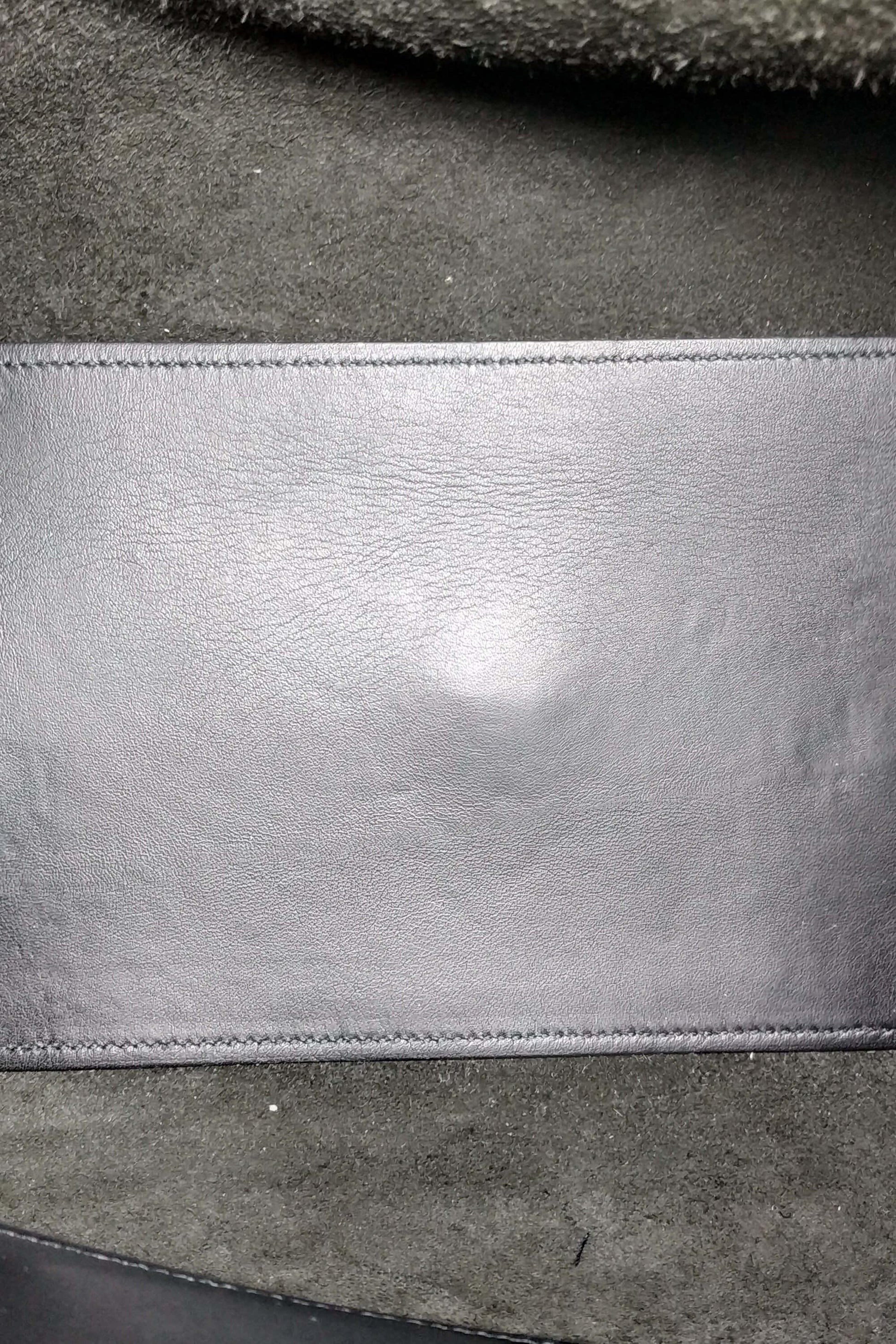 This Saint Laurent Chyc Cabas Tote Leather Small, crafted from black leather, features Yves Saint Laurent's signature 'Y' top flap hardware piece with magnetic snap closure, dual rolled handles, and gold-tone hardware. Its top zip closure opens to a black fabric interior with side zip and slip pockets.