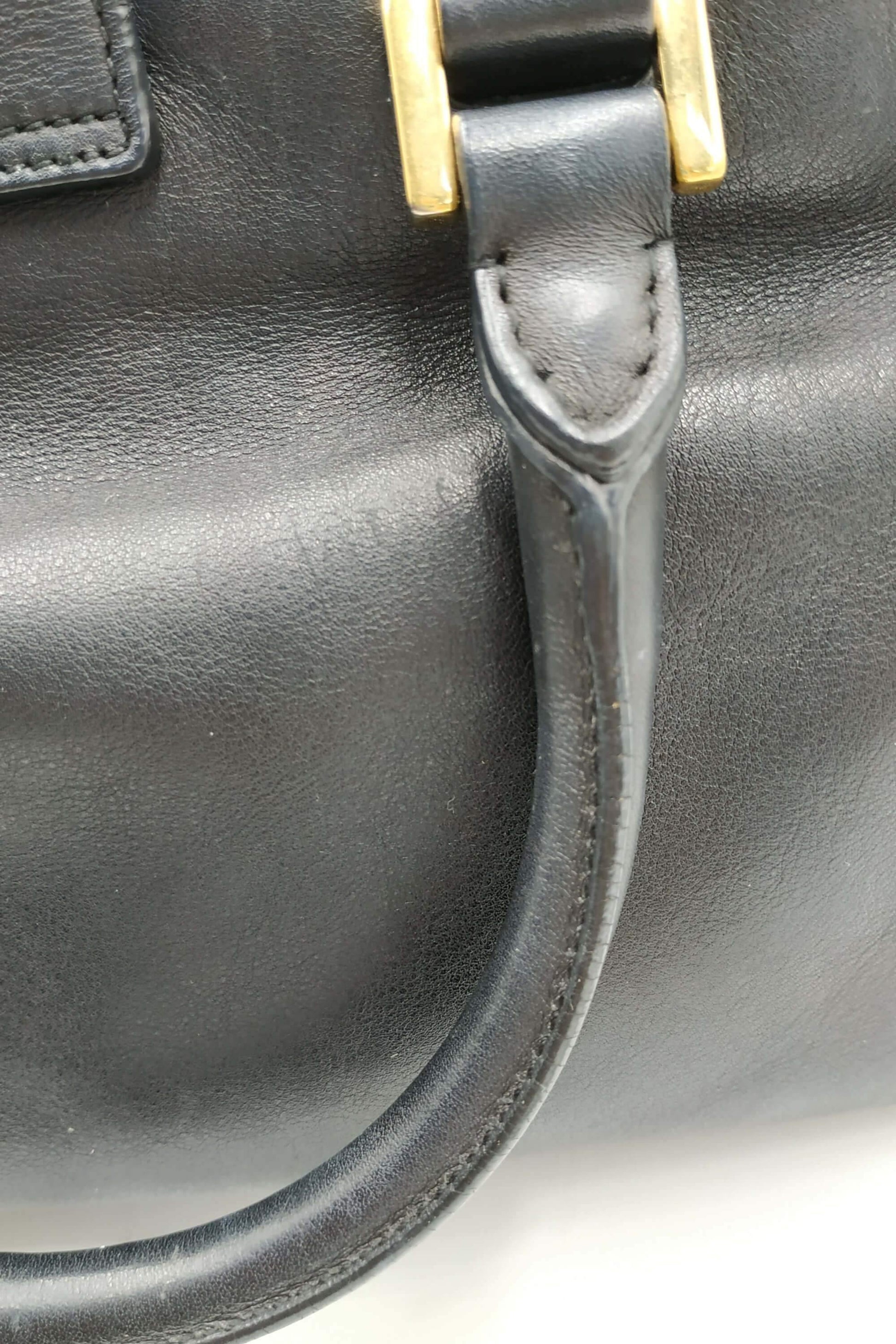 Exterior front has scratches. Handles have scratches and small cracks. Corners are and slightly peeling. Exterior back has creases and scratches. Y-hardware is scratched and . Strap has loose stitching.