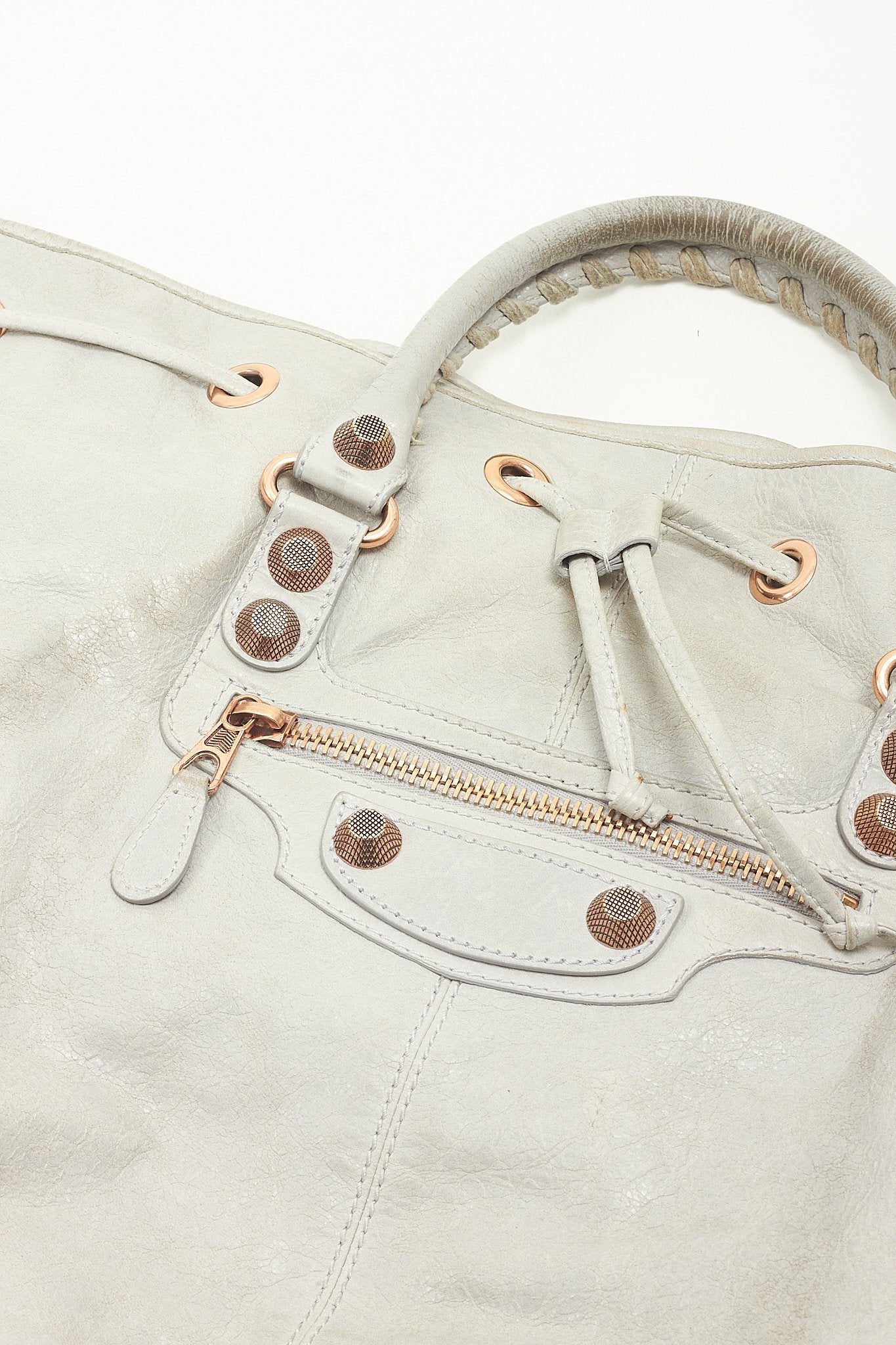 Condition Exterior: 7/10 - Good Condition. This item shows signs of wear. The leather has naturally softened and wrinkled due to age and composition. It is natural for Balenciaga leather to change color with age. Small scratches visible throughout; however, the leather is naturally meant to appear aged. Darkening and discolouration around the bottom and corners. The handles have faintly discoloured and darkened with small nail marks and scratches - darkening along the treads. Some areas of the thread is frayed throughout. The hardware is bright with small scratches. Some stains visible to the upper.