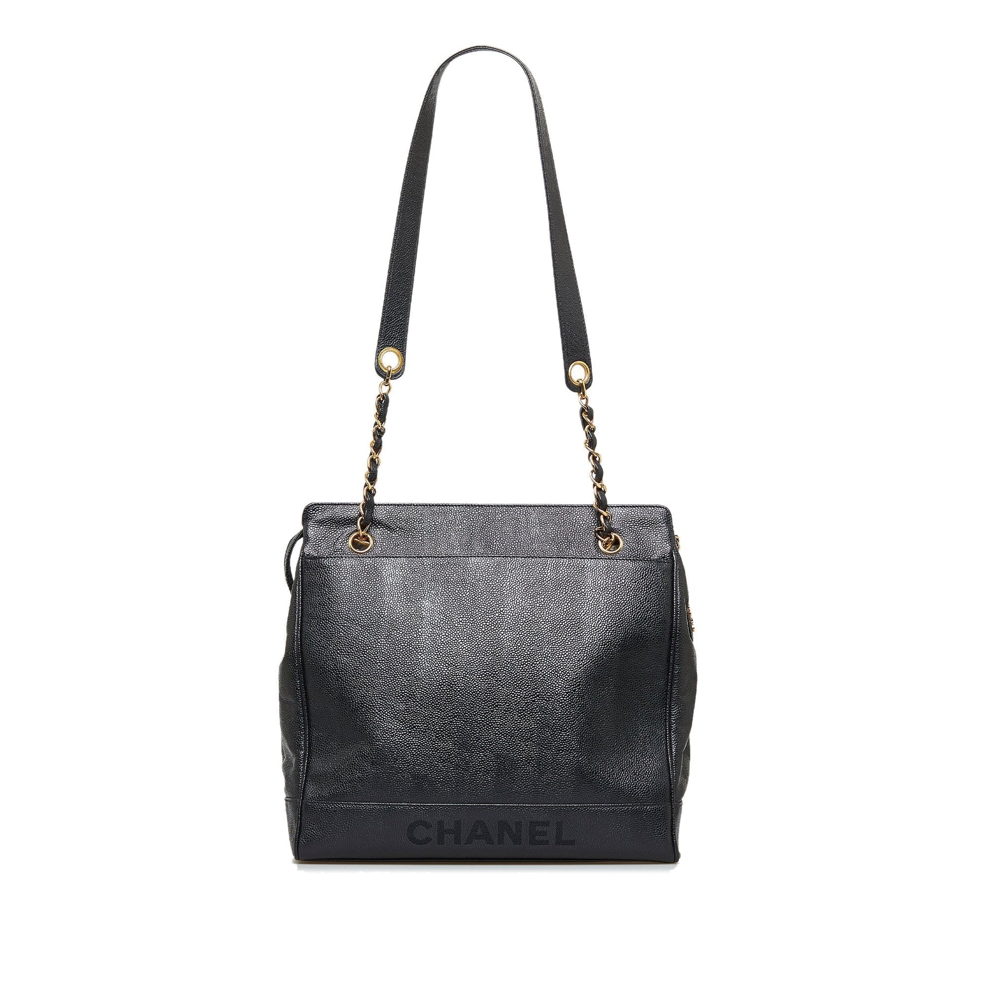 Product Details: Black Chanel Caviar Chain Tote. This tote bag features a caviar leather body, flat leather and chain straps, an open top with magnetic button closure, and interior zip and slip pockets. 11.8" L x 12.2" W x 3.9" D. Serial number 4653560.