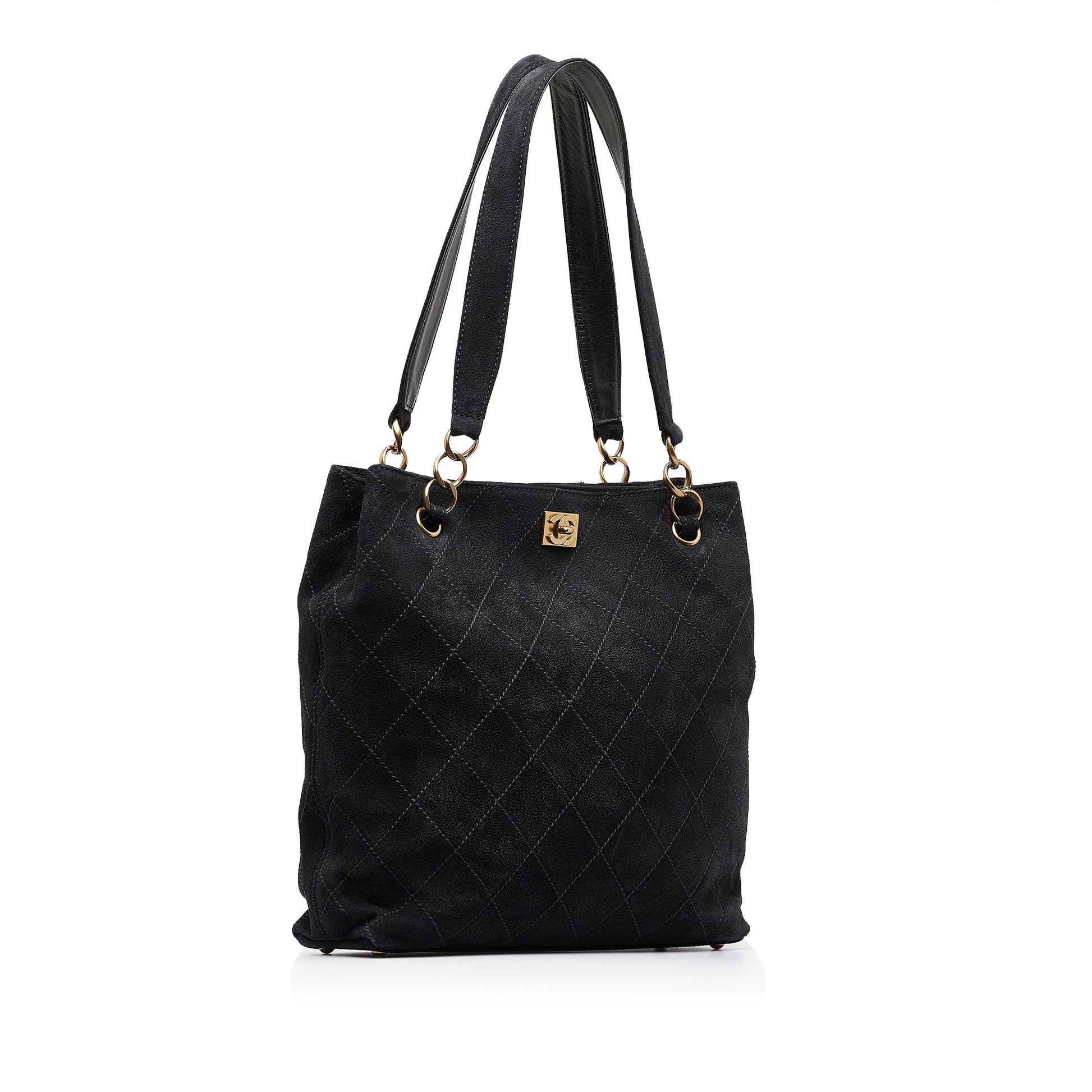 Product Details: Black Chanel Wild Stitch CC Suede Leather Tote. This tote bag features a wild stitch quilted suede leather body, flat leather handles, an open top, and an interior zip pocket. 12" L x 11.8" W x 4.3" D, 10.8" drop. Serial number 7325935.