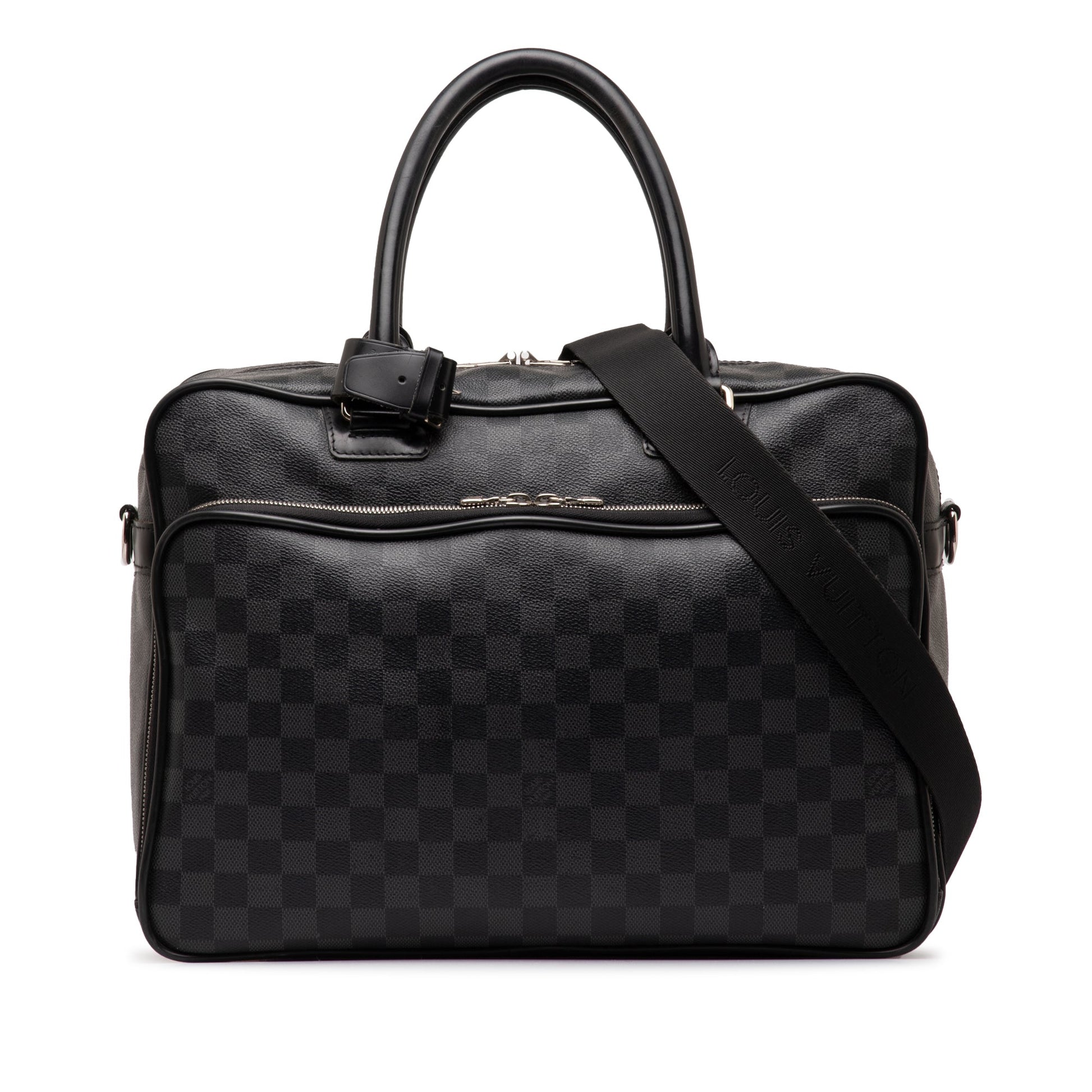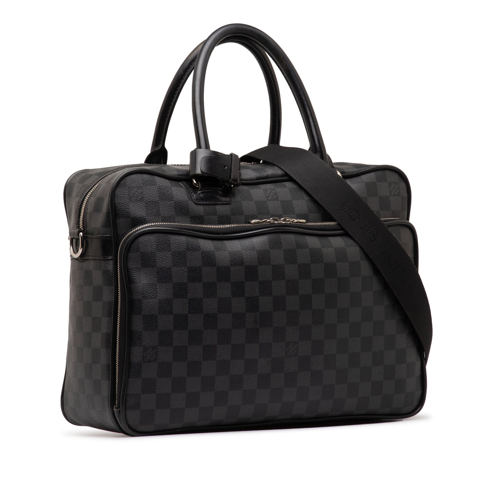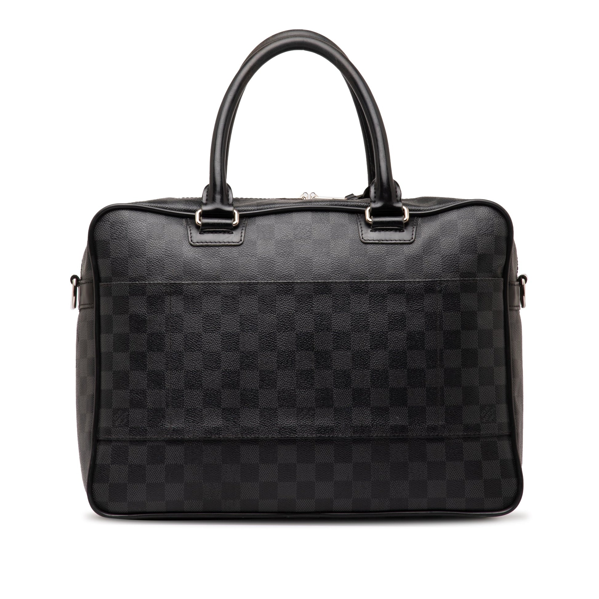Product Details: Black Louis Vuitton Damier Graphite Icare Business Bag. The Icare Laptop Bag features a damier canvas body, an exterior front zip compartment with interior slip pockets, an exterior back slip pocket, rolled leather handles, a top zip closure, and an interior laptop holster. 11" L x 14.6" W x 4.7" D, 6.1" drop.