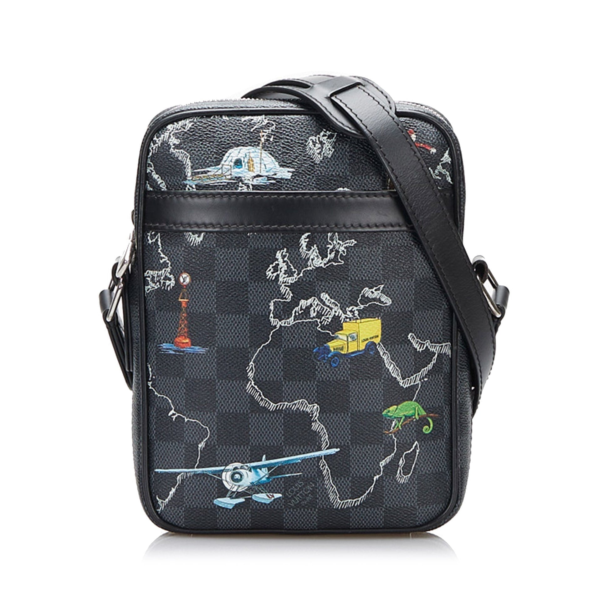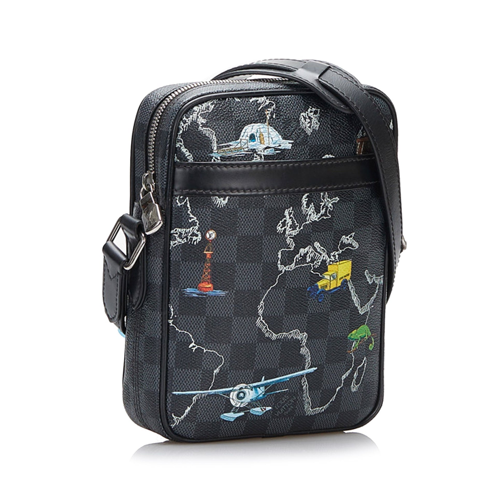 Product Details: Black Louis Vuitton Damier Graphite Renaissance Map Danube Slim PM Crossbody Bag. The Danube features an damier canvas body, an exterior front slip pocket, an adjustable shoulder strap, and a top zip closure. 7.9" L x 5.9" W x 1.7" D. Serial number FO3119.