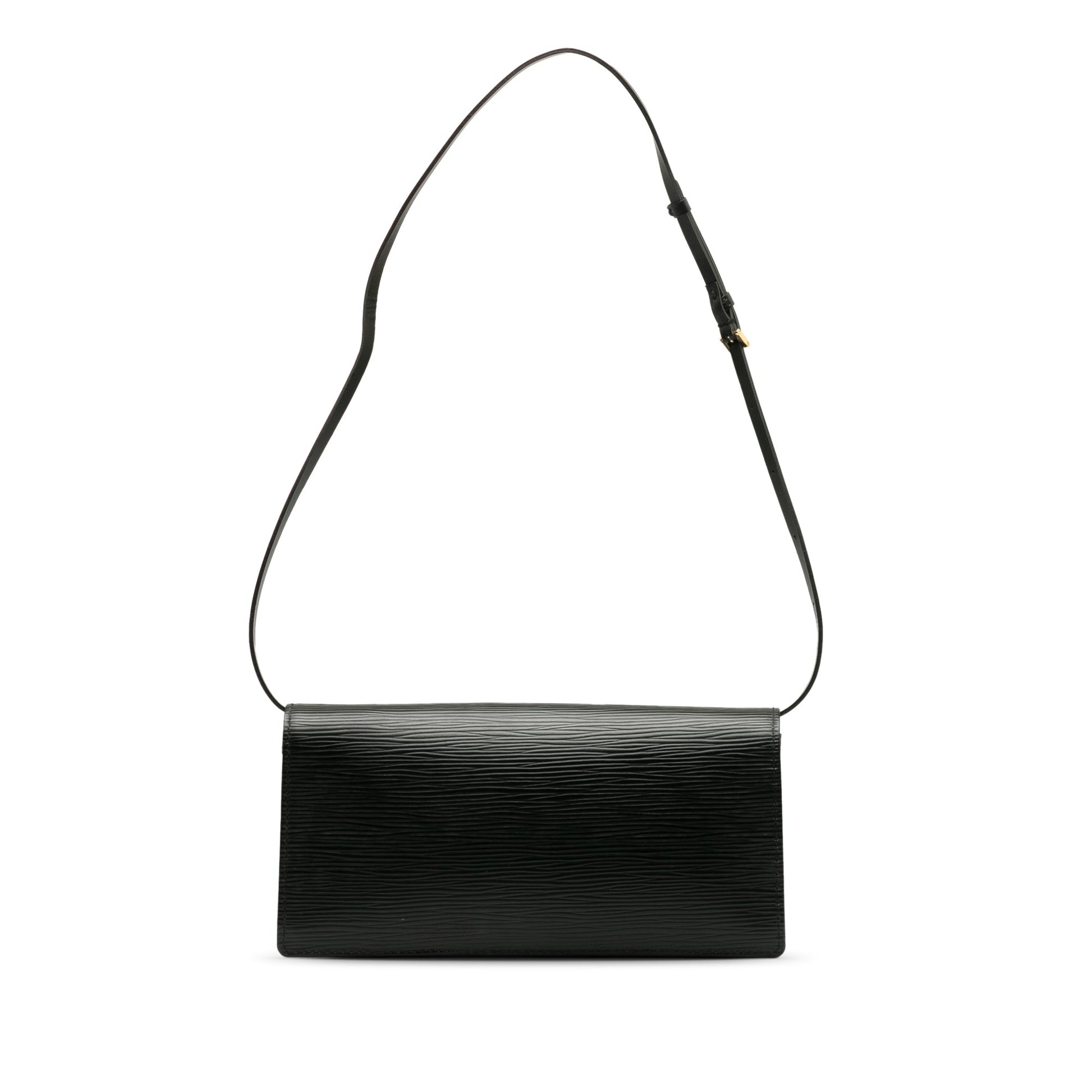 Product Details: Black Louis Vuitton Epi Honfleur Shoulder Bag. The Honfleur features an epi leather body, a detachable flat strap, a top flap with press stud closure, and interior slip pockets. 4.7" L x 8.7" W x 1.2" D, 13.8" drop. Serial number CA0017.