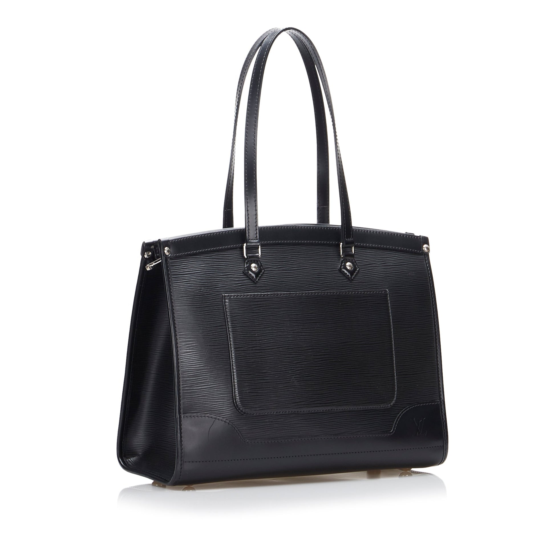 Product Details: Black Louis Vuitton Epi Madeleine GM Tote Bag. The Madeleine GM features an epi leather body, exterior back slip pocket, flat leather handles, a top zip closure, and interior slip pockets. 9.8" L x 13.4" W x 4.7" D, 8.3" drop. Serial number BJ2097.