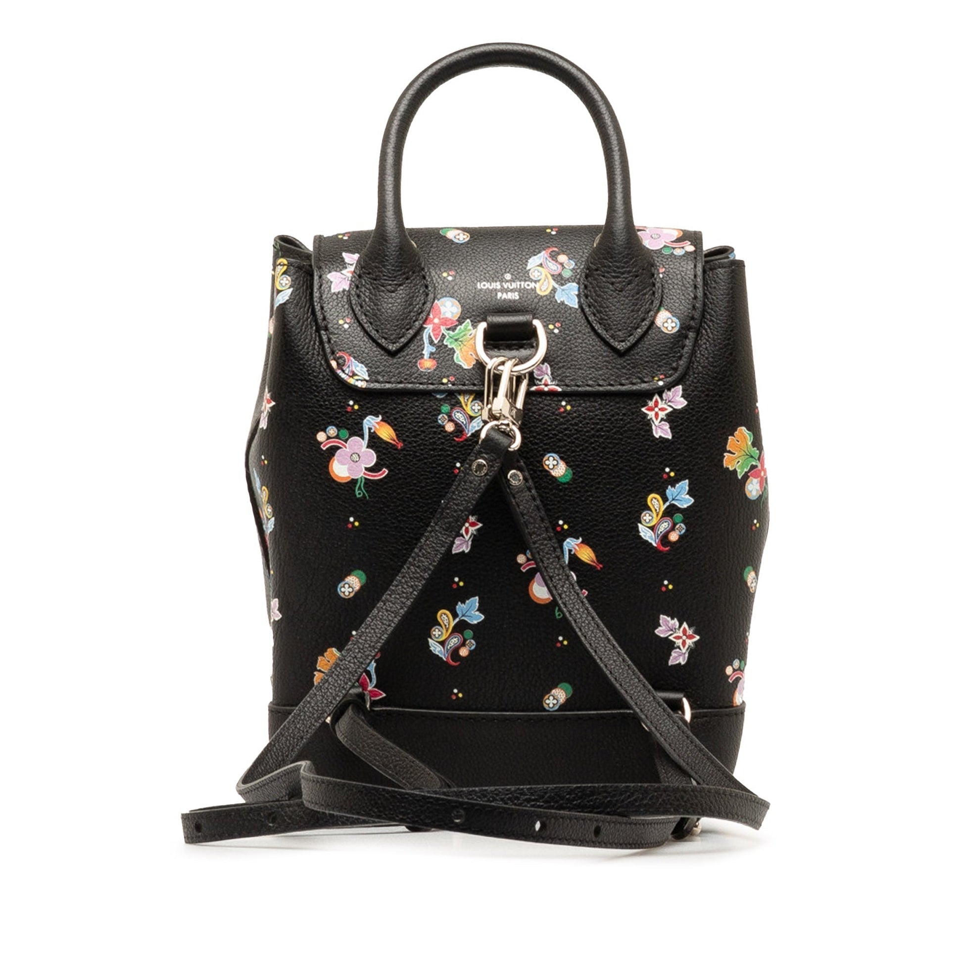 Product Details: Black Louis Vuitton Lockme Floral Backpack. The Lockme backpack features a printed leather body, a rolled leather top handle, adjustable flat back straps, a top flap with a silver-tone turn lock closure, a drawstring closure, and an interior slip pocket. 7.9" L x 5.9" W x 3.3" D, 2.2" drop. Serial number DU3157.