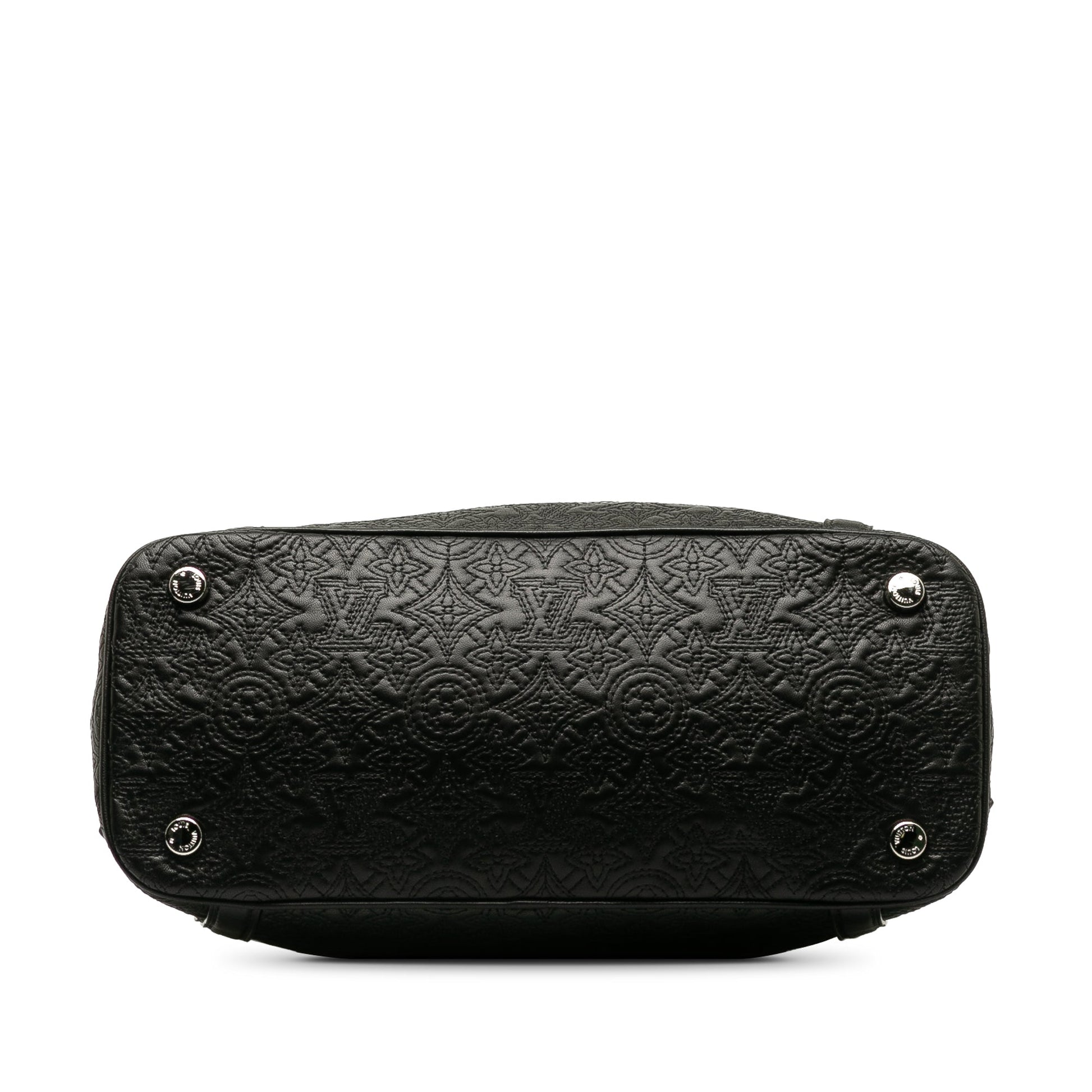 Product Details: Black Louis Vuitton Monogram Antheia Ixia PM Satchel. The Antheia Ixia PM features an embroidered lambskin leather body, rolled handles, a detachable flat strap, a top zip closure, and interior zip and slip pockets. 10.6" L x 13.4" W x 5.9" D, 3.1" drop. Serial number FL0142.