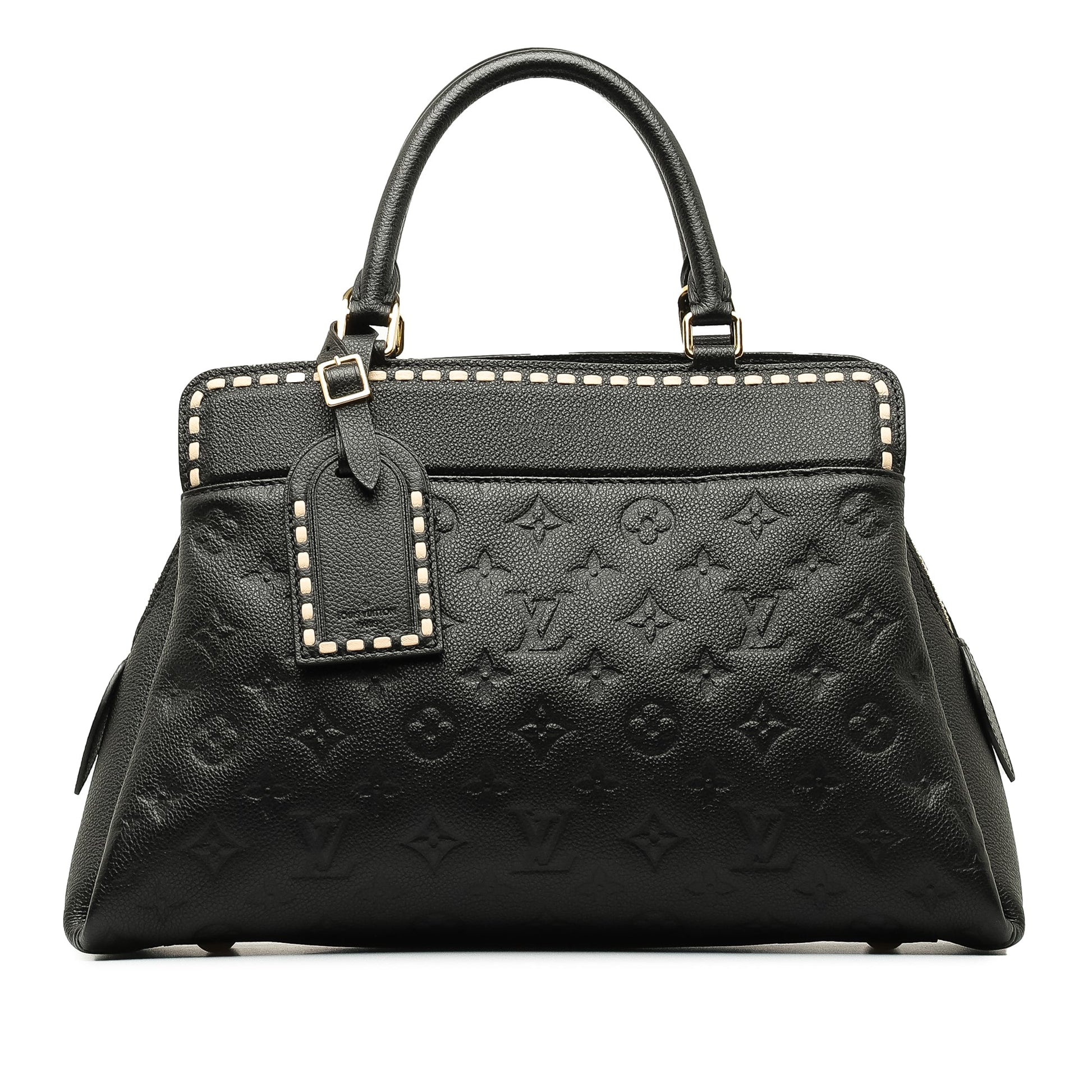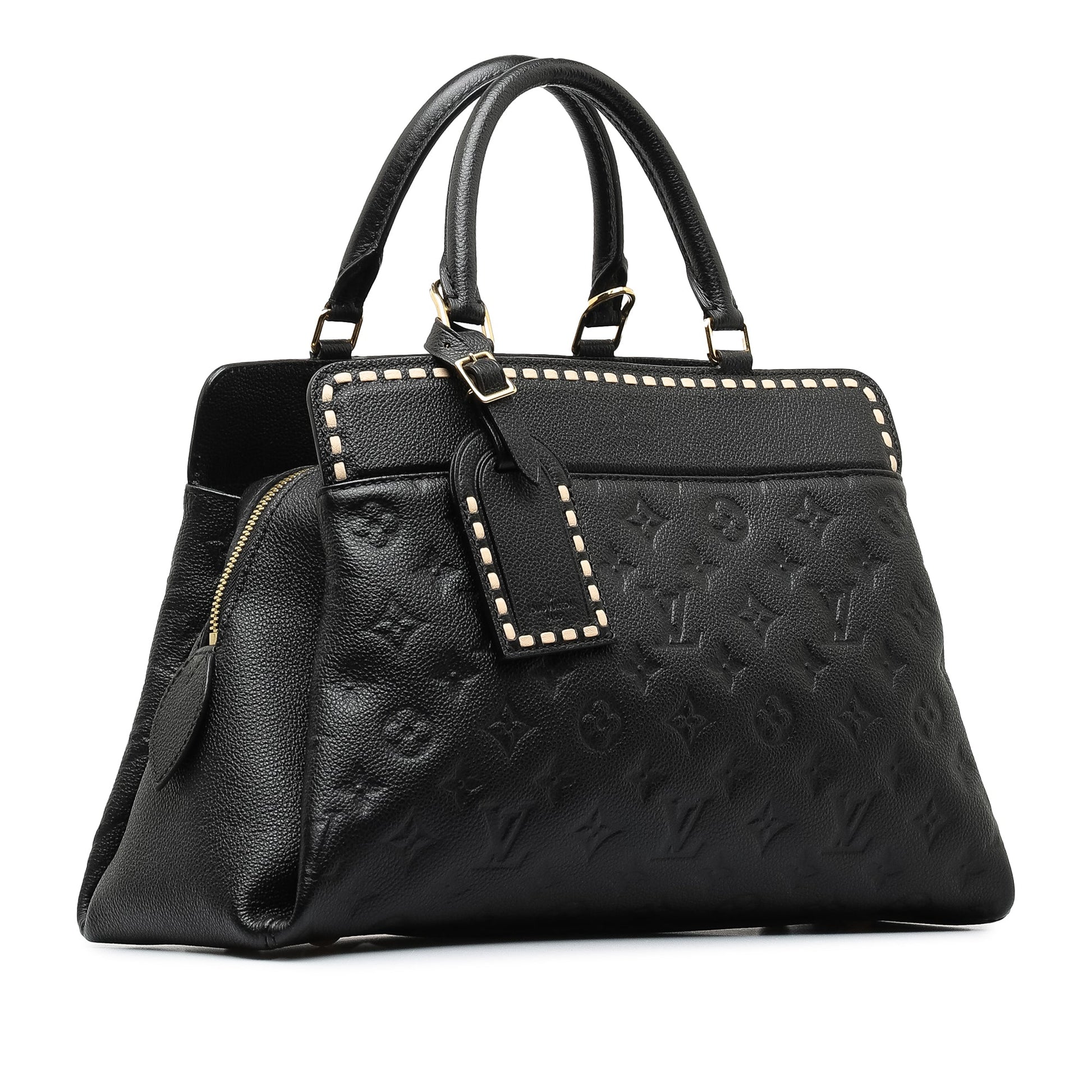 Product Details: Black Louis Vuitton Monogram Empreinte Vosges MM Satchel. The Vosges features a monogram empreinte body, rolled leather handles, a detachable flat leather strap, a top zip closure, and interior slip pockets. 8.5" L x 13.8" W x 5.7" D, 4.1" drop. Serial number SP3196.