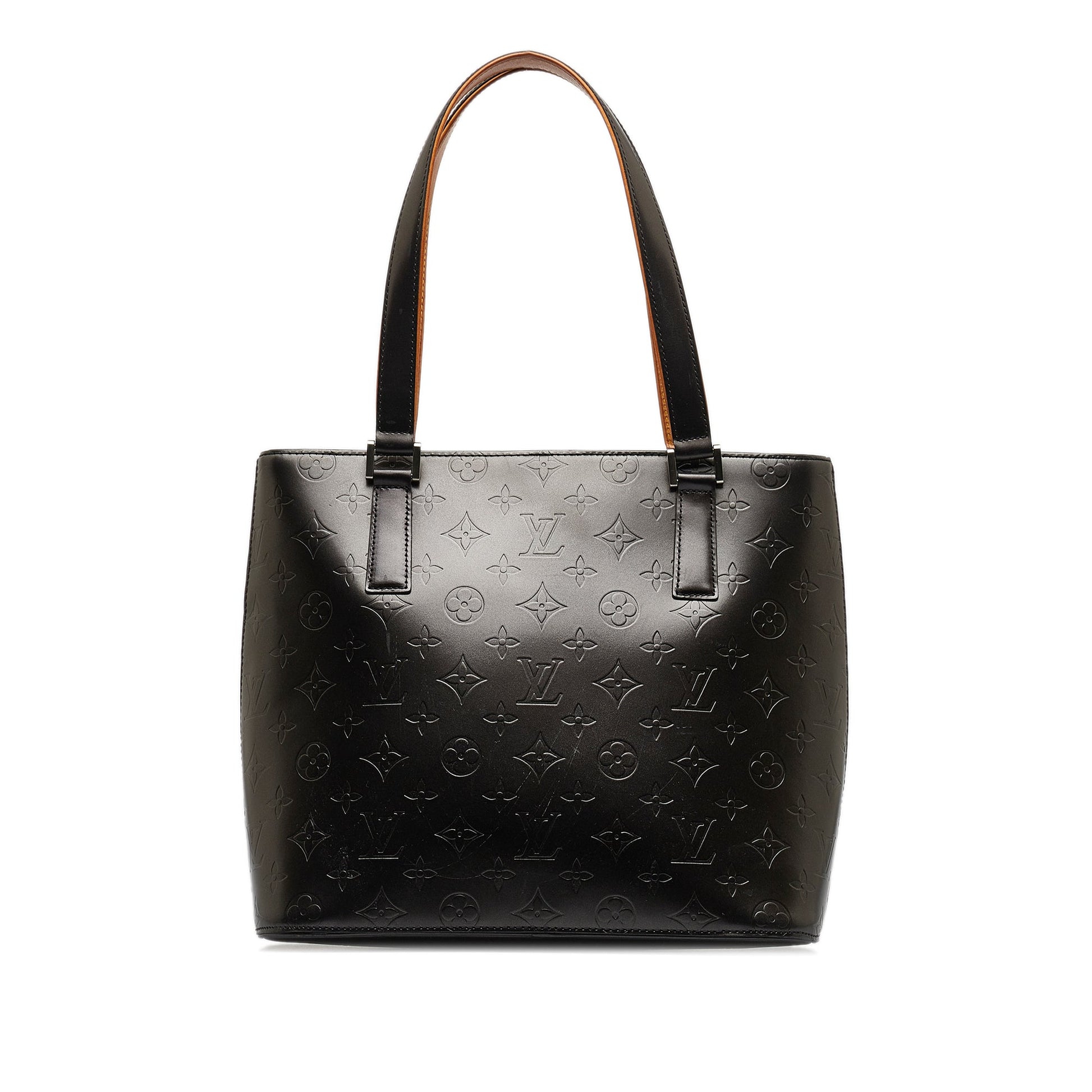 Product Details: Black Louis Vuitton Monogram Mat Stockton Tote Bag. The Stockton features a monogram mat body, flat leather shoulder straps, a top zip closure, and interior zip and slip pockets. 10.2" L x 11.4" W x 5.7" D, 9.1" drop. Serial number CA0053.