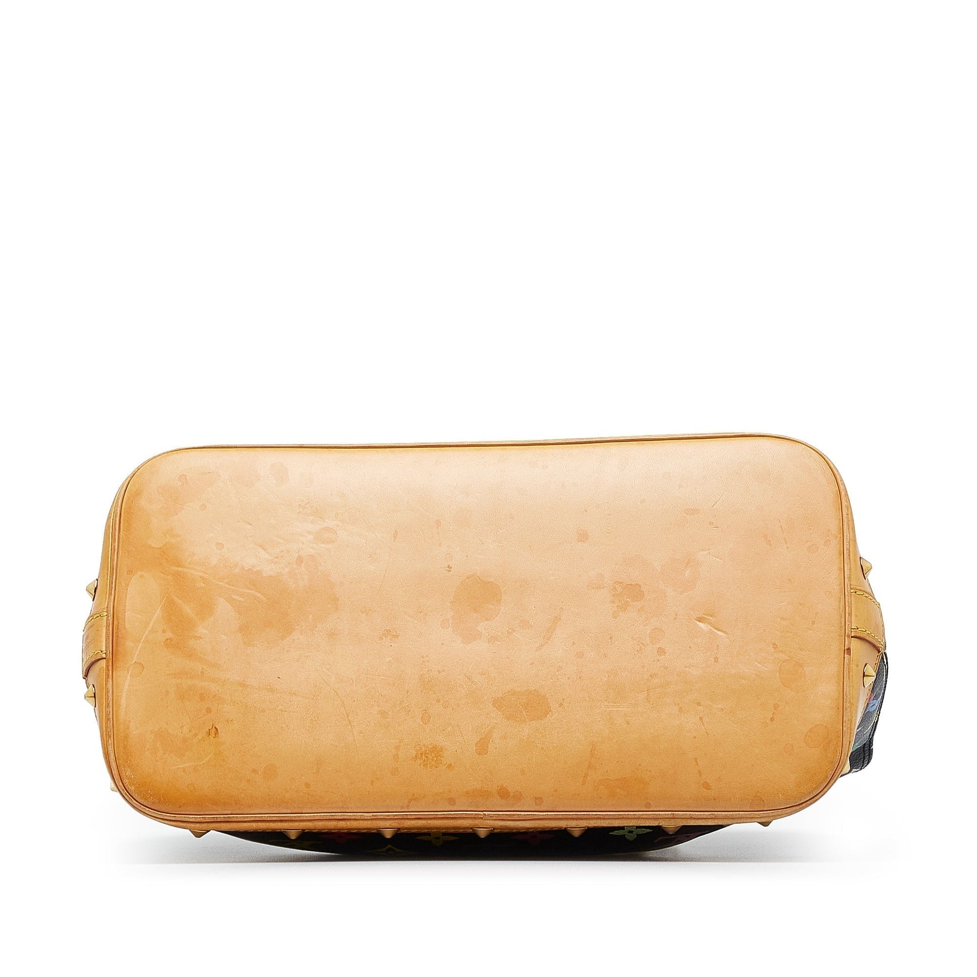 Product Details: Black Louis Vuitton Monogram Multicolore Alma PM HandBag. The Alma PM features a monogram multicolore canvas body, rolled vachetta handles, vachetta trim, a studded base, an exterior zip pocket, a two-way zip around closure, and interior slip pockets. 9.4" L x 12.6" W x 6.7" D, 3.9" drop. Serial number FL0054.