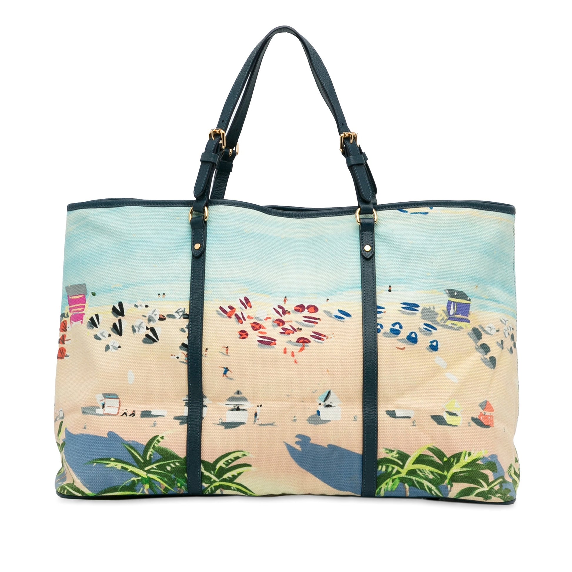 Product Details: Blue Louis Vuitton Ailleurs Cabas Promenade GM Tote Bag. The Ailleurs Cabas Promenade GM features a printed canvas body with leather trim, adjustable flat leather straps, and an open top with clasp closure. 16.9" L x 21.7" W x 8.7" D, 4.7" drop. Serial number FO0181.