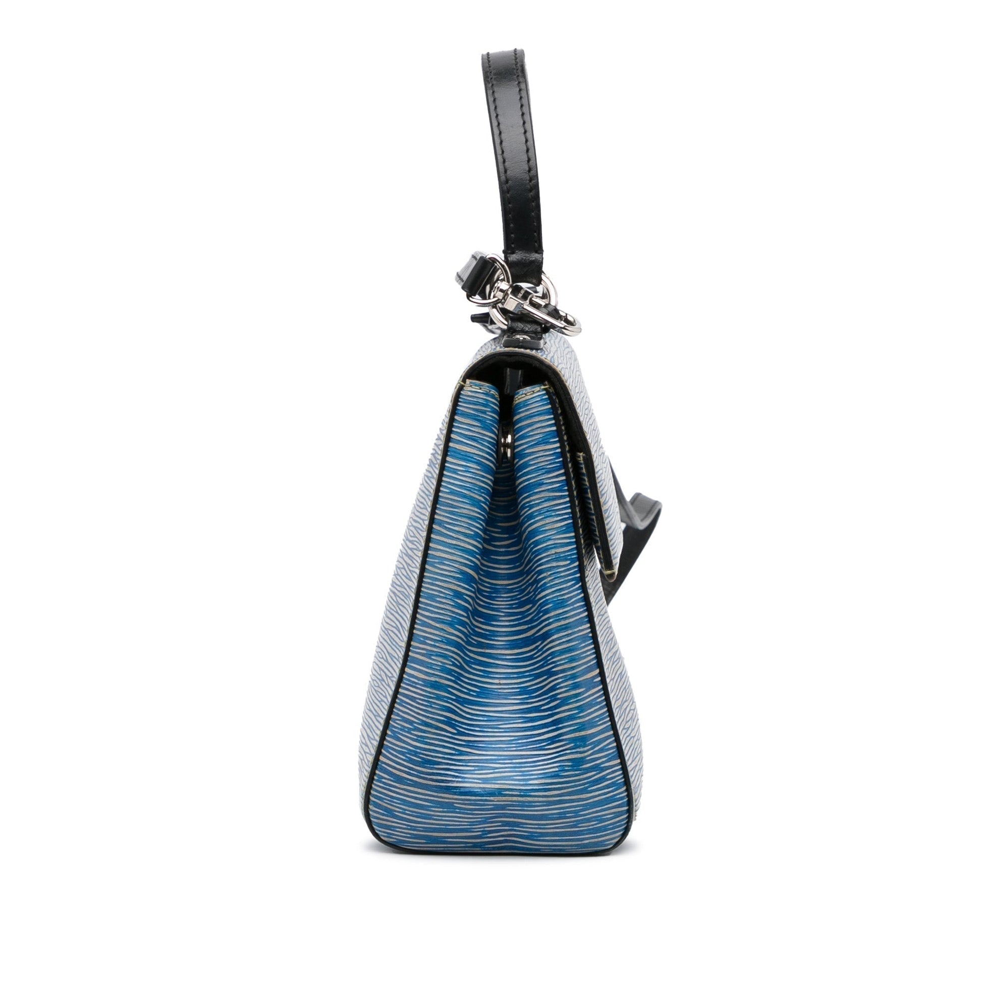 Product Details: Blue Louis Vuitton Epi Denim Cluny BB Satchel. The Cluny BB features an epi leather body, a flat leather top handle, a detachable flat leather strap, a front flap with magnetic closure, and interior zip and slip pockets. 9.8" L x 7.5" W x 3.9" D, 4.3" drop. Serial number CA0167.