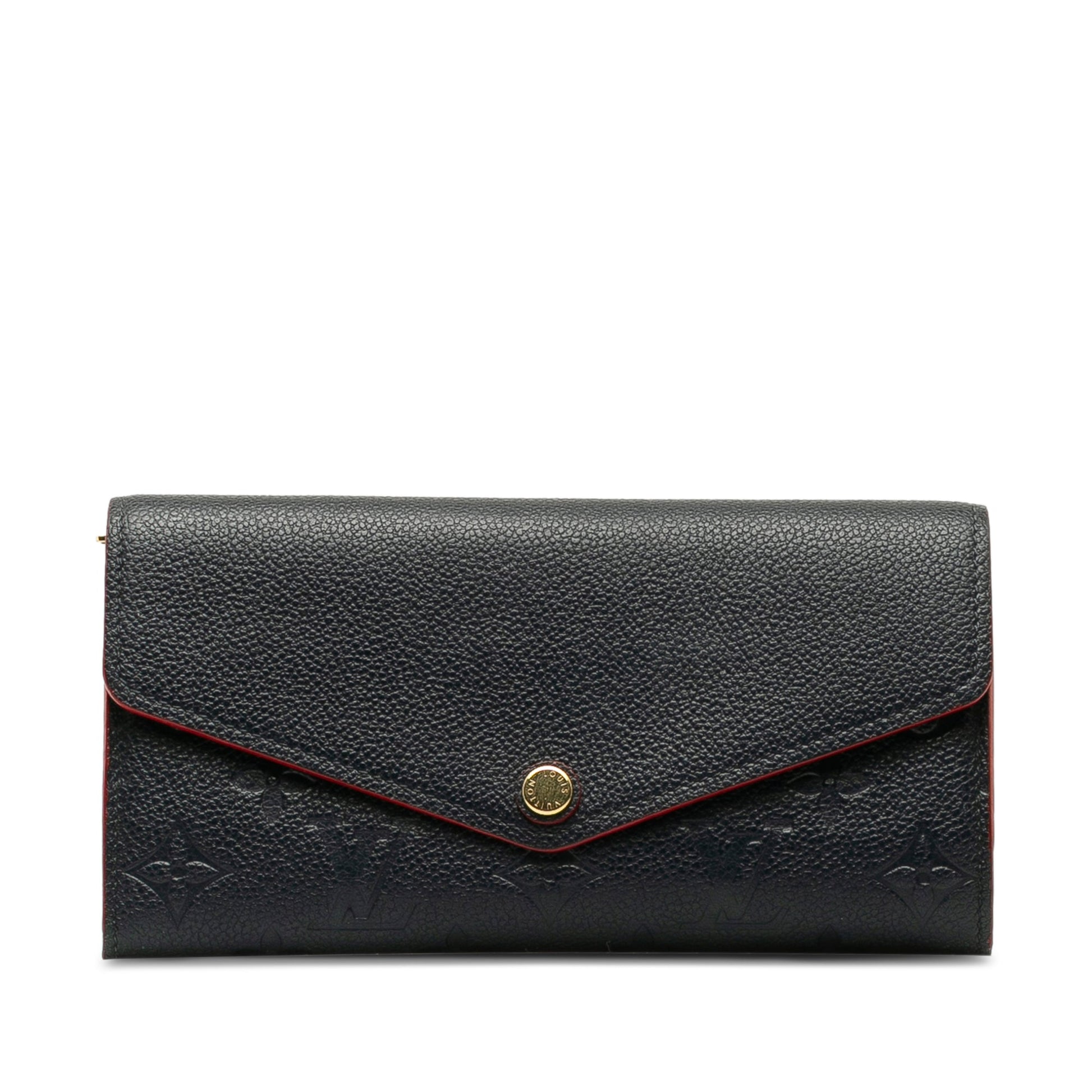 Product Details: Blue Louis Vuitton Monogram Empreinte Portefeuille Sarah Wallet. The Sarah features a leather monogram empreinte body, a front flap with a closure, and interior zip and slip pockets. 3.7" L x 7.5" W x 1" D. Serial number CA0280.