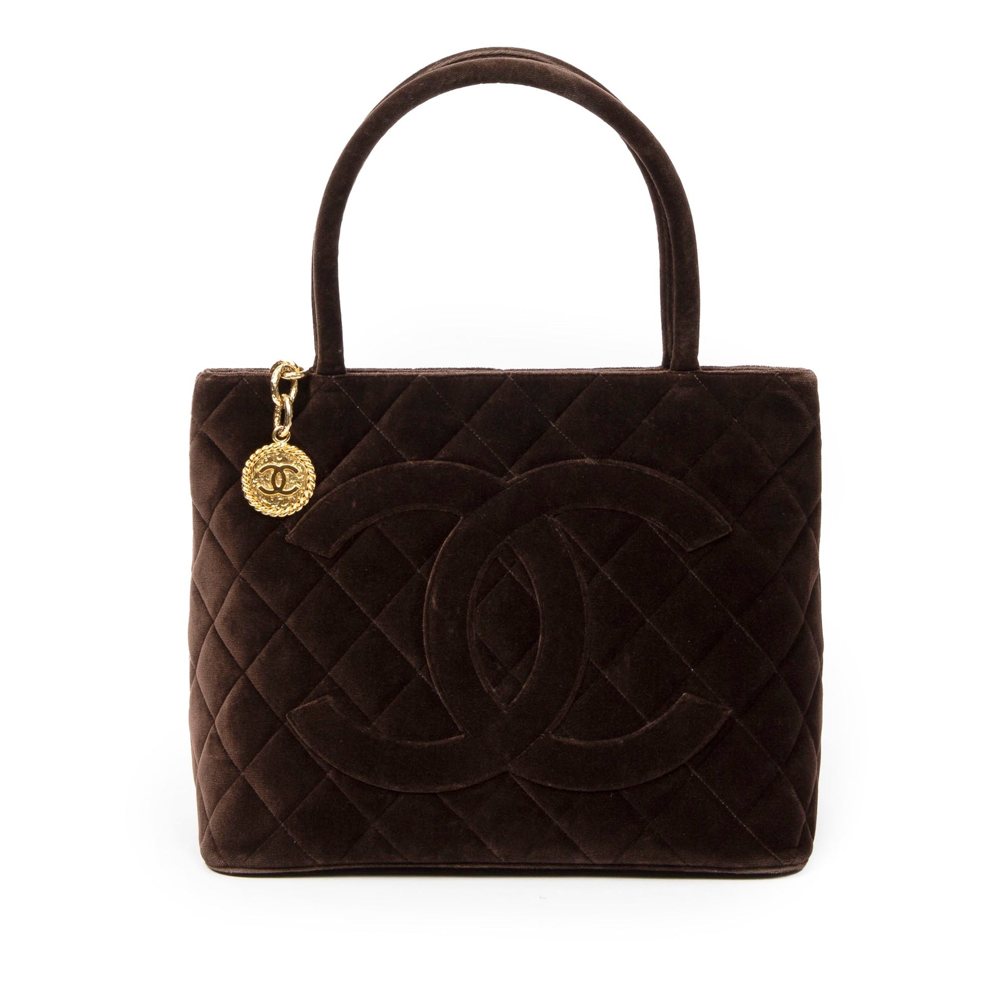 Product Details: Brown Chanel Velvet Medallion Tote. The Medallion tote bag features a quilted velvet body, rolled handles, a top zip closure, an exterior back slip pocket, and interior zip and slip pockets. 9.3" L x 11.8" W x 5.7" D, 6.3" drop. Serial number 5421296.