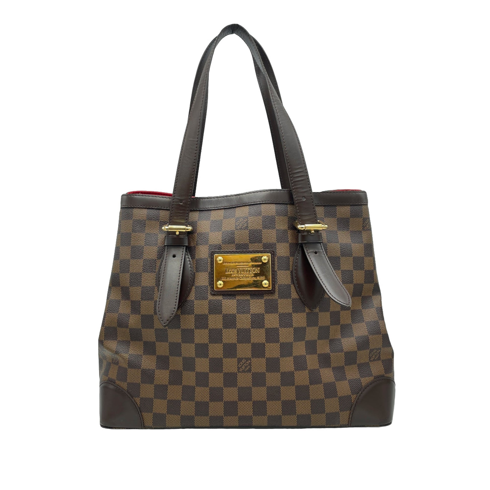 Product Details: Brown Louis Vuitton Damier Ebene Hampstead MM Tote Bag. The Hampstead MM features a damier ebene canvas, flat leather handles, an open top, and an interior zip and slip pockets. 11" L x 13.8" W x 6.7" D.