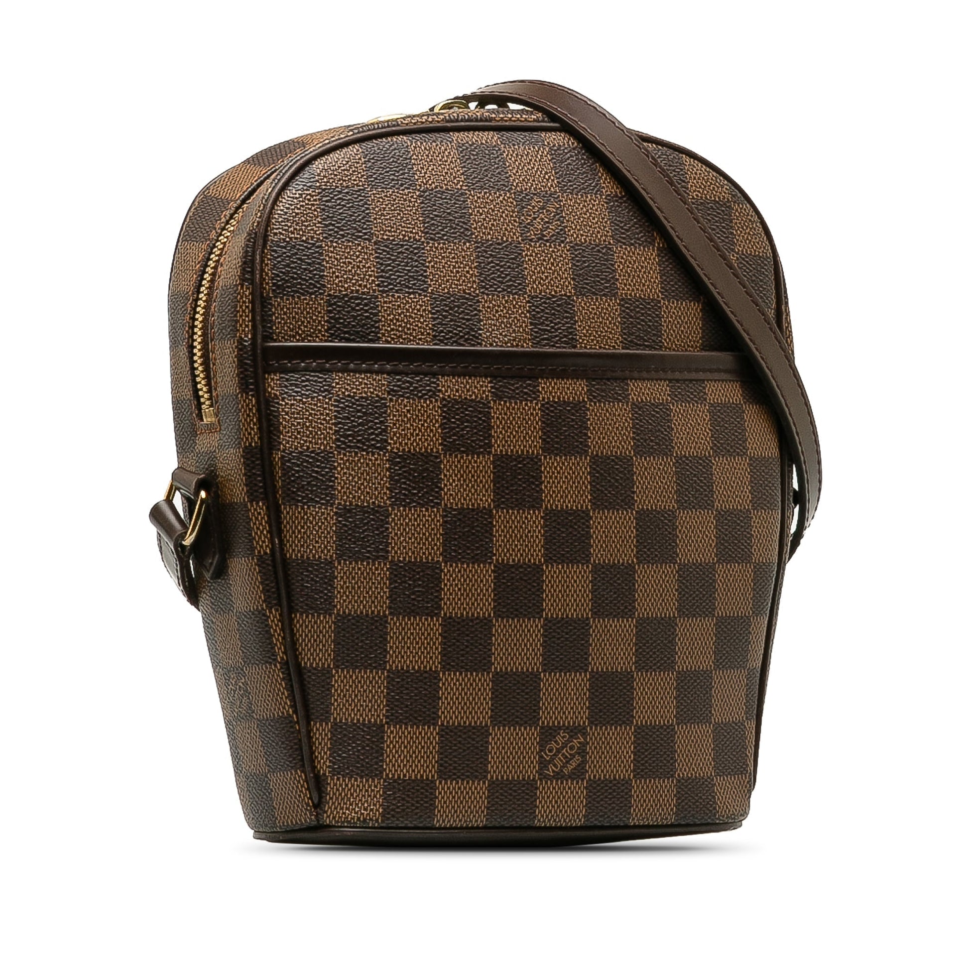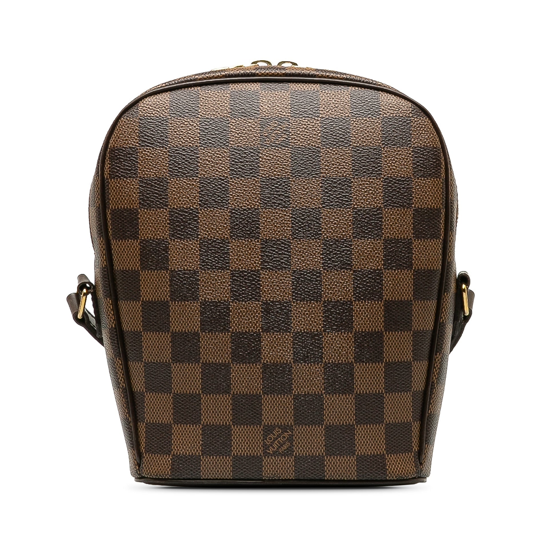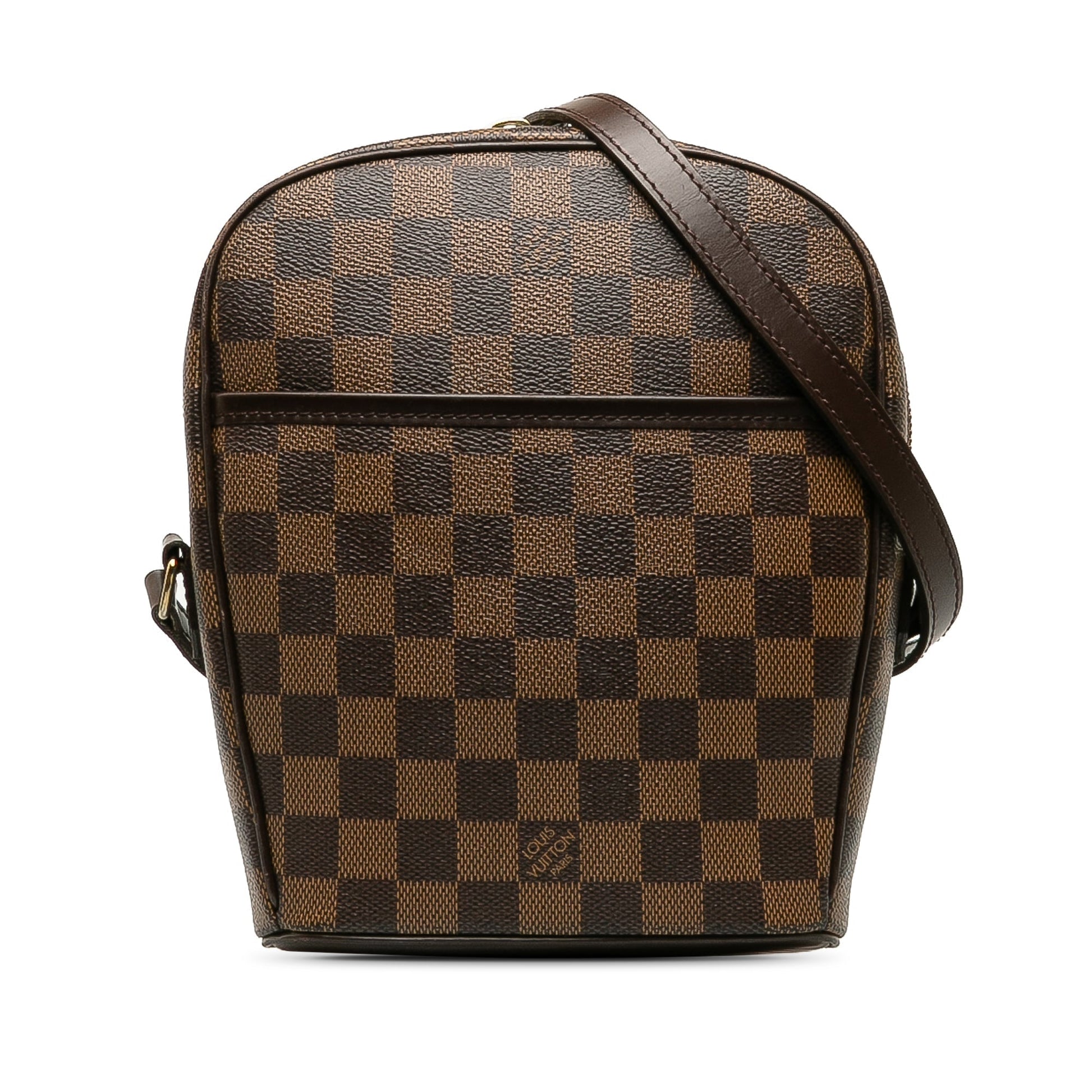 Product Details: Brown Louis Vuitton Damier Ebene Ipanema PM Crossbody Bag. The Ipanema PM features a damier ebene canvas body, a flat leather strap, a top zip closure, a front exterior slip pocket, and an interior slip pocket. 8.7" L x 7.9" W x 3.1" D. Serial number -.