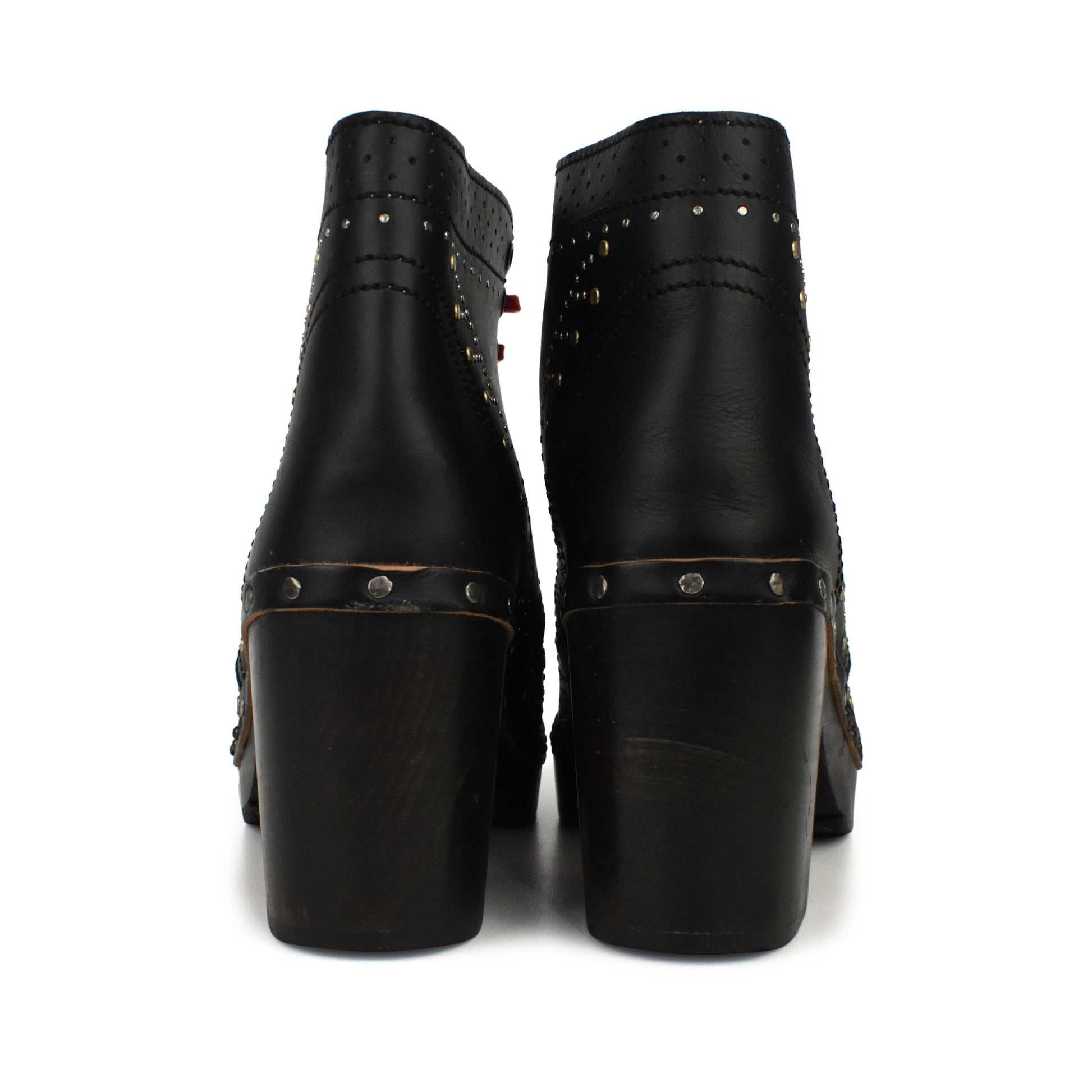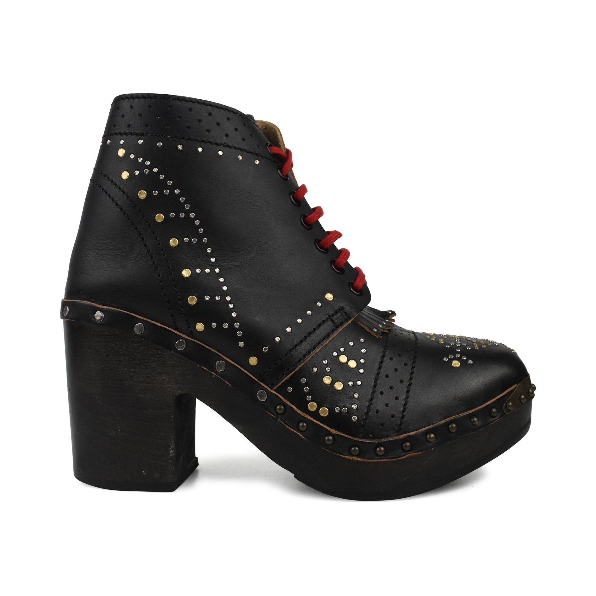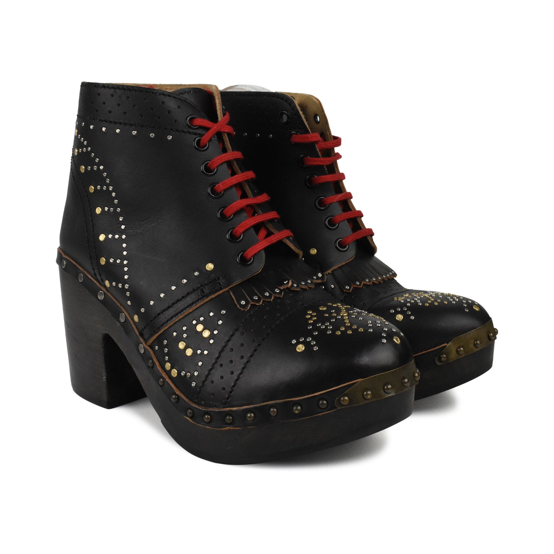 Burberry ankle booties in black leather with a wooden block heel and sole. Features silver and gold stud hardware design throughout, leather fringe at the toes, aged brass hardware studs along the sole, perforated leather details, and red flat laces.
