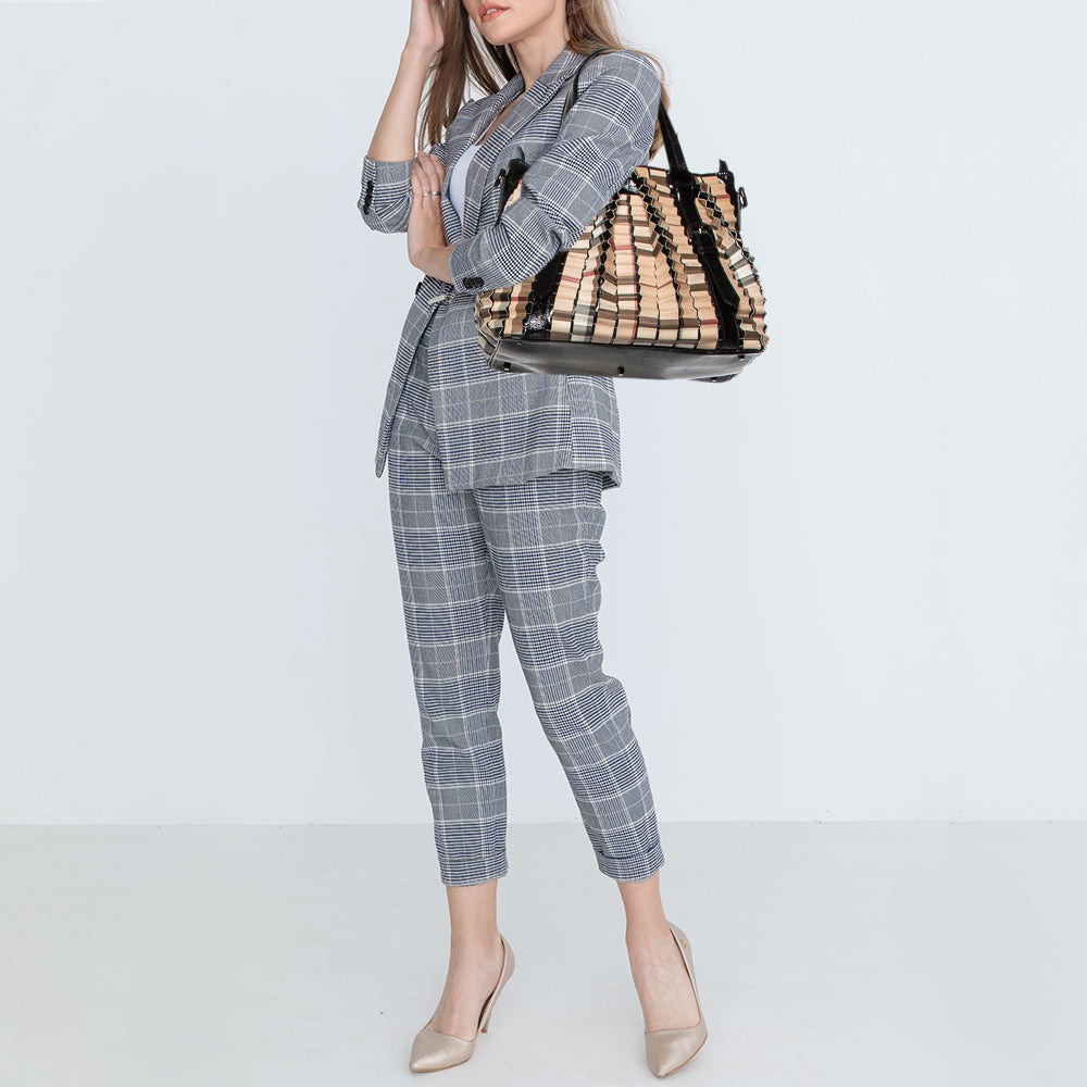 Burberry Black/Beige House Check PVC and Patent Leather Lowry Ruffled Tote