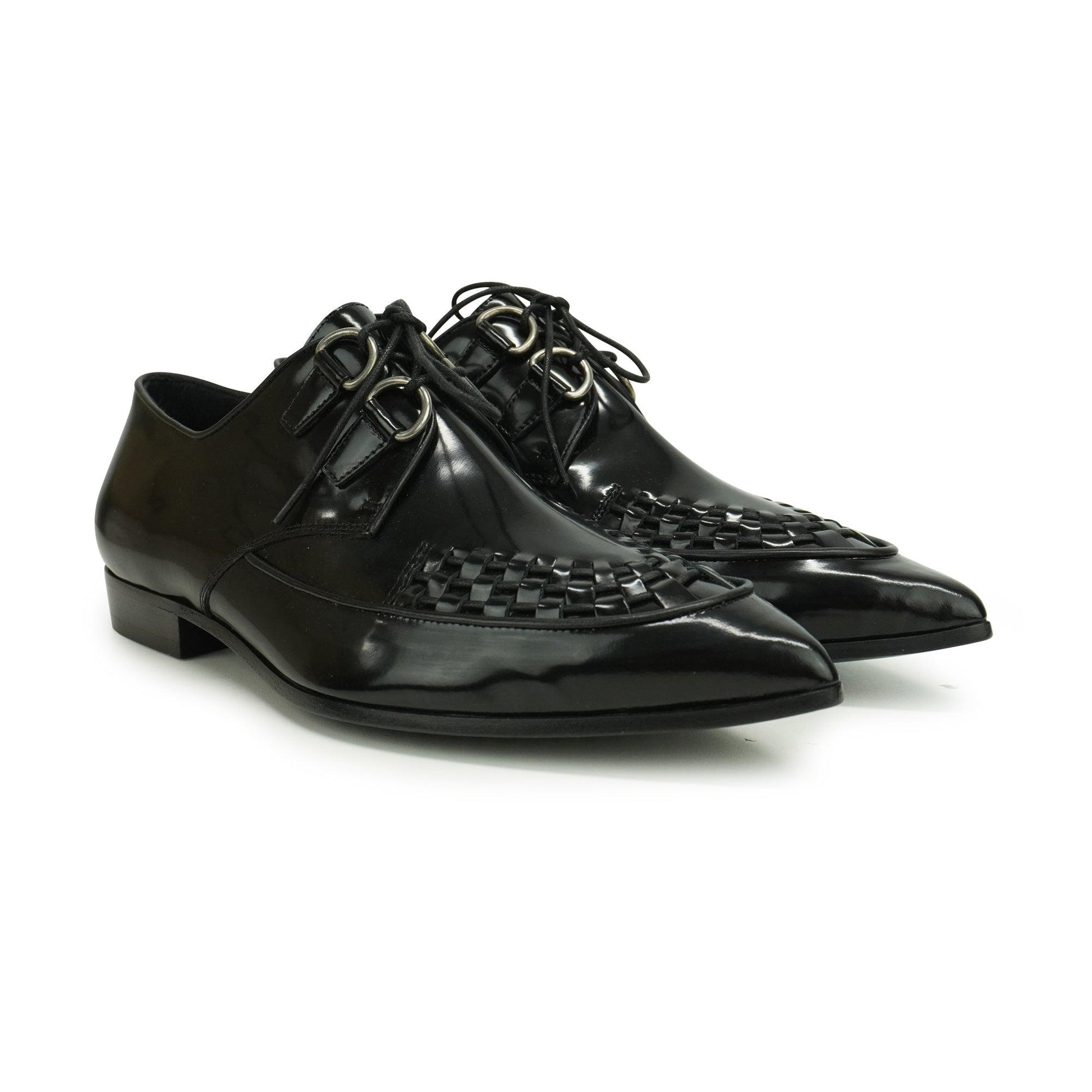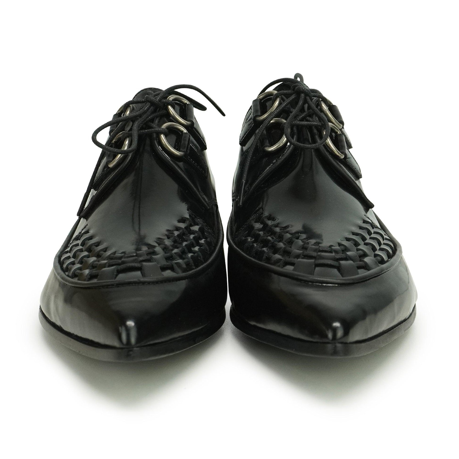 Burberry 'Brooker' loafers in black patent leather with a pointed toe, silver o-ring hardware, and a woven chord detail around the toe.
