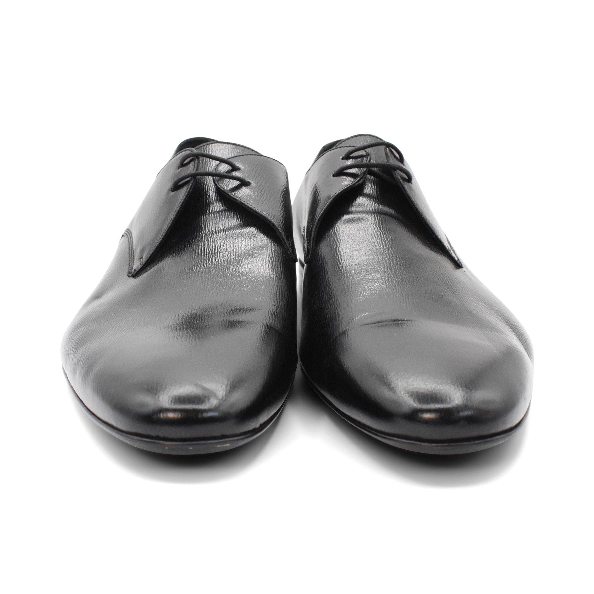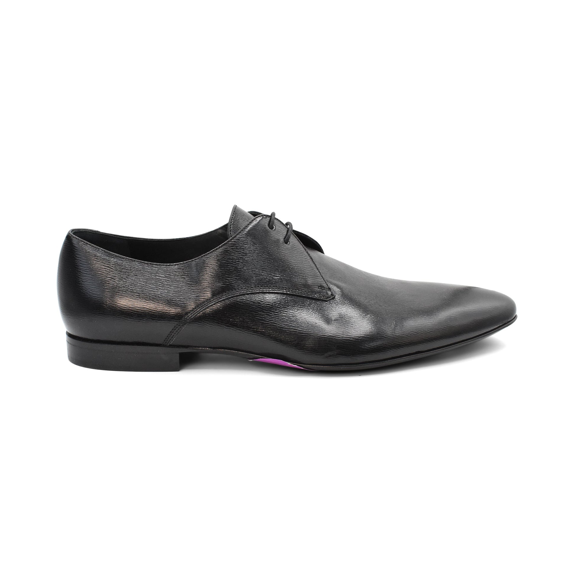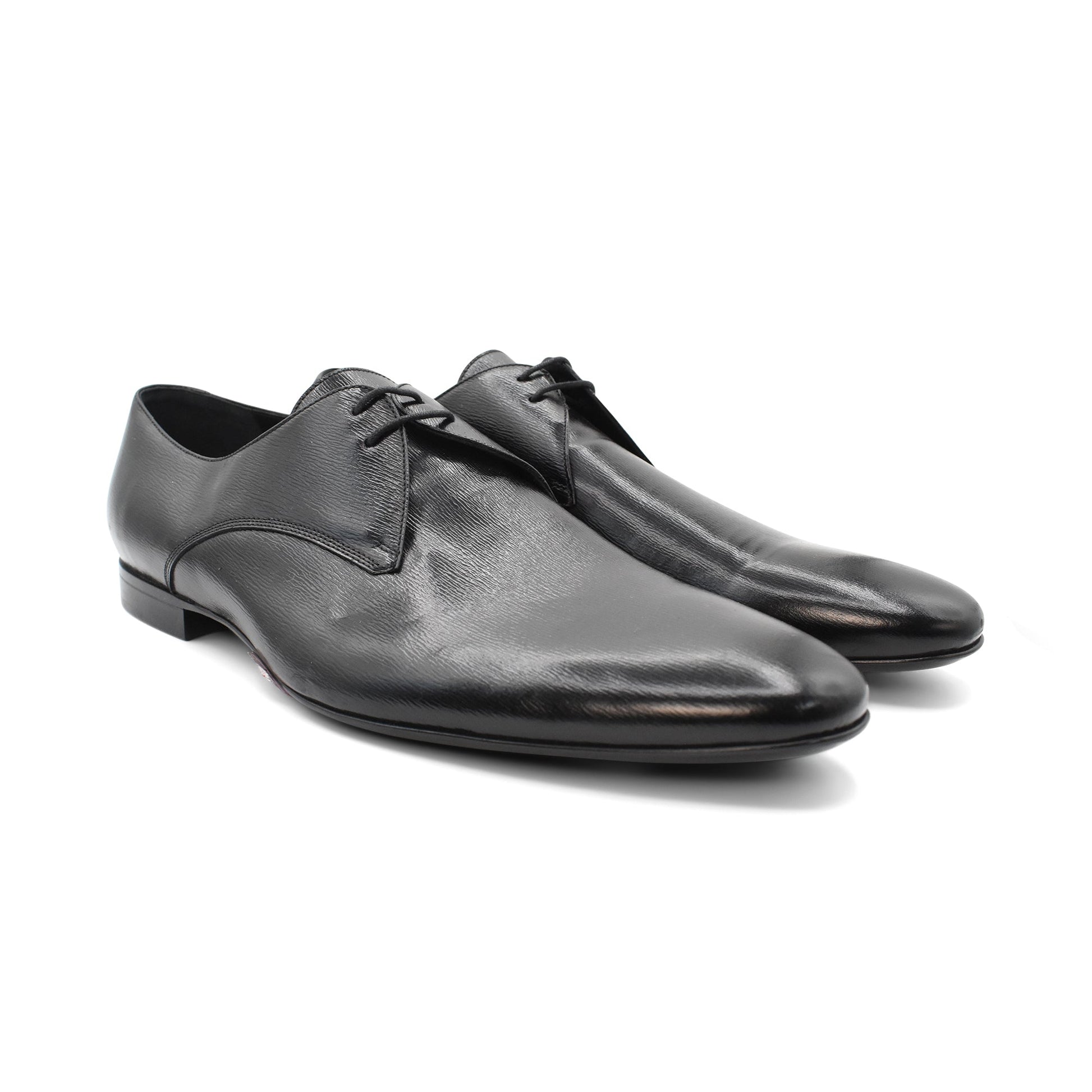 Burberry derby dress shoes in black grained stripe leather with a top lace-up closure and a long toe-box.