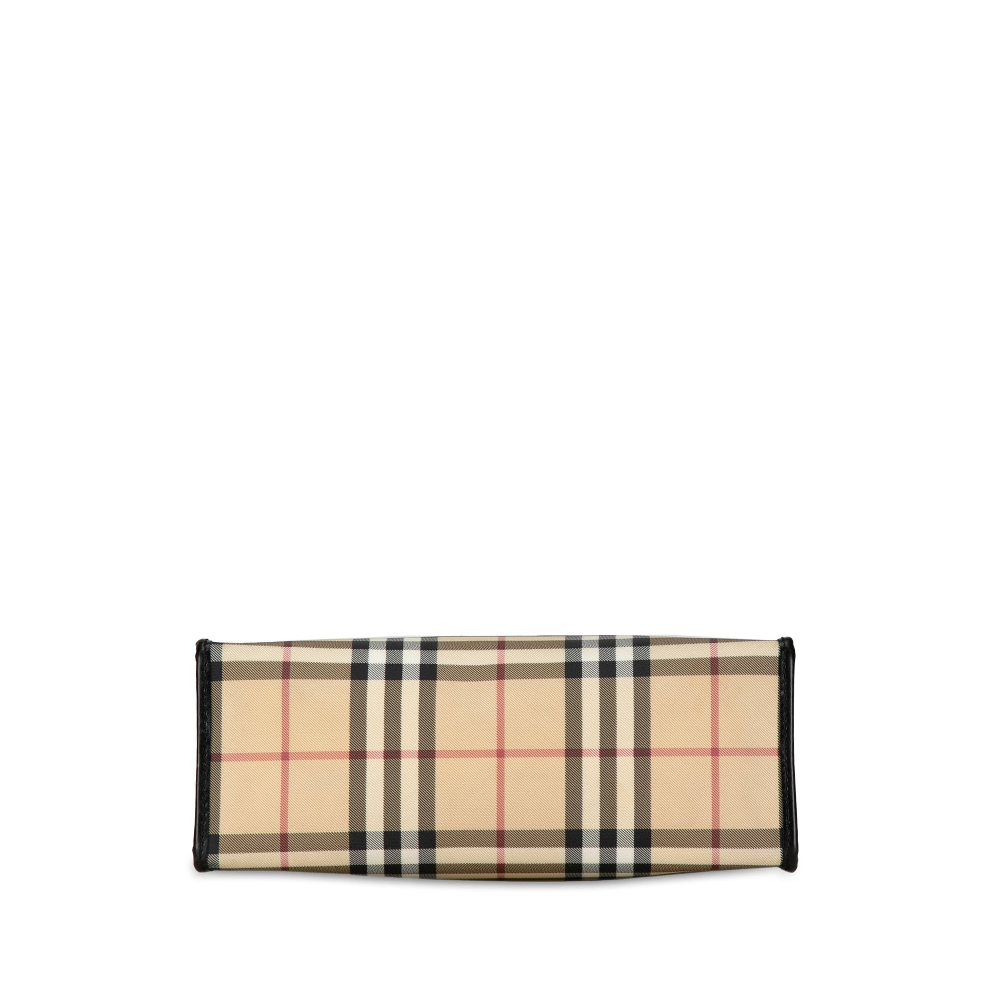 This tote Bag features a canvas body with leather trim, flat leather handles, an open top with magnetic closure, and an interior zip pocket.