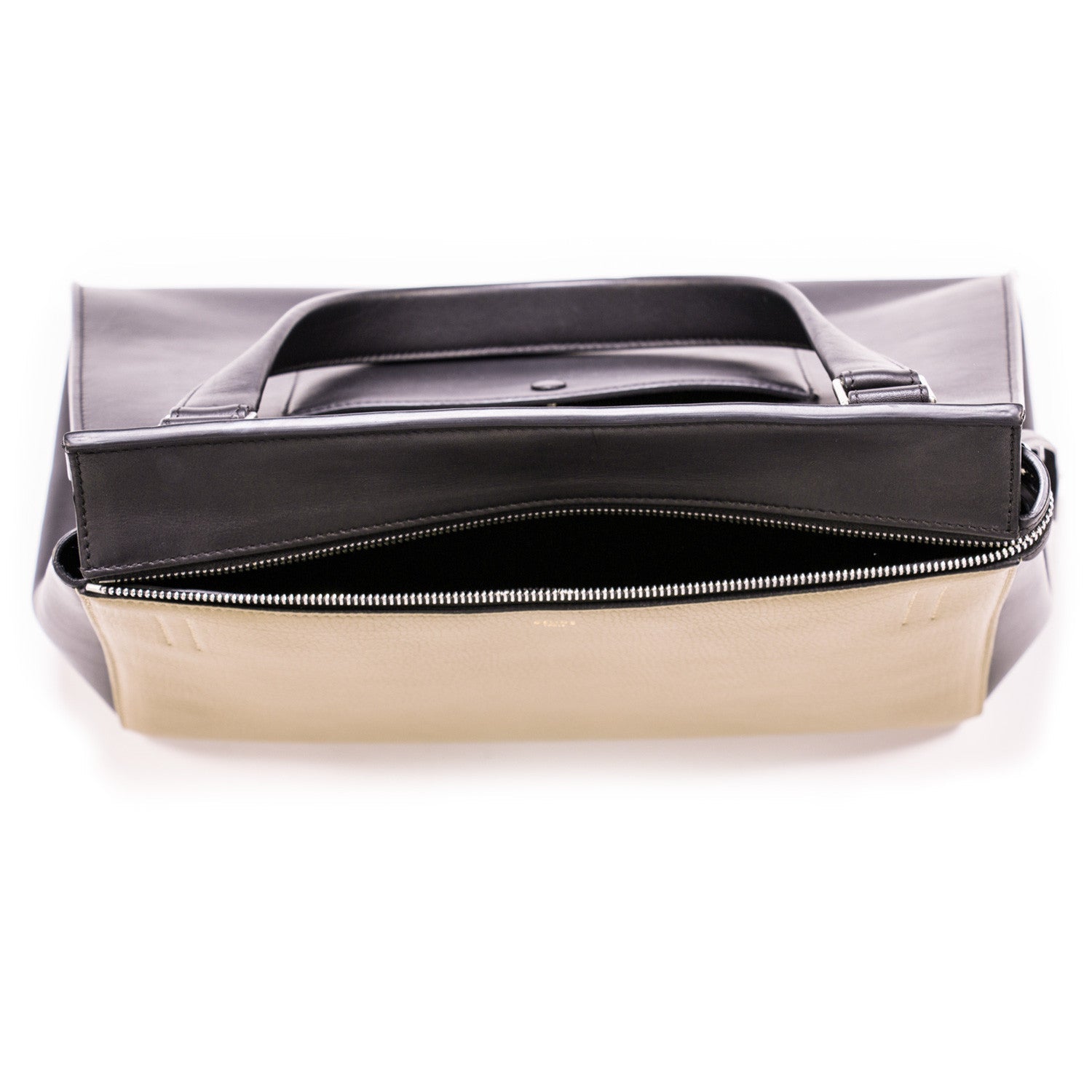 Details: Black and Beige Calf Leather / Silver Tone Hardware / Single Flat Shoulder Strap / Single Back Pocket With Snap Closure / Black Leather Interior Lining / Dual Pockets at Interior Walls / Single Interior Zipper Pocket / Zip Closure at Top