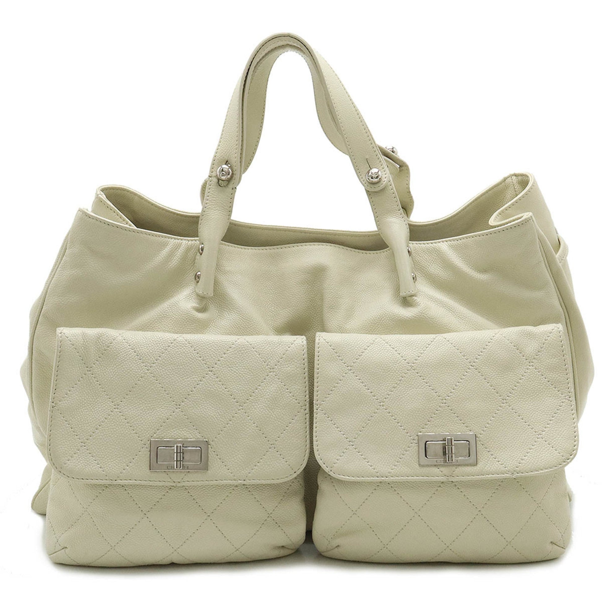 CHANEL 2.55 Matelasse Tote Bag Handbag Turnlock Caviar Skin Leather Ivory White