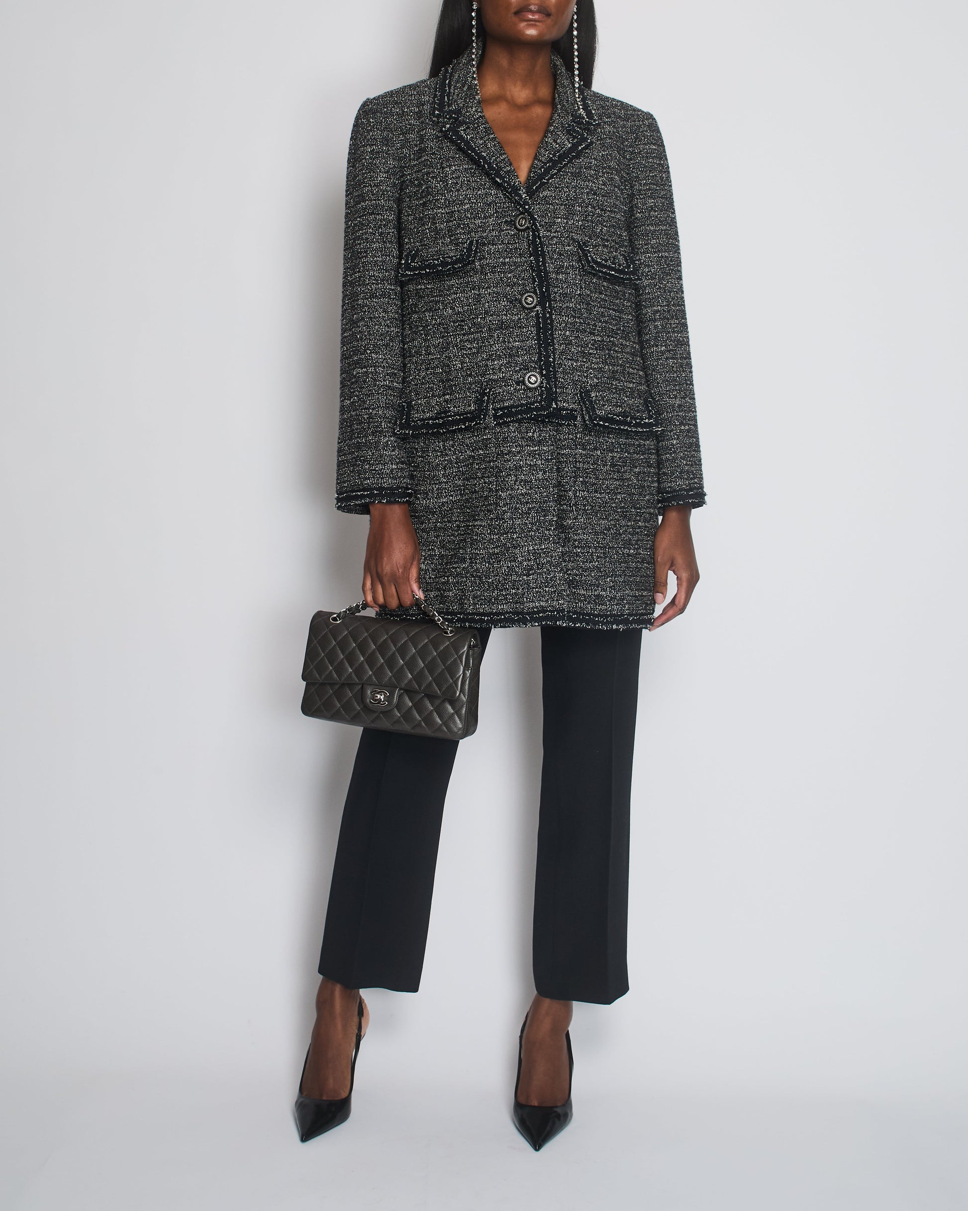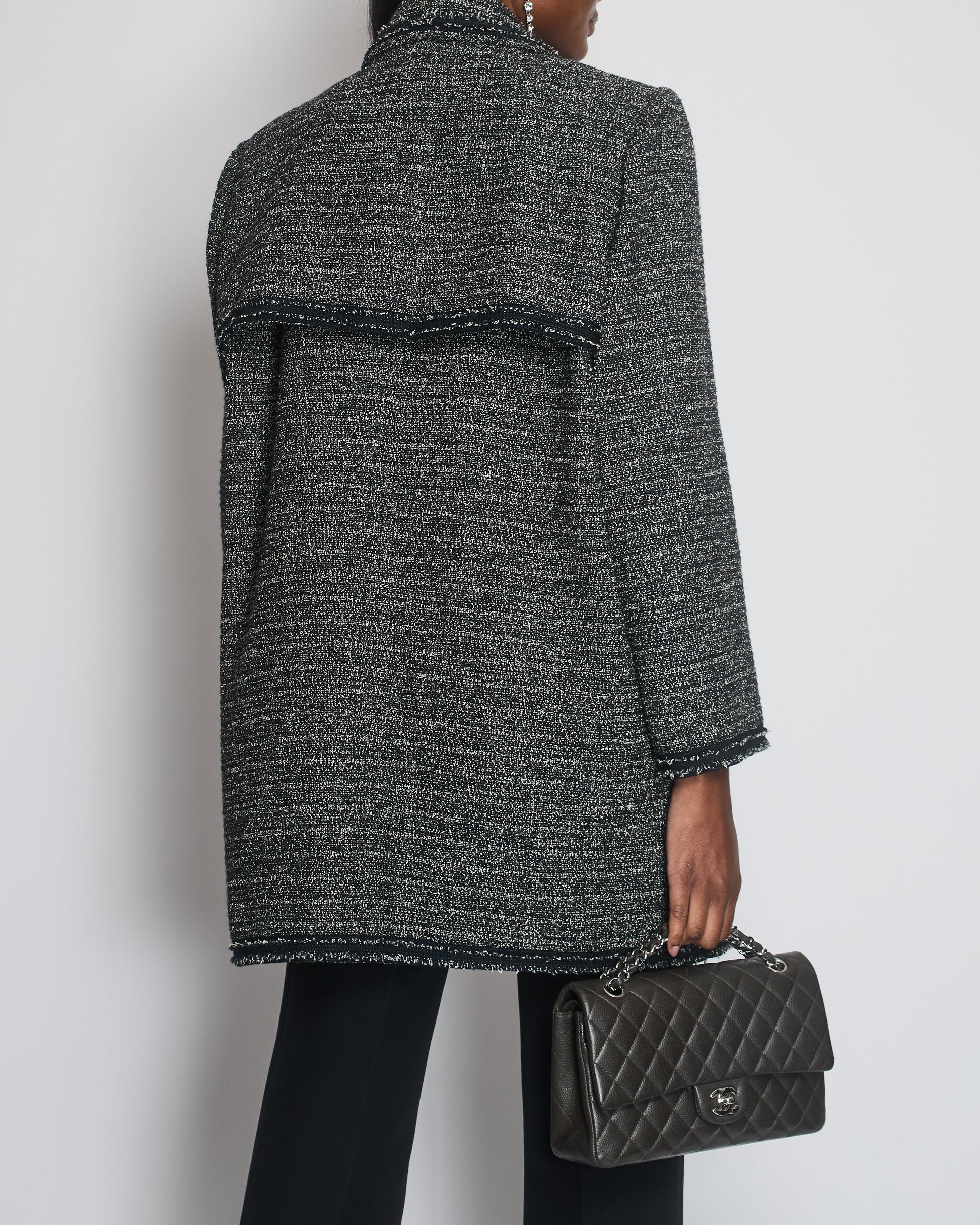 Chanel Black and White Tweed Jacket with Blue Stitched Trims & Ruthenium CC Logo Button Details Size FR 46 (UK 18)