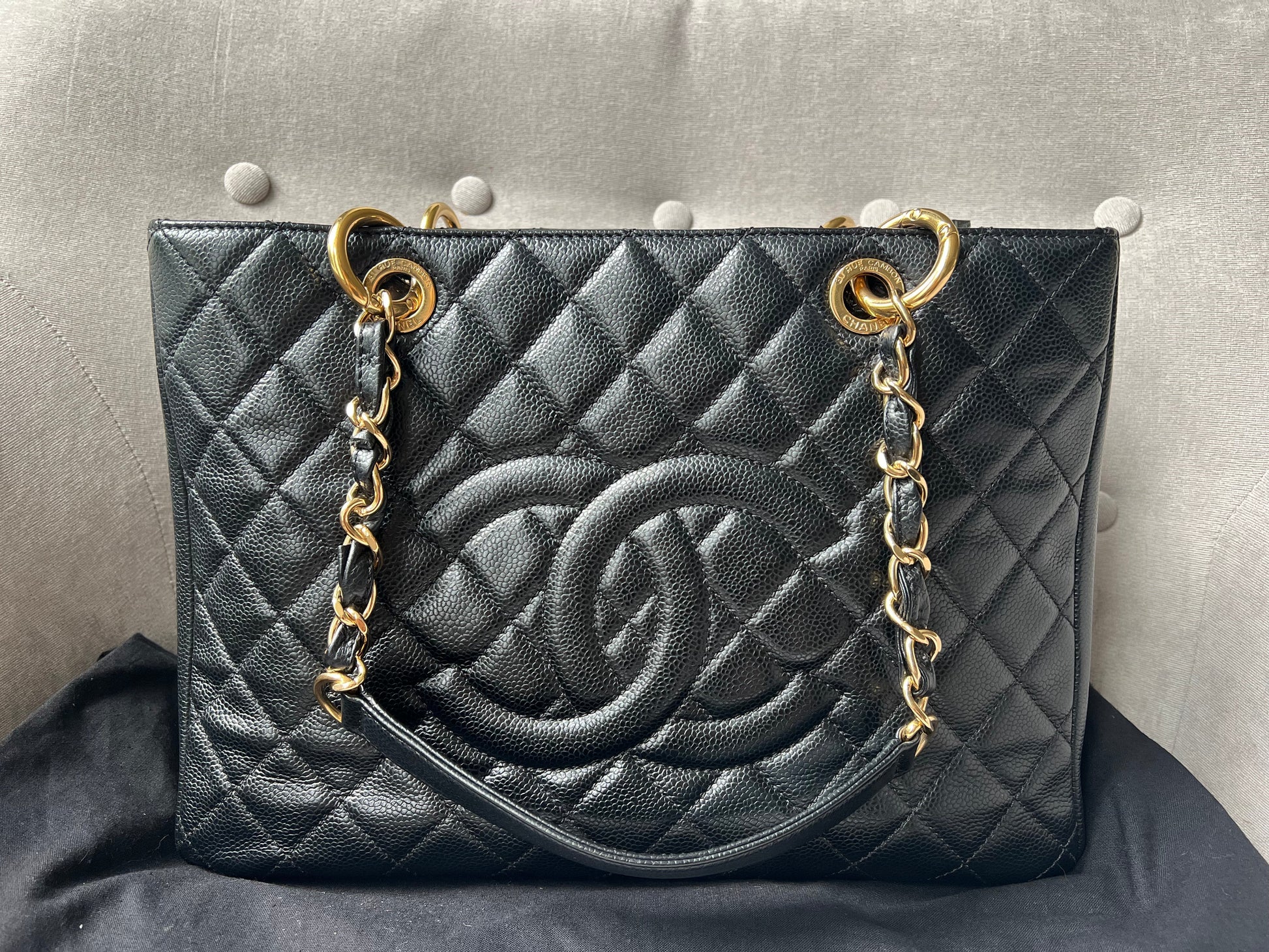 Chanel Grand Shopper Tote (GST) in Black Caviar Leather with gold hardware. This very popular chain tote is sadly now discontinued and only available to buy . Great opportunity to own a practical, iconic and sophisticated Chanel bag without the same price tag as the classic flap styles. Perfect for day or evening use and the caviar leather is very resilient and durable. Can be carried in the crook of the arm or over shoulder using the chain straps.