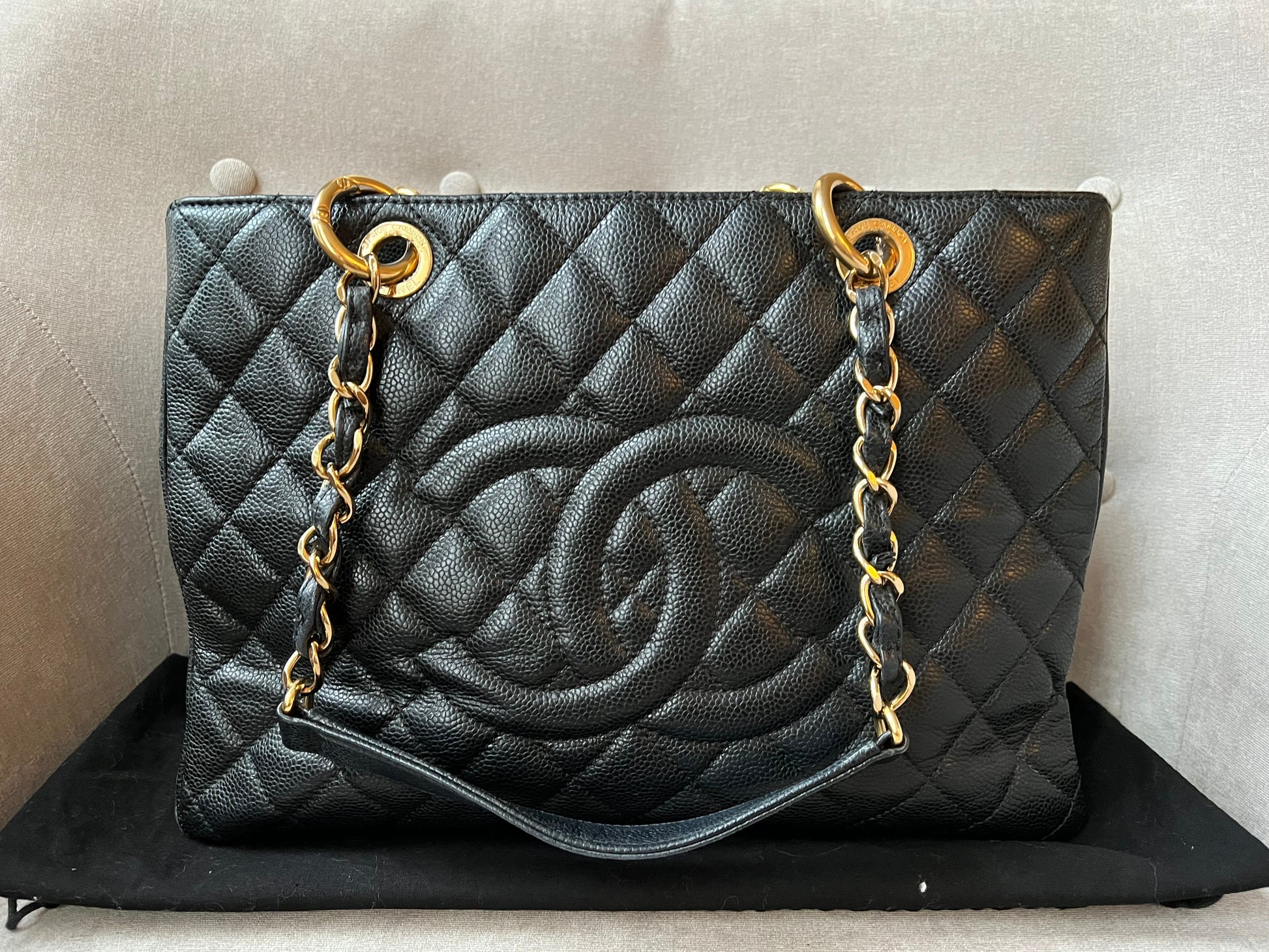 Chanel Grand Shopper Tote (GST) in Black Caviar Leather with gold hardware. This very popular chain tote is sadly now discontinued and only available to buy . Great opportunity to own a practical, iconic and sophisticated Chanel bag without the same price tag as the classic flap styles. Perfect for day or evening use and the caviar leather is very resilient and durable. Can be carried in the crook of the arm or over shoulder using the chain straps.