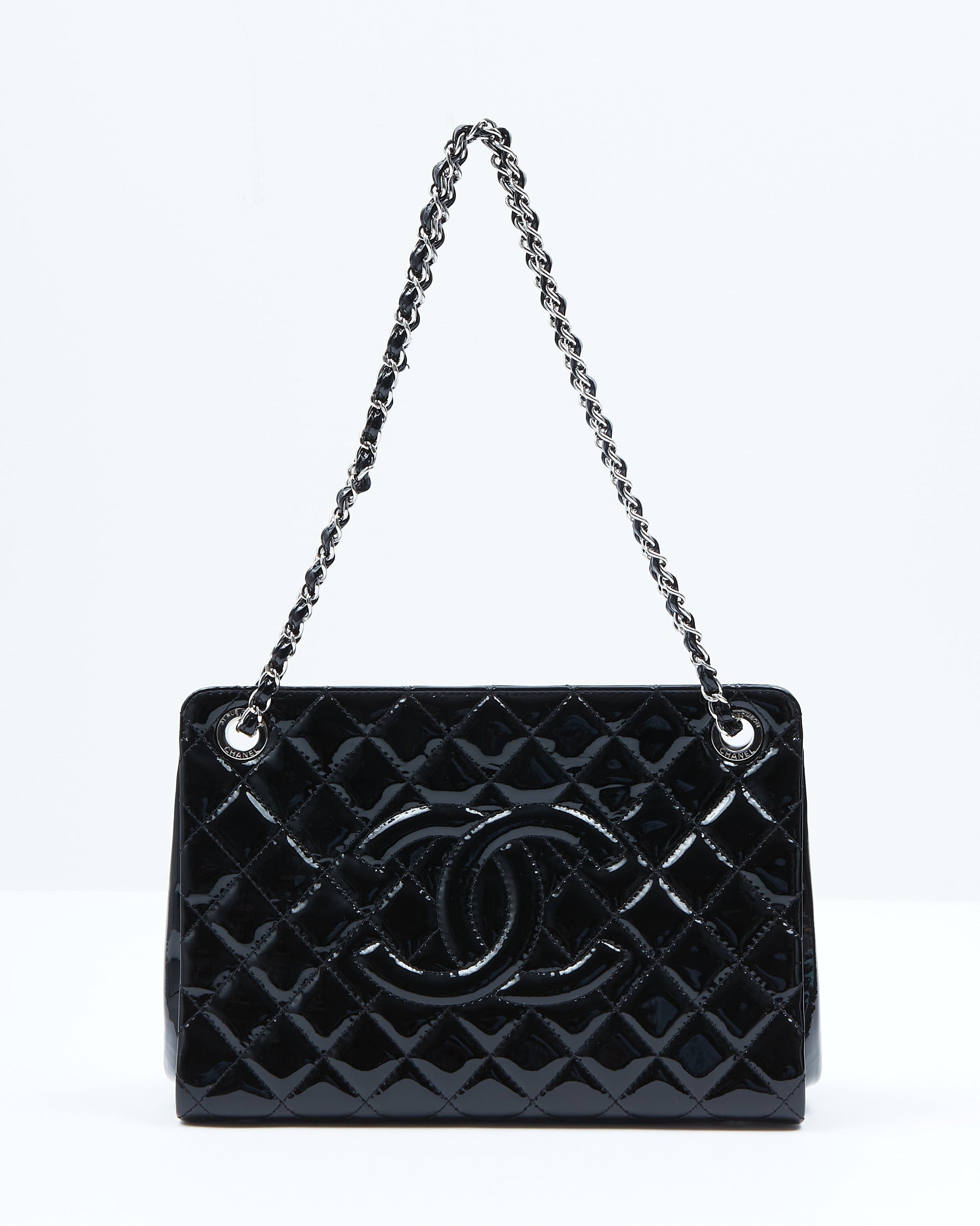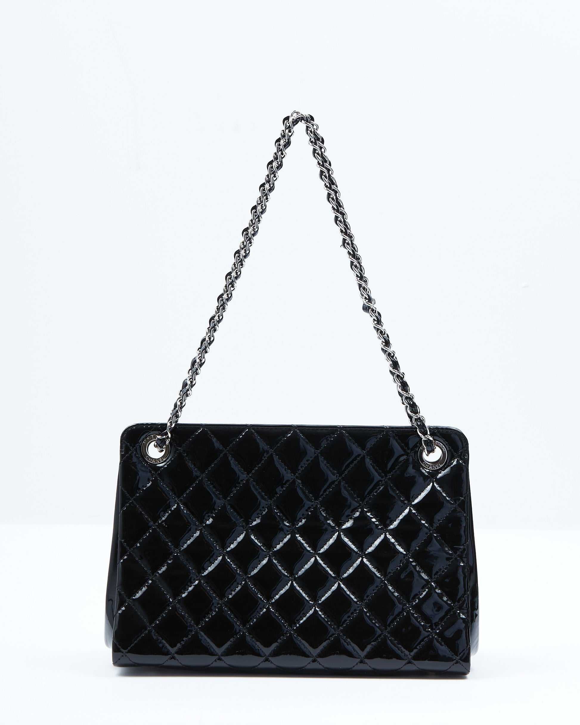 Chanel Black Patent Quilted CC Timeless Shopper Tote Chain Bag
