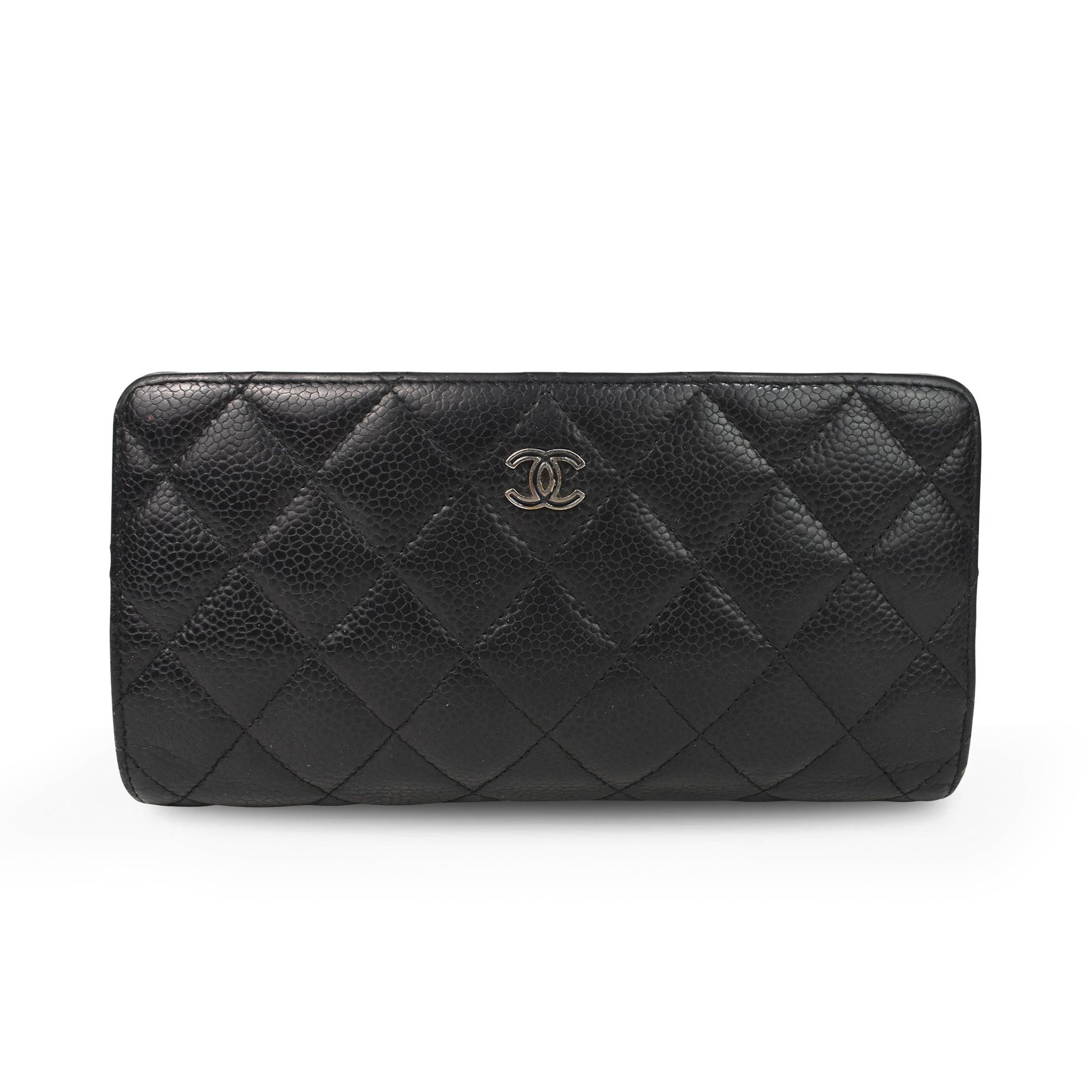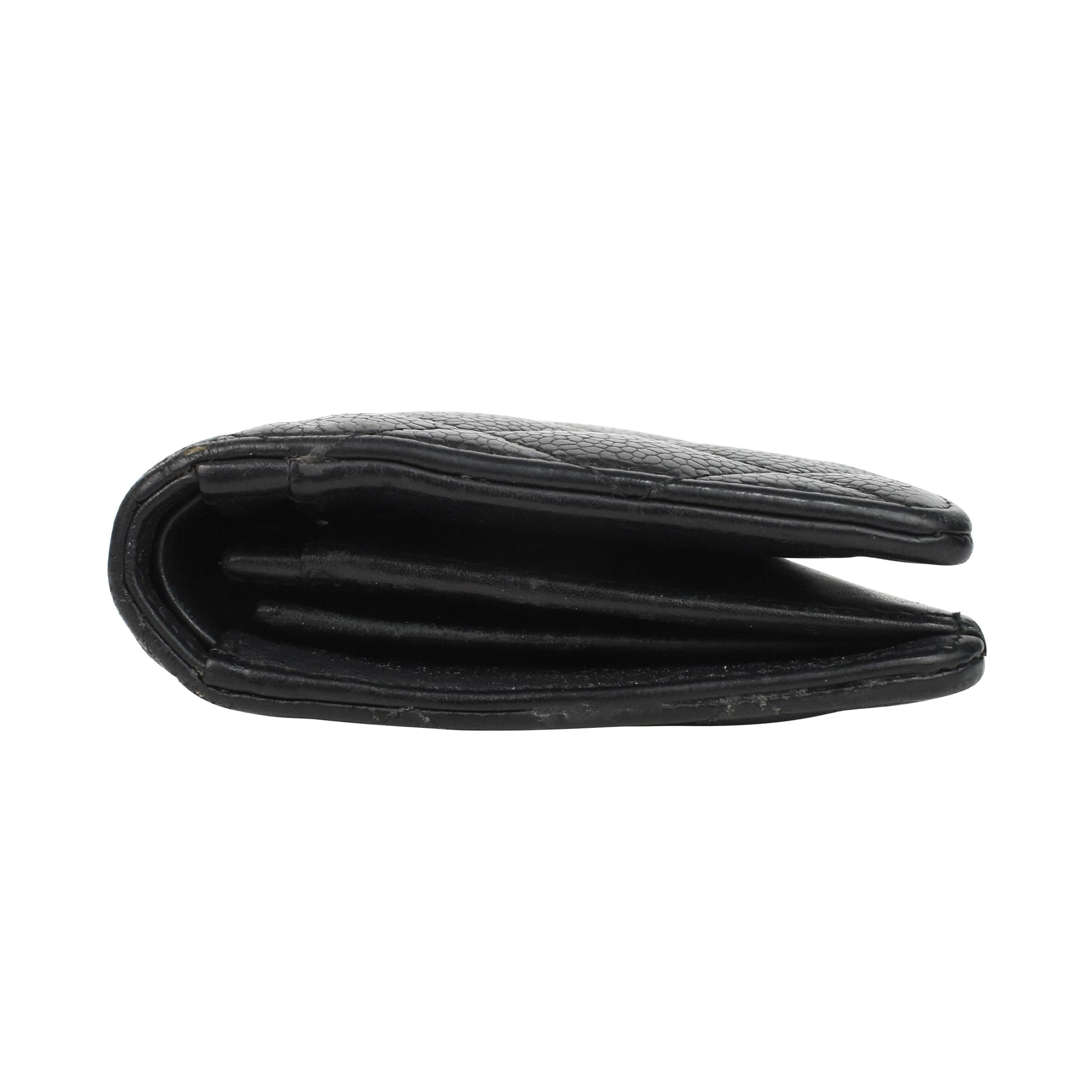 Chanel bi-fold wallet in black quilted caviar leather with a CC logo plaque in silver hardware. Features multiple card slots, a zip pouch with cash slots, and an inner zip pocket.
