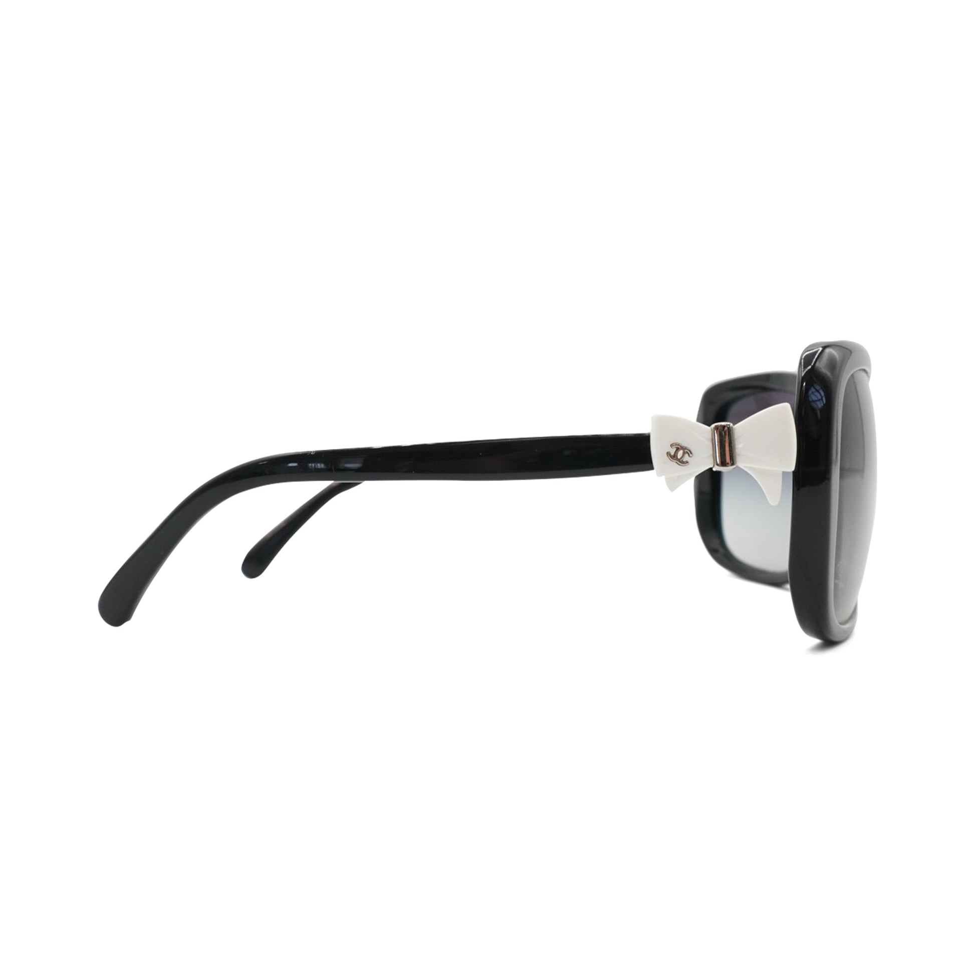 Chanel oversized black sunglasses with white bows on the arms featuring silver CC logo hardware.