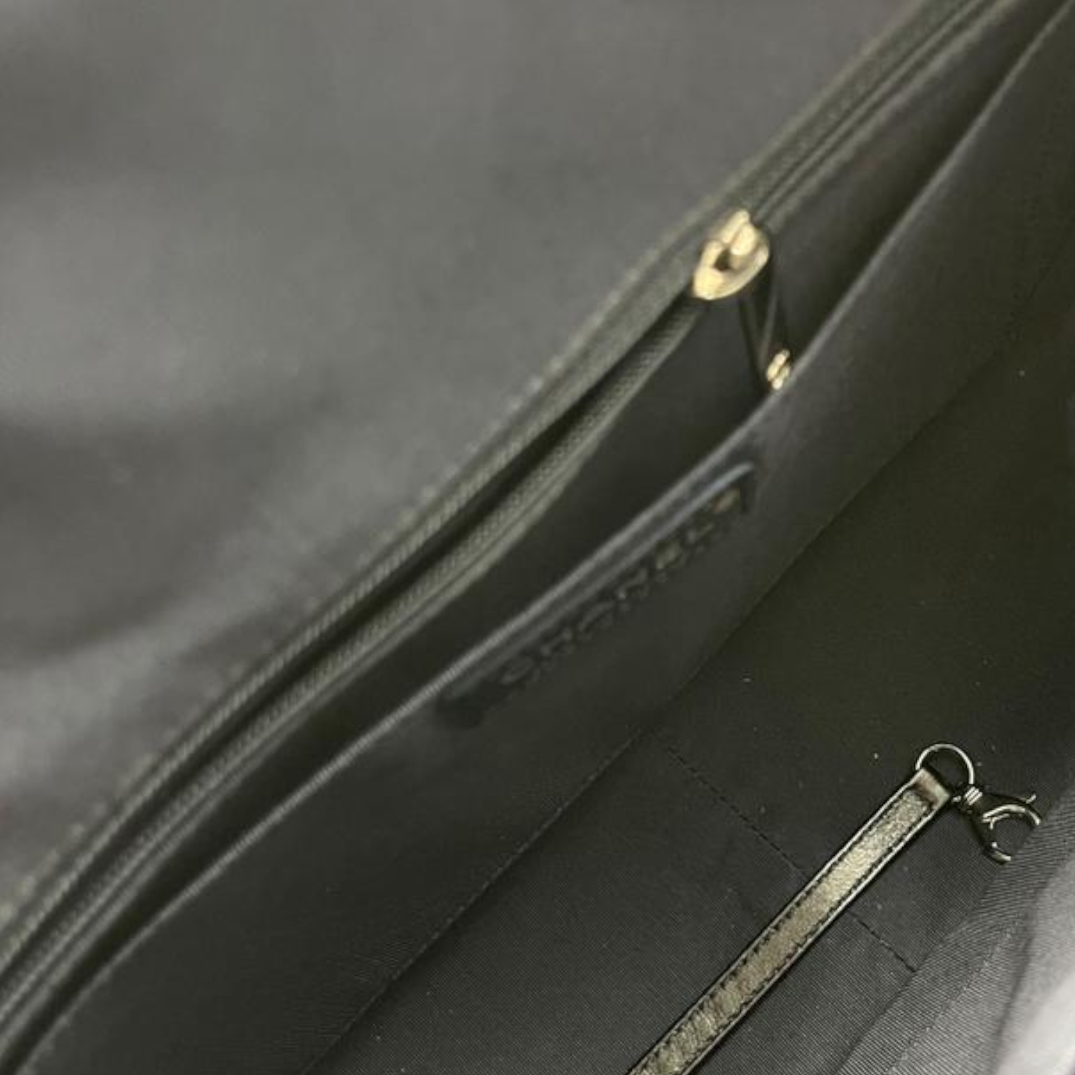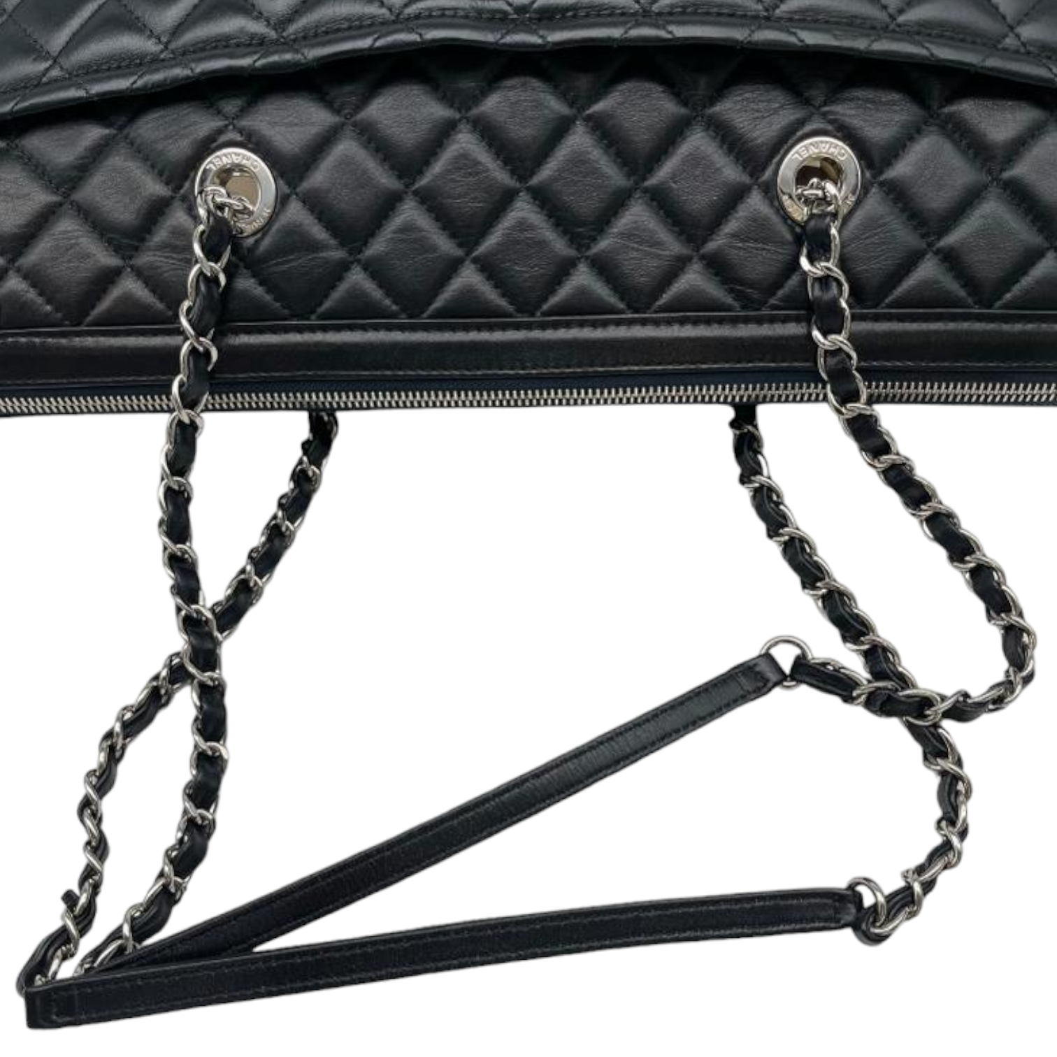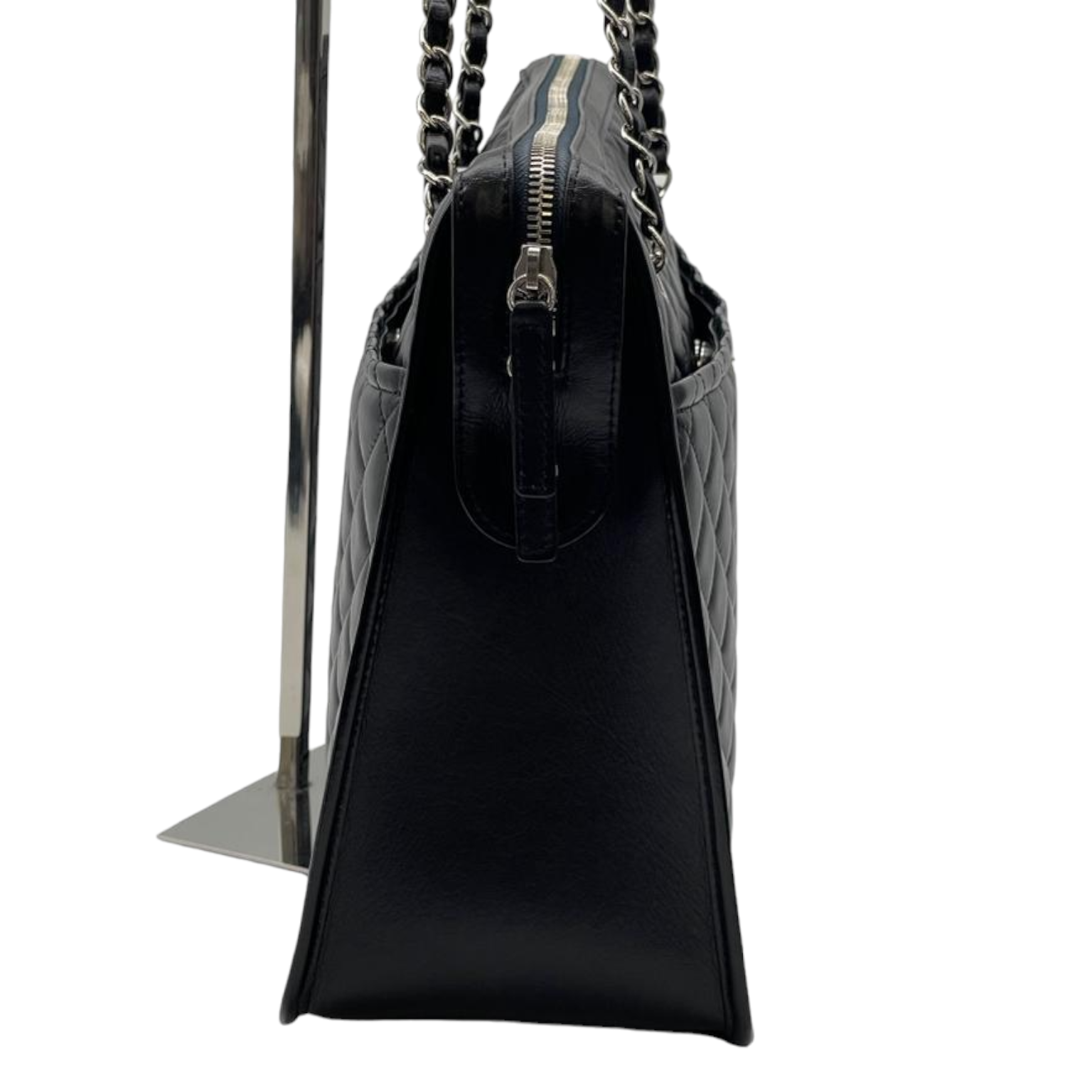 This is an Chanel Calfskin Quilted Large Classic Shopping Tote in Black. This spacious classic tote is made from smooth black leather with a diamond quilt pattern. It comes with silver chain-link shoulder straps, a silver Chanel CC turn-lock on the front, and a roomy back pocket. The top reveals a black fabric interior with convenient pockets.