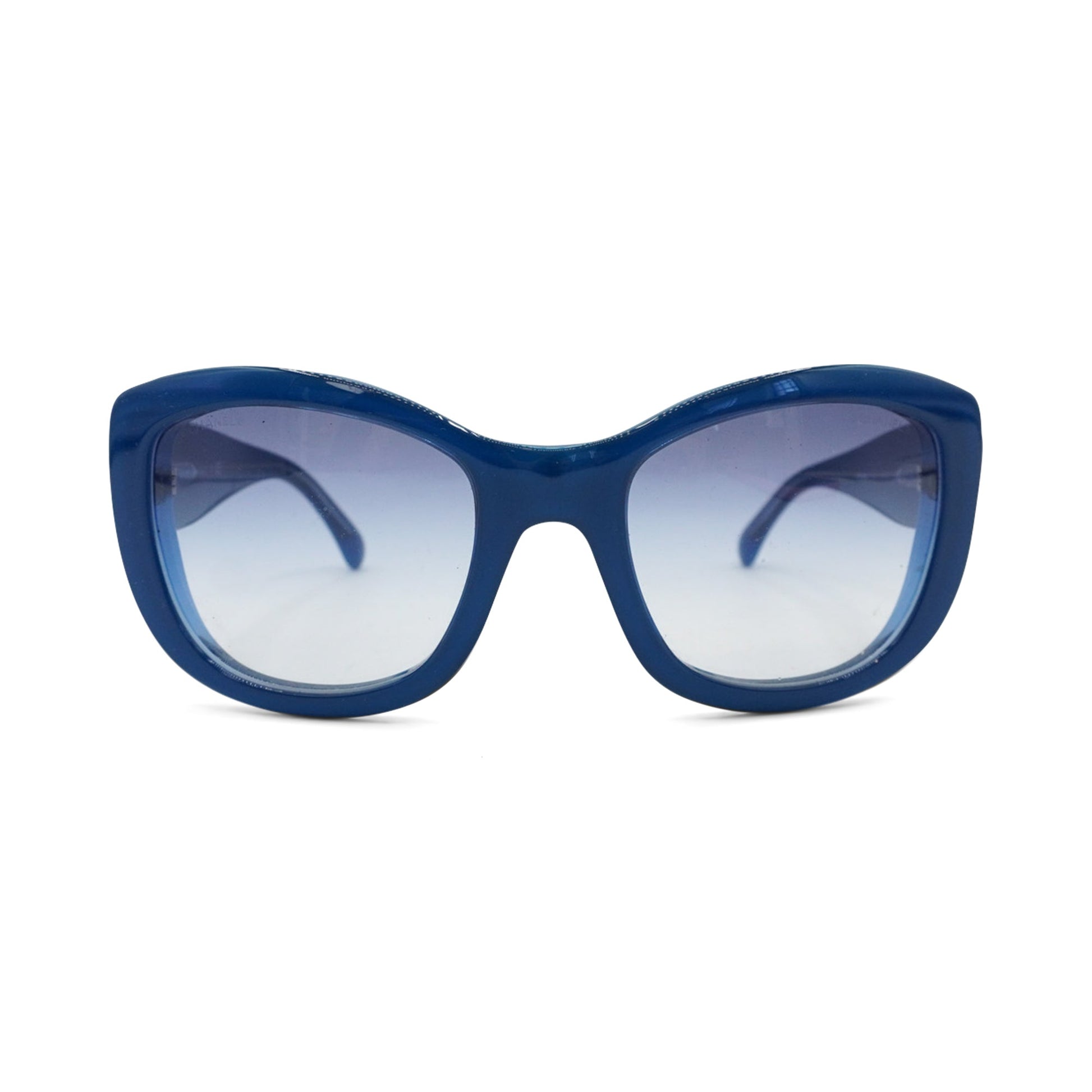 Chanel oversized cat eye sunglasses in blue acetate with silver textured CC logo hardware on the arms.