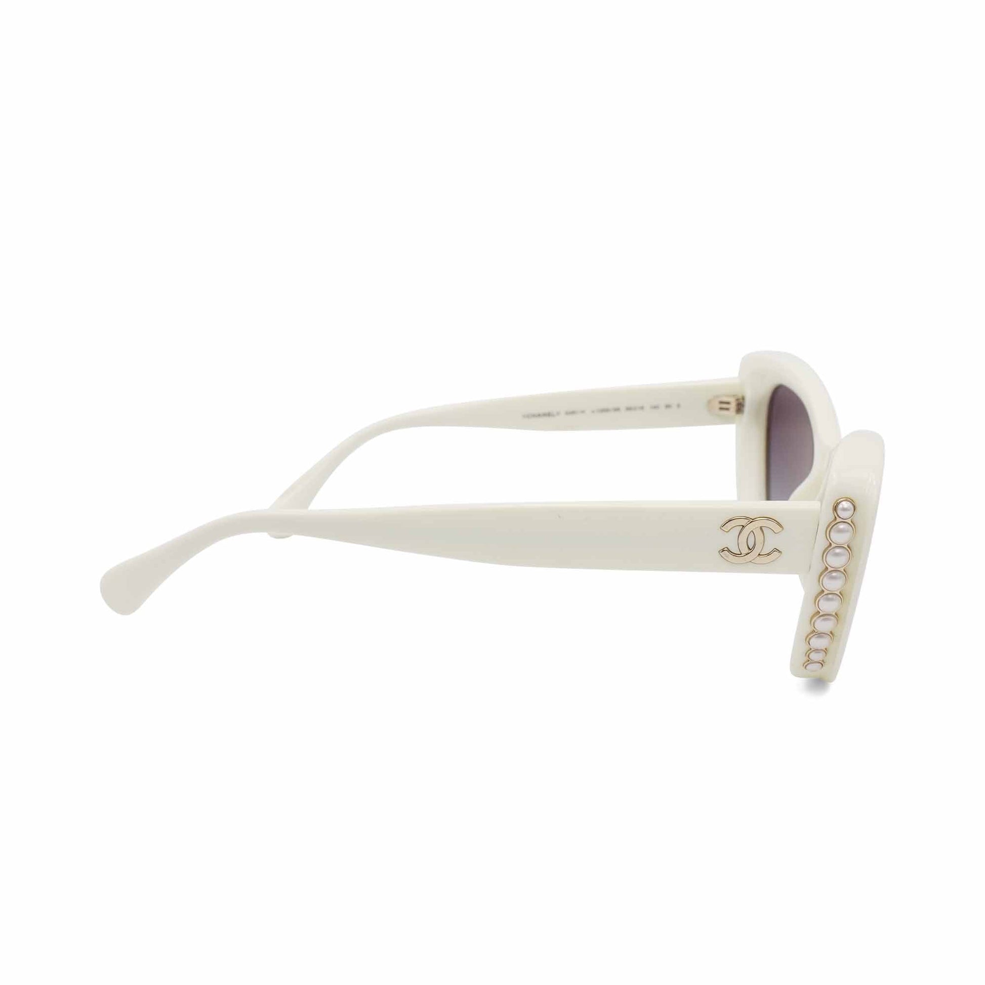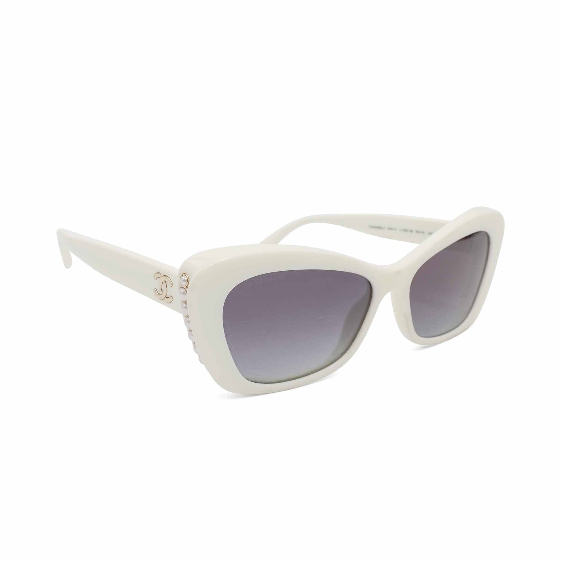 Chanel cat-eye sunglasses in white acetate with angular lenses, a pearl trim along the sides of the frames, and a gold 'CC' logo on the arms.