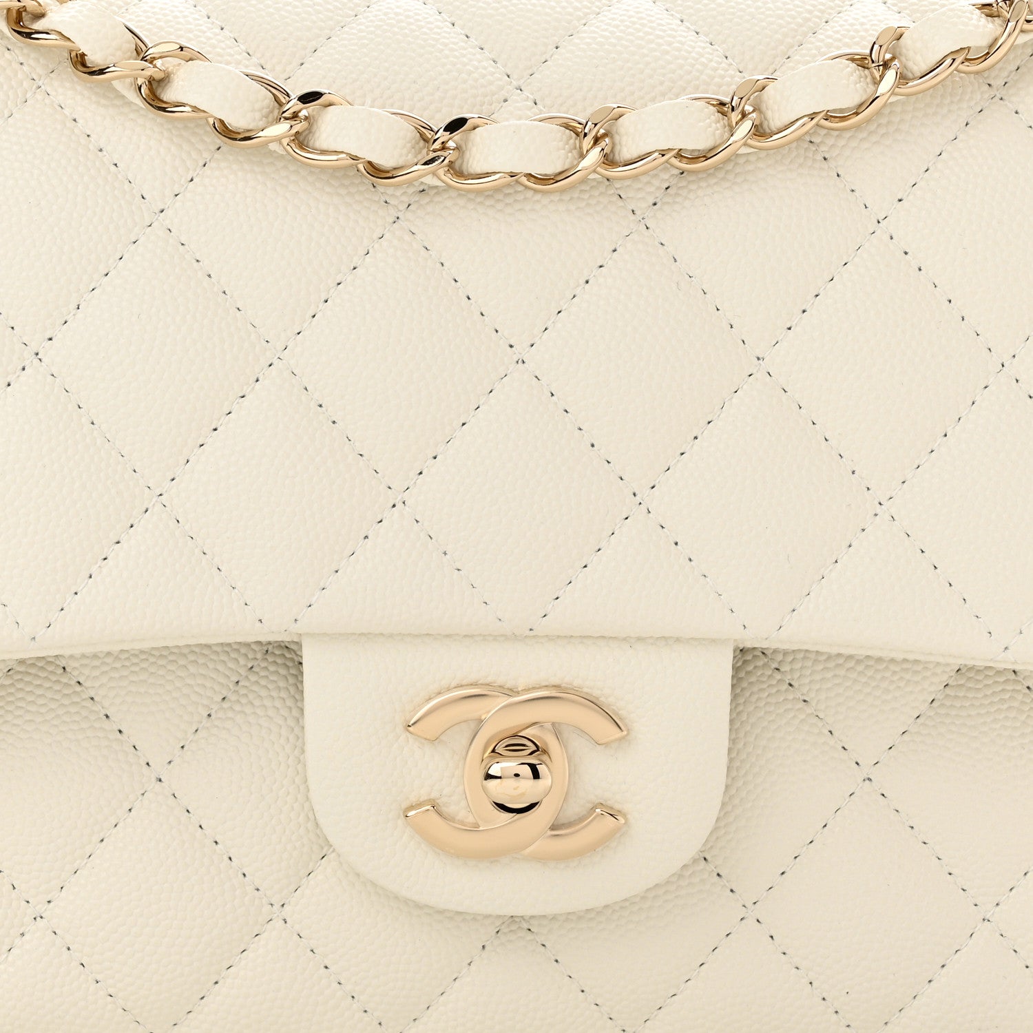 A true Icon of Luxury, the Chanel Classic Double Flap in White Quilted Caviar leather is a rare standout among Chanel’s timeless designs.