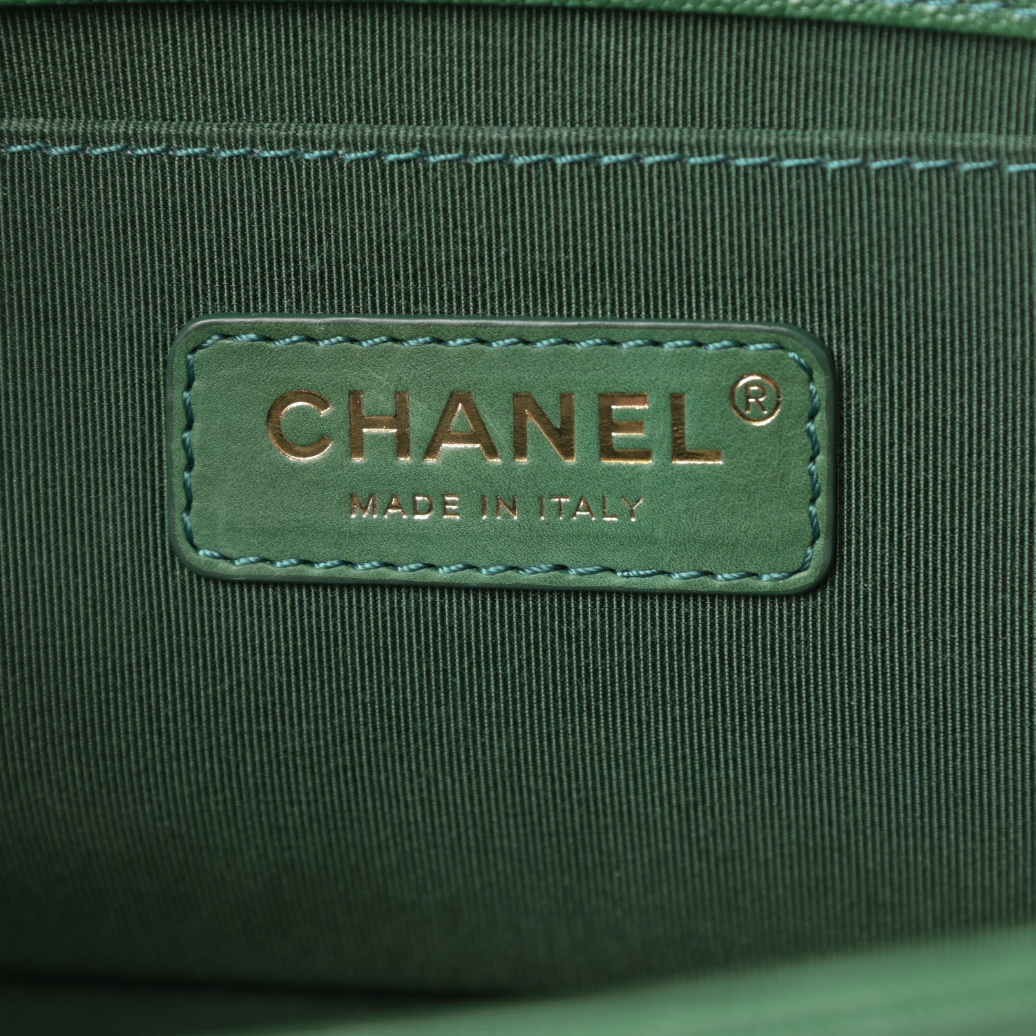 The handbag features a Gold-tone Chain link shoulder strap with a leather shoulder pad and a unique gold Chanel boy CC push lock.