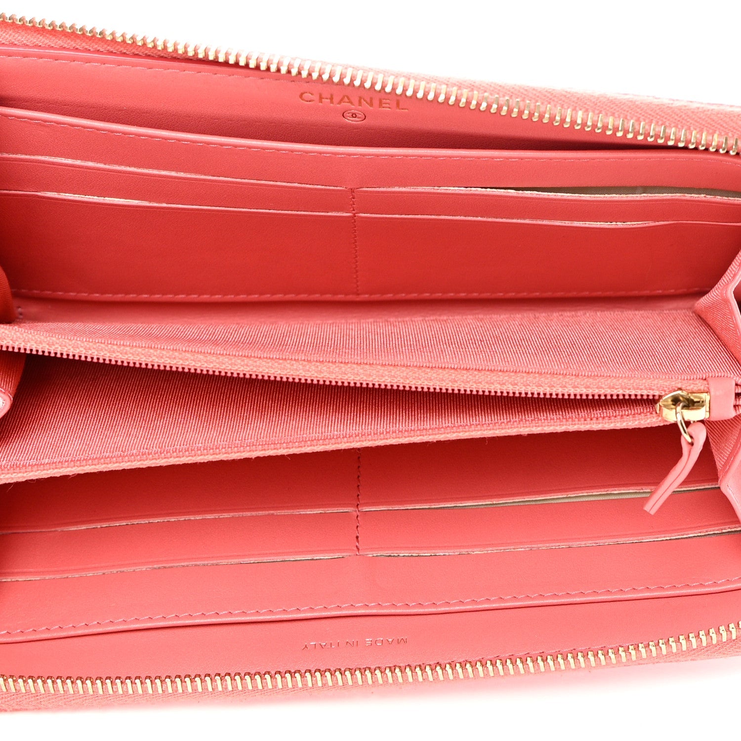 CHANEL Caviar Quilted Zippy Wallet in Pink. This wallet is crafted of soft diamond quilted caviar leather in pink. The wallet features a light gold Chanel CC logo on the front, and a matching polished gold toned wrap-around zipper that opens to a partitioned pink fabric interior.