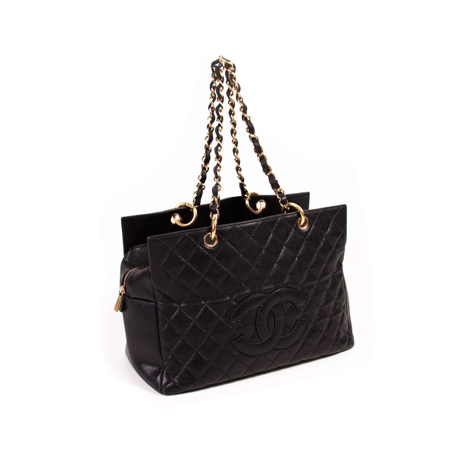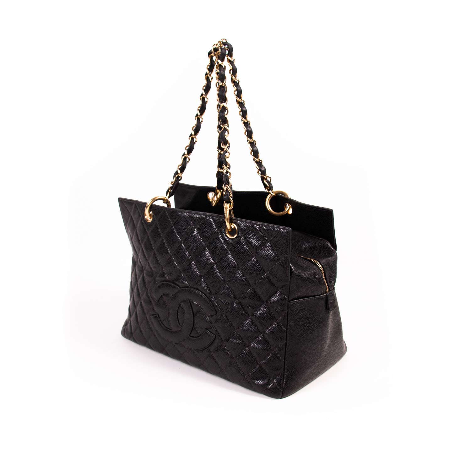 Details: Black Caviar Leather / Gold-Tone Hardware / Dual Rolled Chain-Link Straps / Dual Compartments Separated by a Zipper Compartment / Zipper and Flat Pocket at Inside Wall